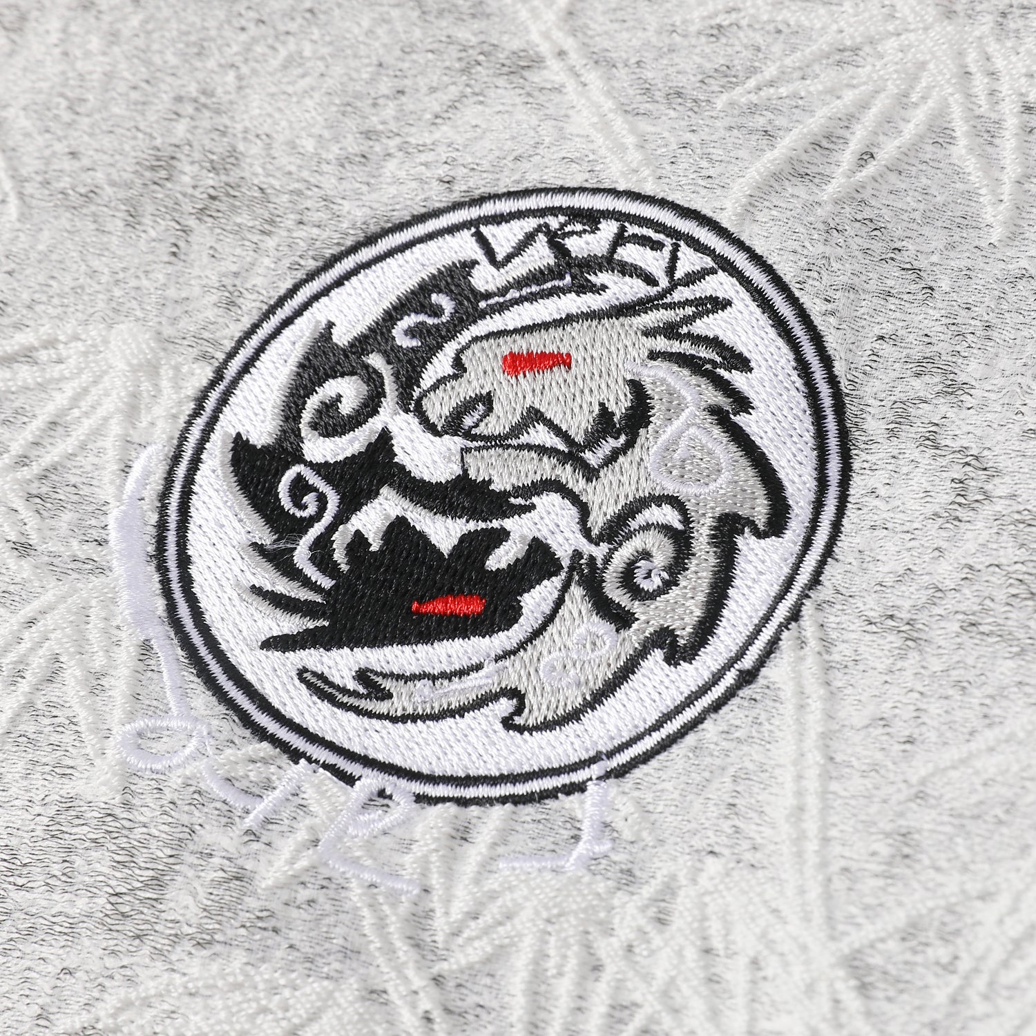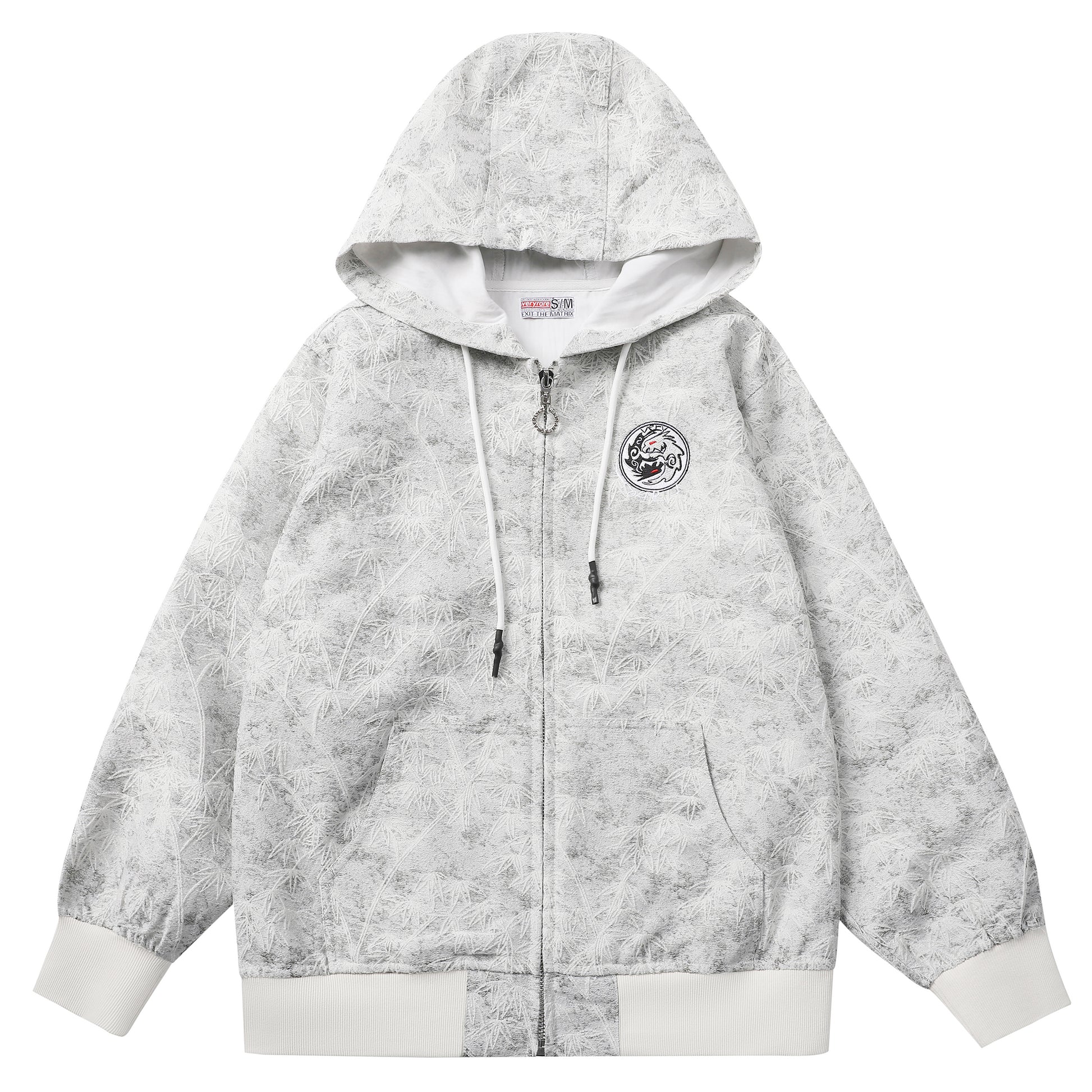 Designed by Raf Reyes: quiet warfare in a mist-grey field with bamboos woven/jacquarded like footprints in fresh snow — soft yet HARD (af) 🎋... the chest crest sits like a clan seal innit :: ᵥred-eyed yin-yangesque dragons in the fog ᵥreminding you this calm is *controlled* ⇄ it’s the uniform for moving unnoticed through loud wVRlds: no flex, no noise, just presence 🎍 zip it up and vanish into the haze 🌀— sooo yeah!! breathe steady, step lighter, and let the storm pass around you 🌪️.