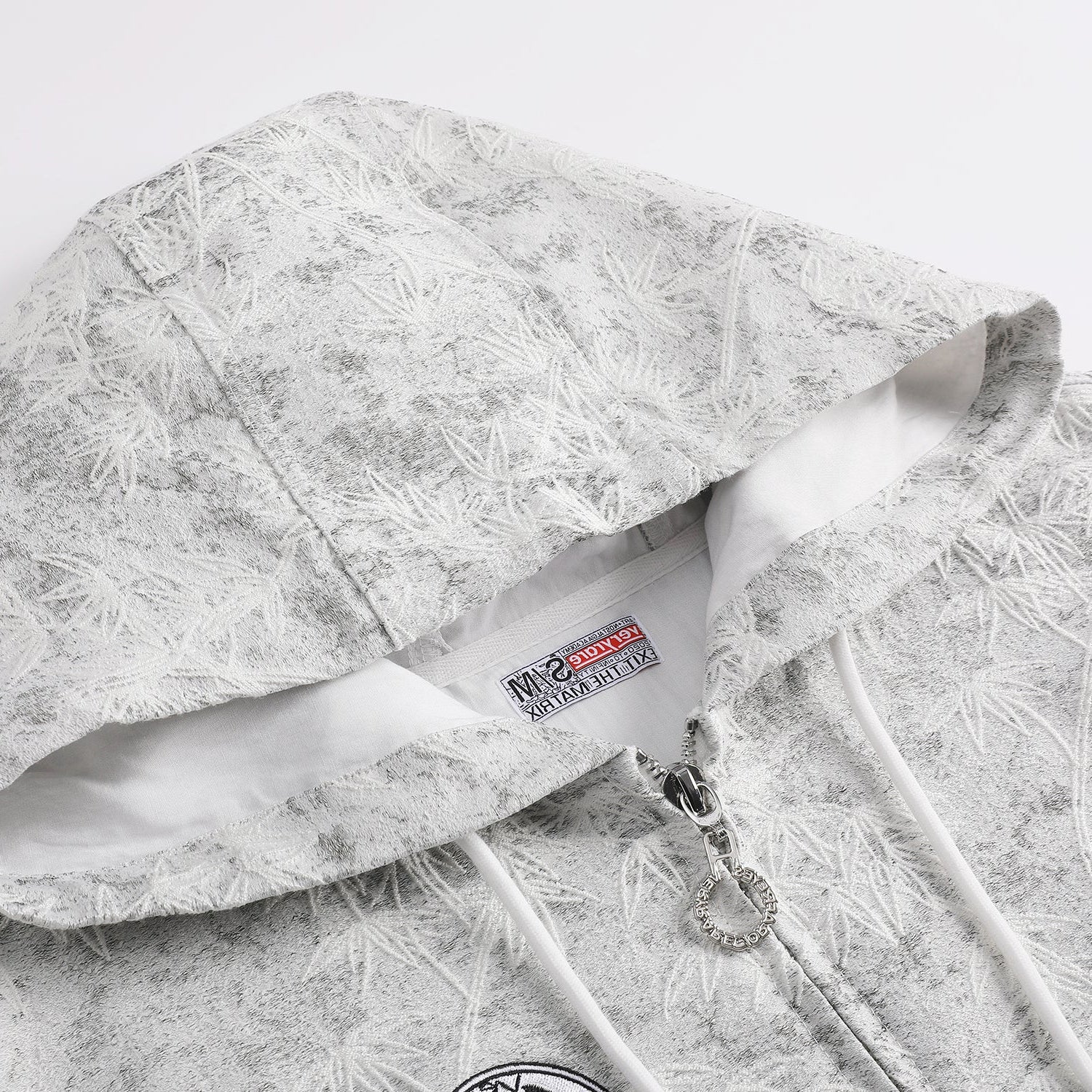 Tech specs: remarkable couture-inspired fil coupé jacquard-woven fabric (63% acrylic, 19% nylon, 18% polyester | | | 420gsm/12oz) ~ VERYRARE "bamboo" motif incorporates a subtle texturing (& softness), while the fabric has been worked & dyed to give a worn-in effect 🪡 [.] kangaroo pockets @ front, embroidery, zip closure, 925 silver circle branded custom-molded puller, 100% cotton lining (inside *fully*), enamel-coated eyelets, tight-knitt’d drawcords (with compression/coated matte tips) | | | 100% wool ribbings @ bottom & sleeves | | | this piece can be worn with matching pants for a total look 👖.
