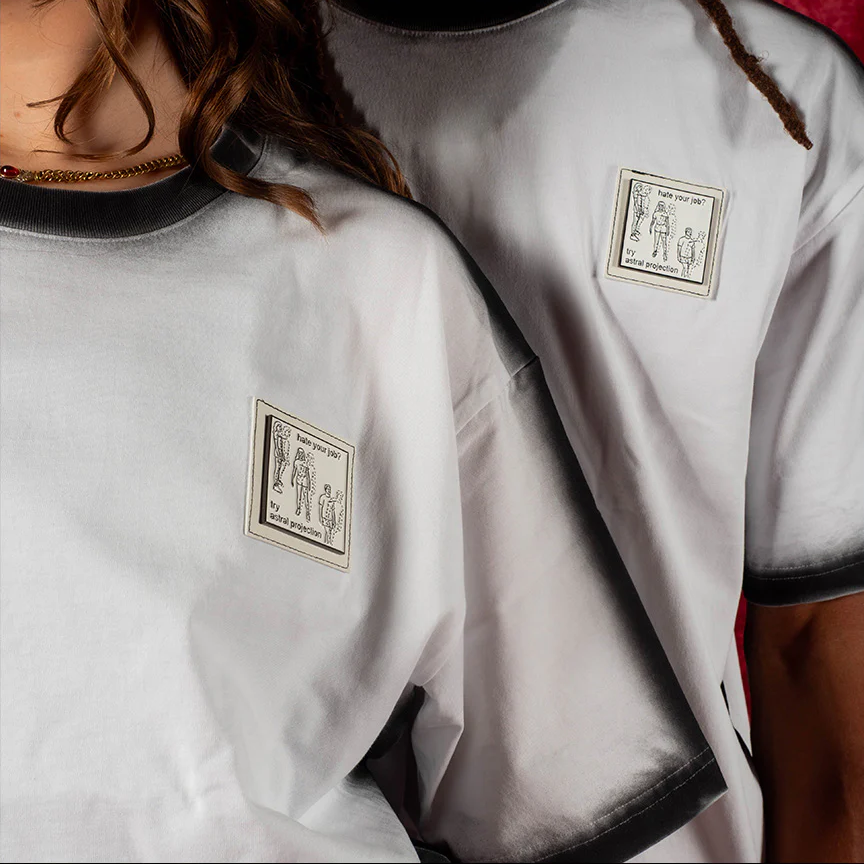 Designed by Raf Reyes: tired of the daily grind? ⇄ ""Hate your job? try astral projection"" invites you to escape, not by quitting, but by stepping out — literally 🧿~ leave your body behind, float through realms of consciousness, and find freedom beyond the 9-to-5 --- issa cheeky call to be ᵥreal (with yourself, the world at large, and fuck knows who/what else ⇄ Ü decide) 🚸_ when the hustle drains your spirit, maybe it's time for an out-of-body experience :: forget the rat race, transcend it [...] your mind (& soul) deserve a break *ugh* 😩.