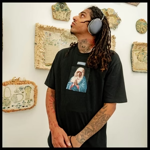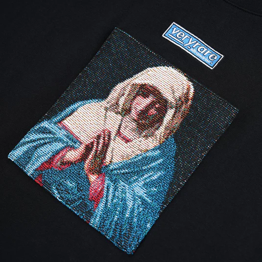 Tech specs: 100% cotton [210gsm | | | bio-washed | | | softest handfeel producible], discharge prints (fusing naturally with the fabric) ⇄ non-plasticky ⇄ super cushy/comfortable to the touch | woven tapestry 'appliqué' + embroidery @ front | | | custom-molded metal tag at bottom.