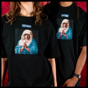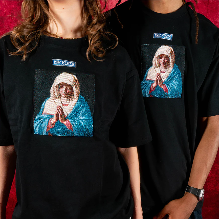 Designed by Raf Reyes: embodying quiet devotion & the pull between faith + sorrow | draped in celestial blue + crimson, hands clasped 🙏 | beneath her serene façade, a storm brews —her gaze whispers of a Destiny carved in heaven, burdened by earthly sins ⇄ not just a figure, but a bridge between worlds, her prayer shatters barriers of space + time 📿.