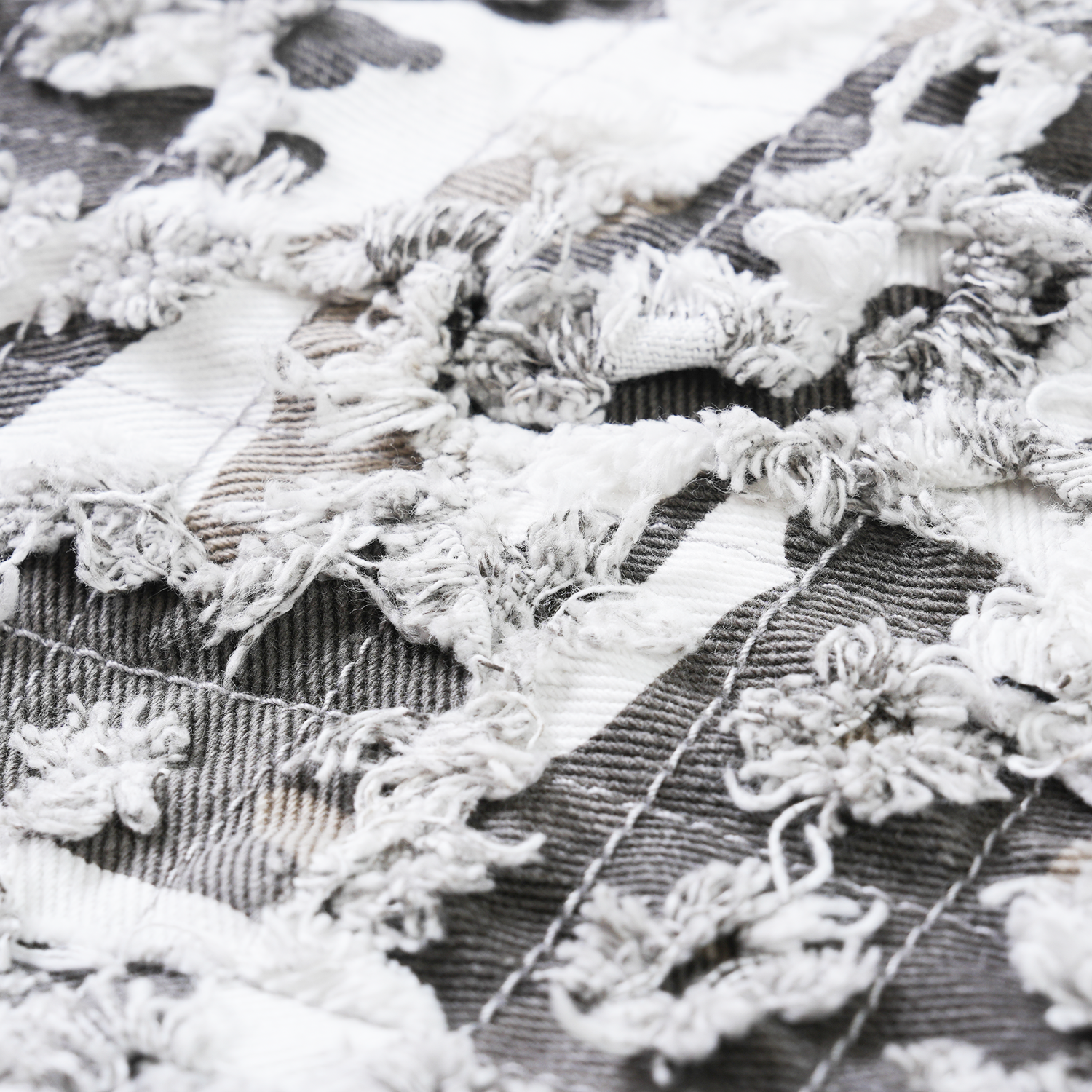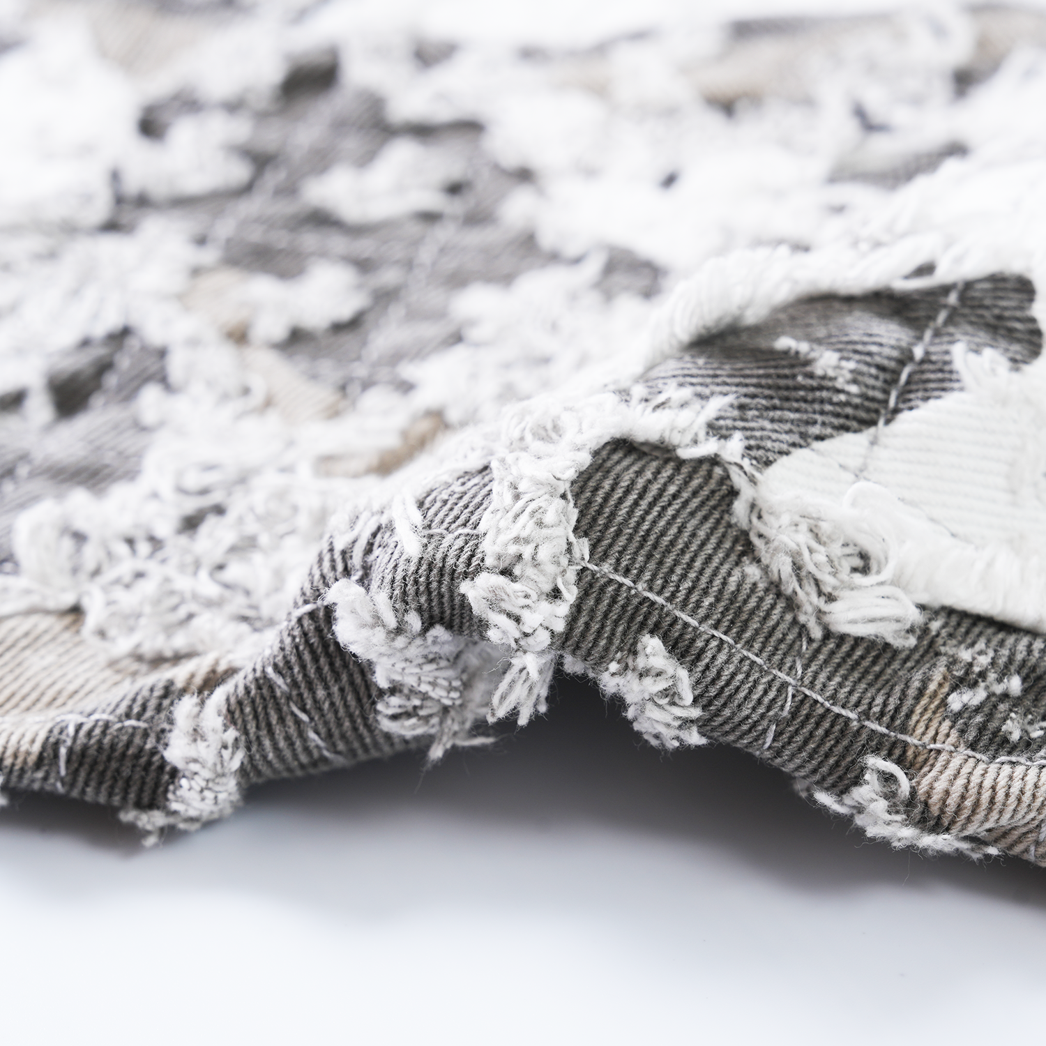 Designed by Raf Reyes: these pants embodies boro, a traditional Japanese textile mending technique 🧵~ its grey-and-white design reflects the historical patchwork aesthetic, enhanced by sashiko stitching 🪡 over 70 hours of threadwork and distressing give each panel a unique story, adding life and history 📜~