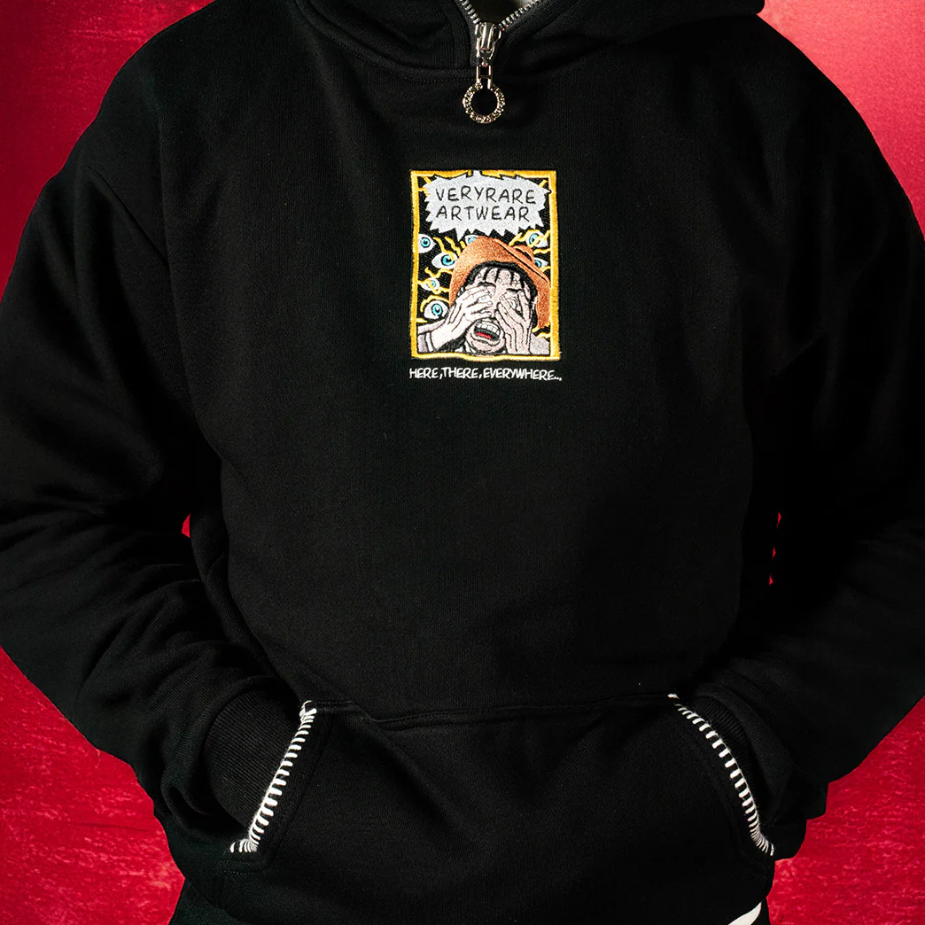 Designed by Raf Reyes: a man, clearly overwhelmed, clutches his face in panic, surrounded by many eyes staring him down from every angle [👁️]:: ""VERYRARE!"" bursts from the panel (+ bolts ⚡️)| | | amplifying his paranoia 🌀--- the eyes pierce through his psyche, inescapable, each one a witness to his torment ⛓️:: his sweat-drenched face and frantic expression scream of a mind unraveling under the constant gaze 👁️🗨️⇄ no place to hide :: excruciating in its surveilled ᵥrelentlessness | | | every second drags on, a slow 'disintegration of self' [𖦹꩜。゚☼].
