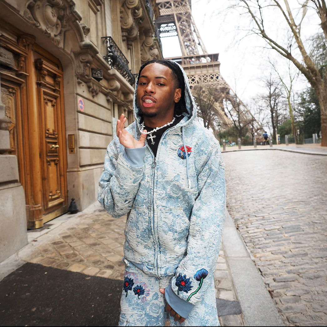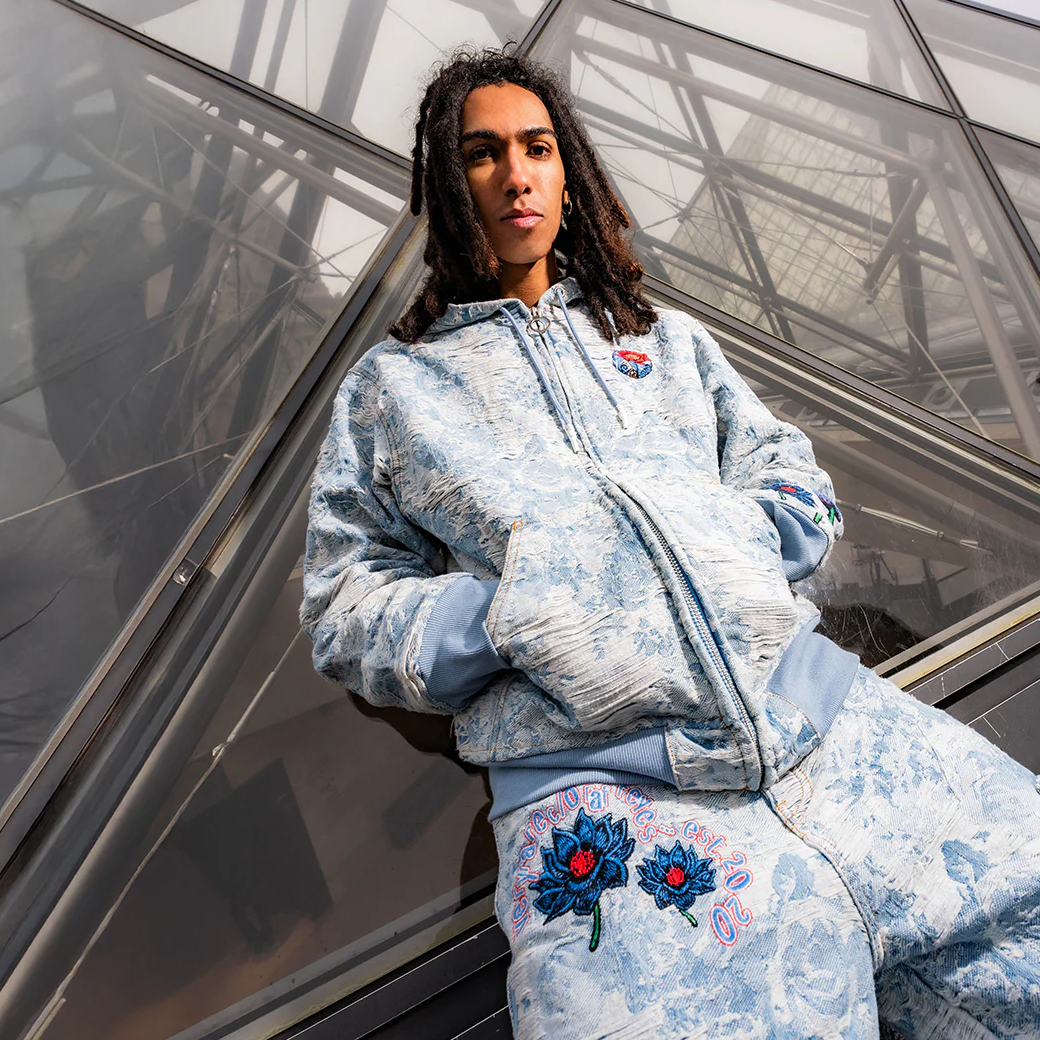 Tech specs: ⁽†⁾ᵥremarkable couture-inspired fil coupé jacquard denim (100% cotton | | | 475gsm/14oz) ~ VERYRARE ""flowers tapestry"" motif incorporates a subtle texturing (& softness), while the fabric has been worked & dyed to give a worn-in effect [...] custom-molded branded zipper puller, embroideries @ front & back 🌹~ this piece can be worn with matching pants for a total look 👖.