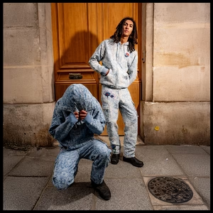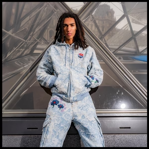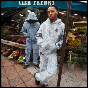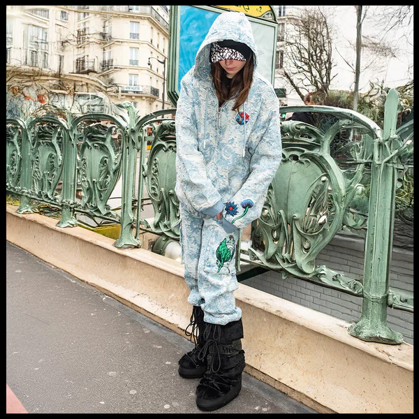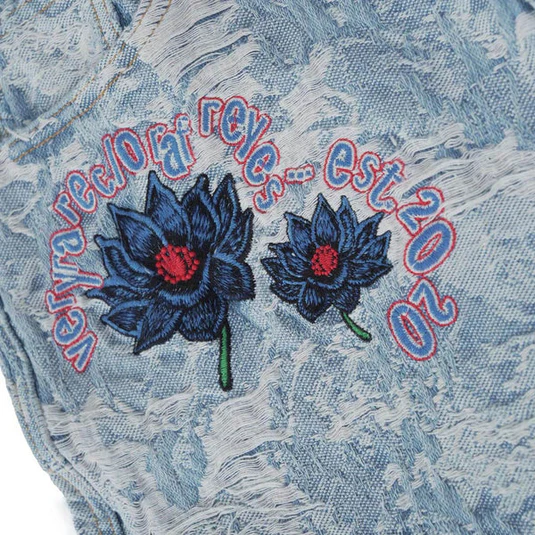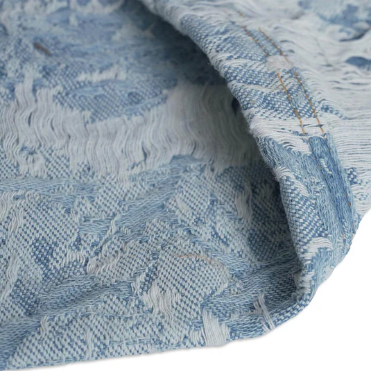 Tech specs: ⁽†⁾ᵥremarkable couture-inspired fil coupé jacquard denim (100% cotton | | | 475gsm/14oz) ~ VERYRARE ""flowers tapestry"" motif incorporates a subtle texturing (& softness), while the fabric has been worked & dyed to give a worn-in effect 🪡 [...] custom-molded gunmetal branded buttons, embroideries @ front & back 🌹~ this piece can be worn with matching hoodie for a total look 👖.