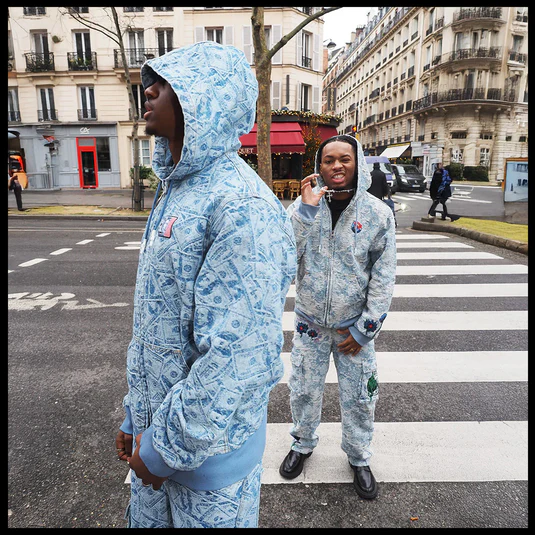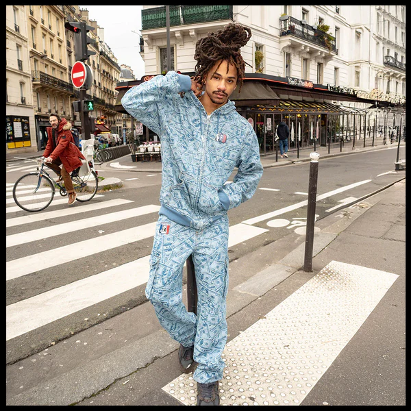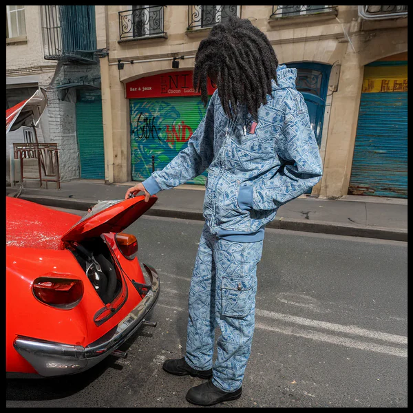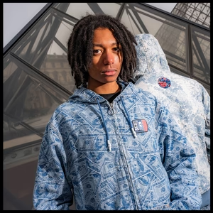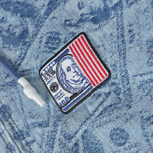Designed by Raf Reyes: issa bold statement of opulence [💵] ~ crafted with intricate detailing, the jacquard denim is covered in a sea of hundred-dollar bill patterning, screaming luxury & dope-ness 💸✨ [...] the fabric’s rich texture (& meticulous design) embody the allure of ca$h (and success), making it perfect for those who want to wear their fortune on their sleeve 💰🤑.