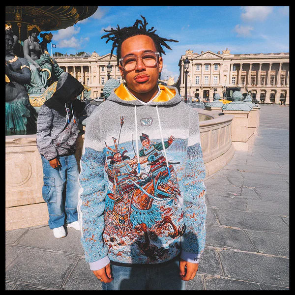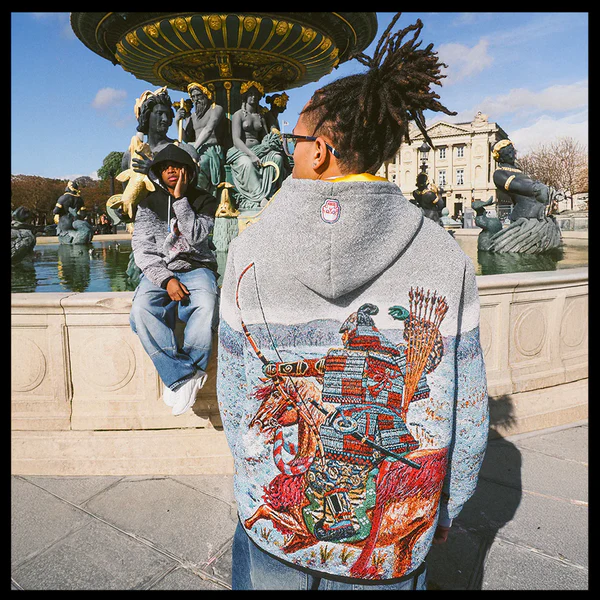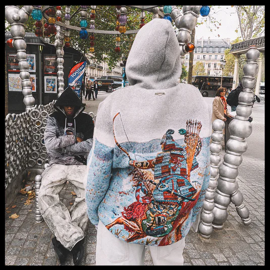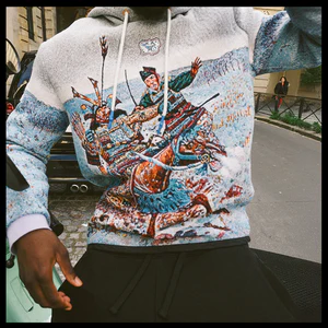 Tech specs: premium jacquard woven tapestry fabric (410gsm polycotton) | | | 100% wool ribbings @ sleeves (w/ intarsia logo at cuffs) +++ suede mini-ribbing (at bottom) | | | satin silk lining (inside *fully*), tight-knitt’d drawcords (with compression/coated matte tips), enamel-coated eyelets, embroidery at front & at hood areas &&& chenille + normal (mix) embroidery ('bones' at sleeves).