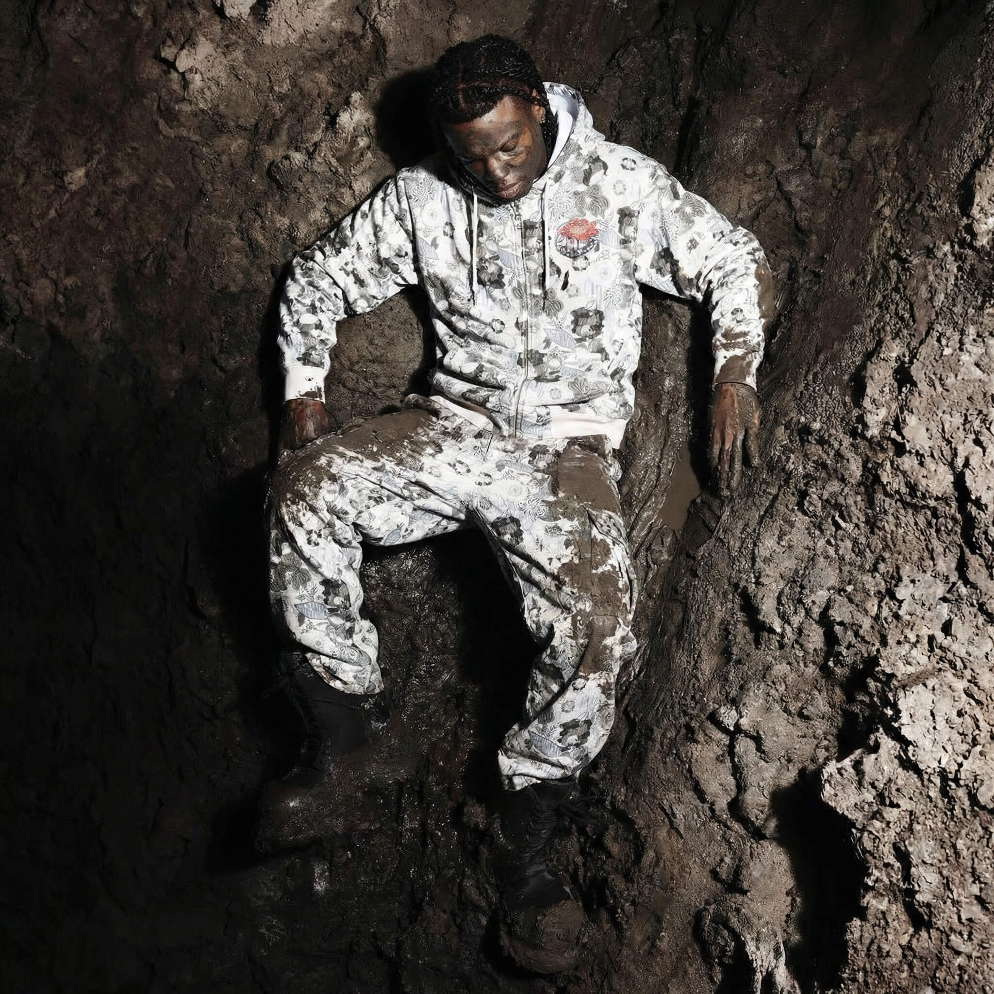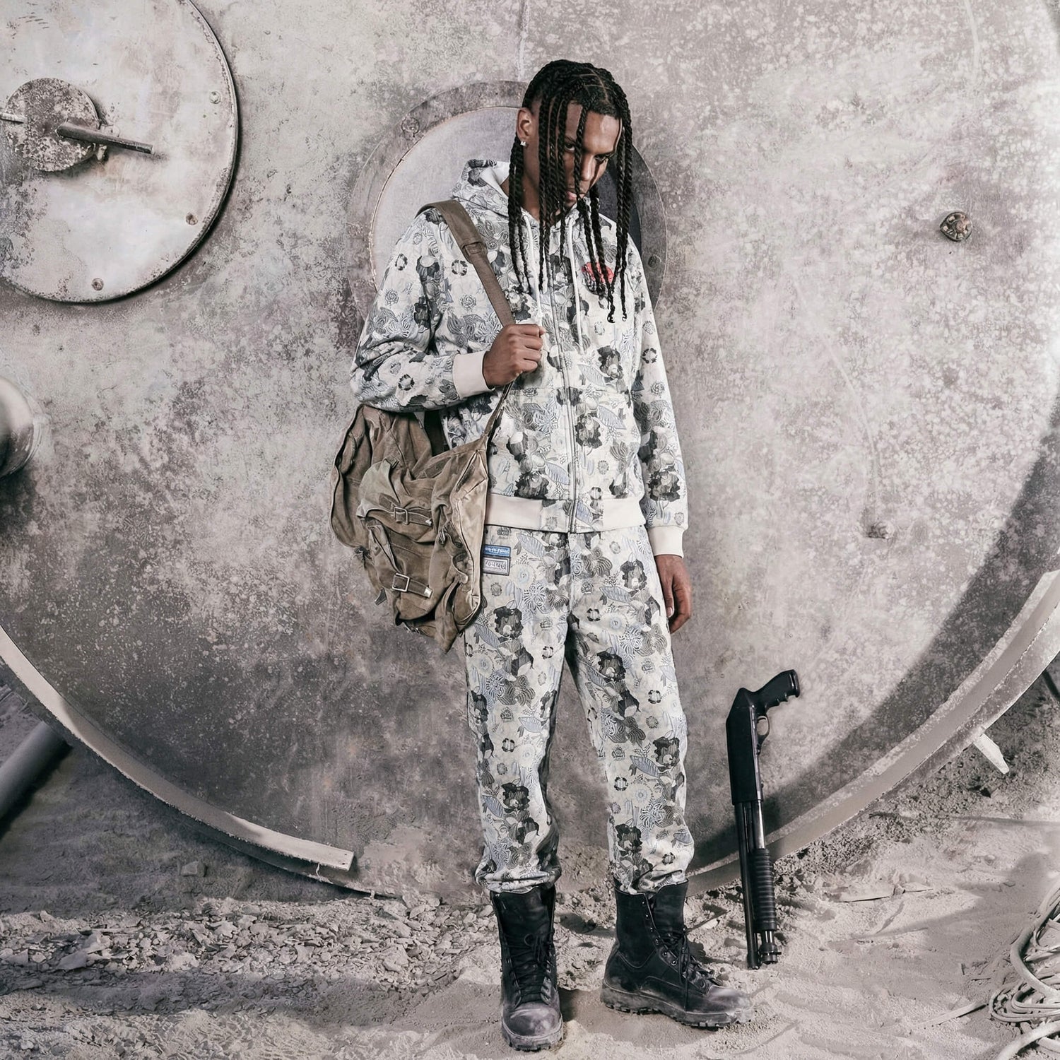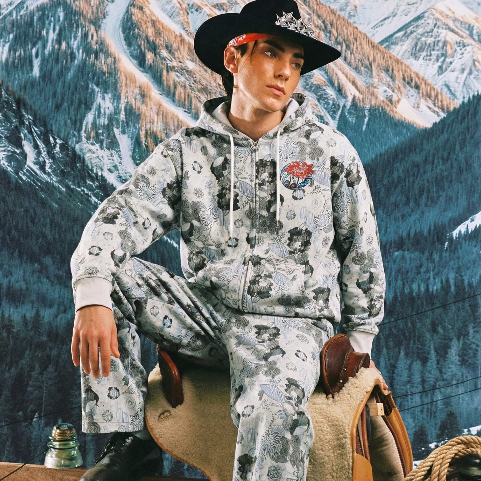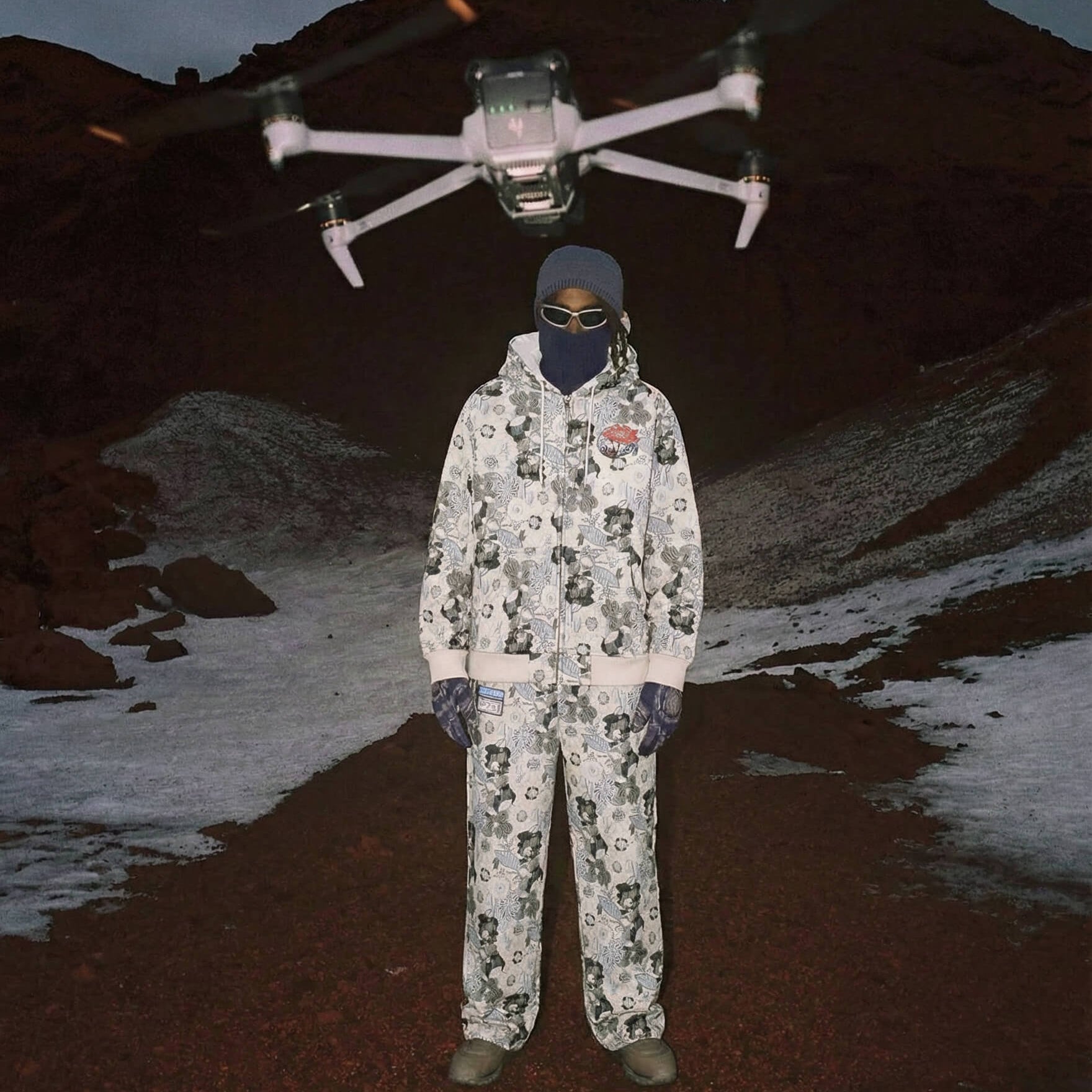 Designed by Raf Reyes: frostbite is winter ᵥromance with a blade under the sleeve⚔️⇄ florals drifting like snowed-over memories — quiet, detailed, almost innocent 🥀___ the chest emblem 'dark lotus' low-key a compass, flaring like a wound that refuses to close :: find the light, follow the lake woman embroidered on the patch 💮:: it’s the calm after the storm, when the streets are silent and your heartbeat is the loudest thing alive ⇄ this piece doesn’t scream, it chills ❄️| | | wear these pair of pants 🆙 and move through the cold like you own it: unbent, unbound, unbroken 🥶.