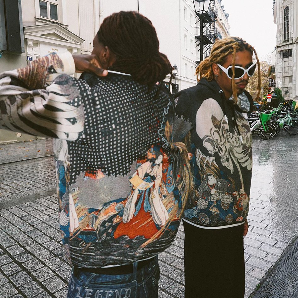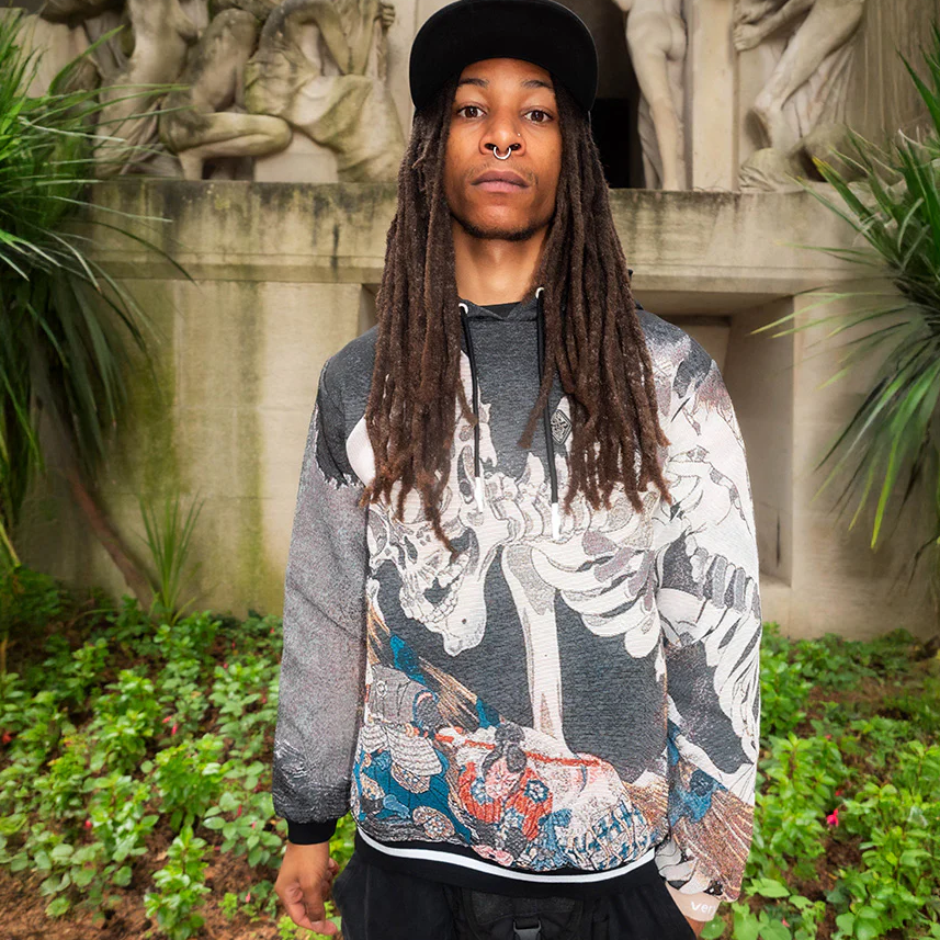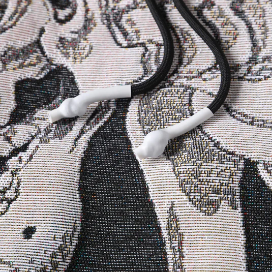 Tech specs: premium jacquard woven tapestry fabric (410gsm polycotton), satin silk lining (inside *fully*), metal-enamel-leather patch at front, trademark bloodstain "splatter" embroidery at back, 'no-see, no-hear, no-speak' embroidery at hood, woven tag (neck), enamel-coated eyelets, tight-knitt’d drawcords (with compression/coated matte tips), 100% wool ribbings @ sleeves (w/ intarsia logo at cuffs) ~