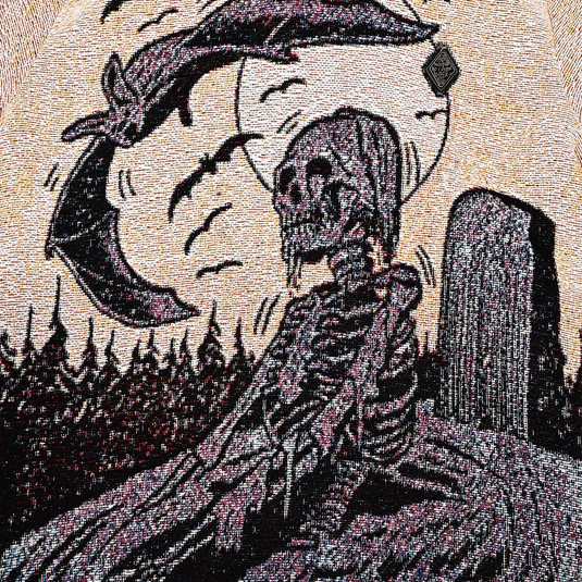 Designed by Raf Reyes: beneath a full moon's ghostly glow, a chilling scene unfolds as a skeletal figure ᵥrises from his disturbed grave, defying the natural order ⚰️~ above, a giant bat casts eerie shadows, guarding supernatural ᵥrealms 🦇| | | in this strange yet frightening/fascinating tableau, the boundary between natural & supernatural blurs, ᵥreminding us of mysteries beyond mortal comprehension and the convergence of life & death under the spectral\lunar light ☠️💀.