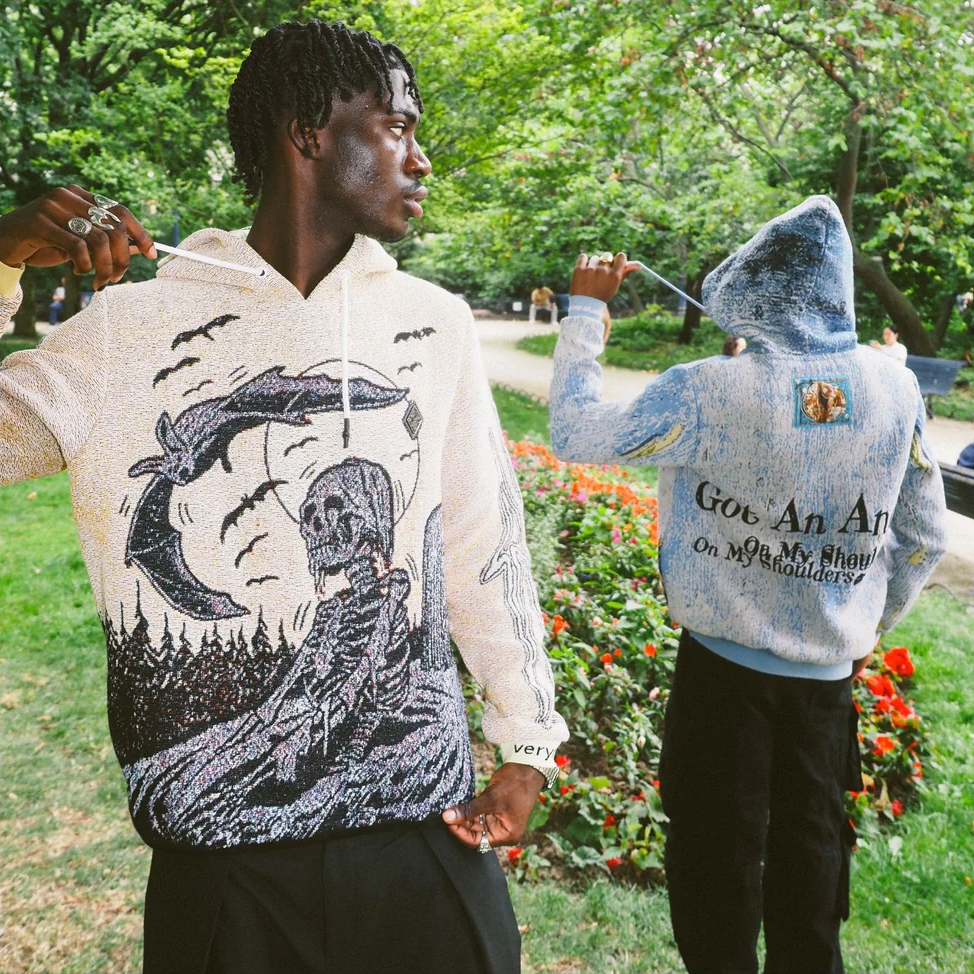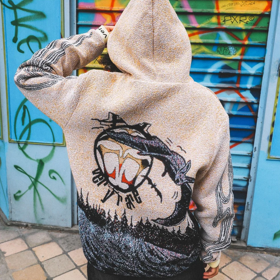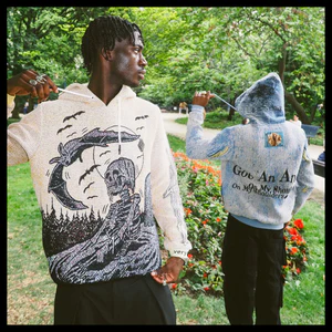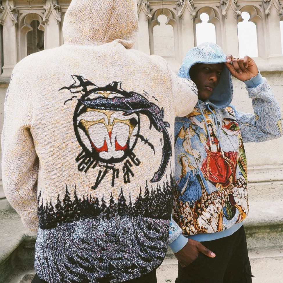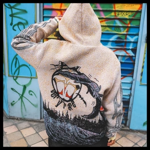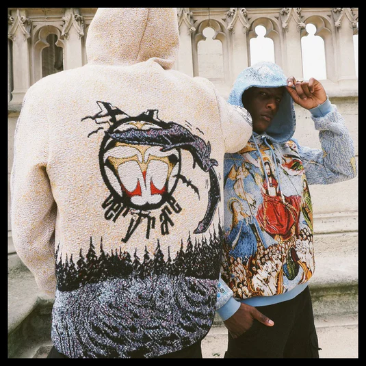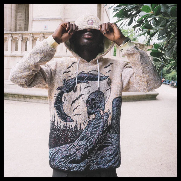 Tech specs: premium jacquard woven tapestry fabric (410gsm polycotton) | | | leather appliqué'd with silver embossed-debossed 'Hell-&-Back'-patch (+ tonal thread'd contour'd), 100% wool ribbings @ sleeves (w/ intarsia logo at cuffs) +++ suede mini-ribbing (at bottom), satin silk lining (inside *fully*), tight-knitt’d drawcords (with compression/coated matte tips), enamel-coated eyelets, metal tag (+ enamel color pouring/coating innit) at back, embroidery at hood.