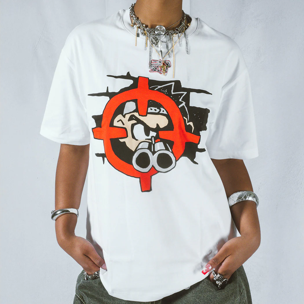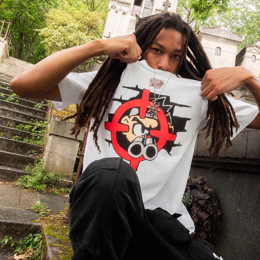 Designed by Raf Reyes: lil boi’s got the shotgun cocked, eyes locked, and he's ready to blow away any lame ass mofos trying to ᵥroll through his turf ⚔️— this ain’t no playground 💥 :: he’s the gatekeeper, barring entry, protecting his block from frauds & fakes alike 🚫... once his targets spotted, it’s all ᵥred dots and headshots 🎯:: ""I went to your hood and nobody knew you!"" screams across the back — a final taunt, a warning that you’re not welcome here 🙅♂️[...] playtime's over, and lil boi 's not messing around ‼️.