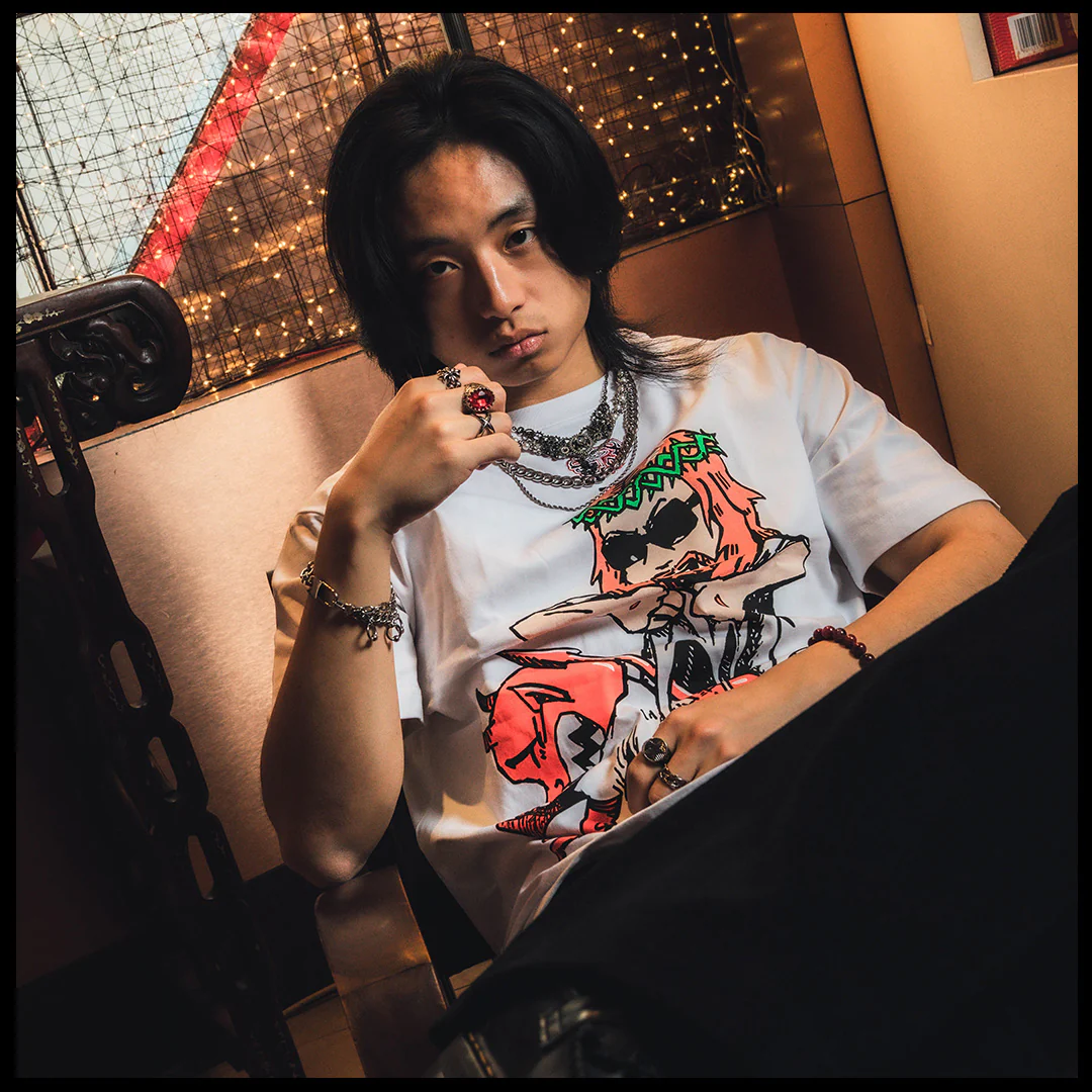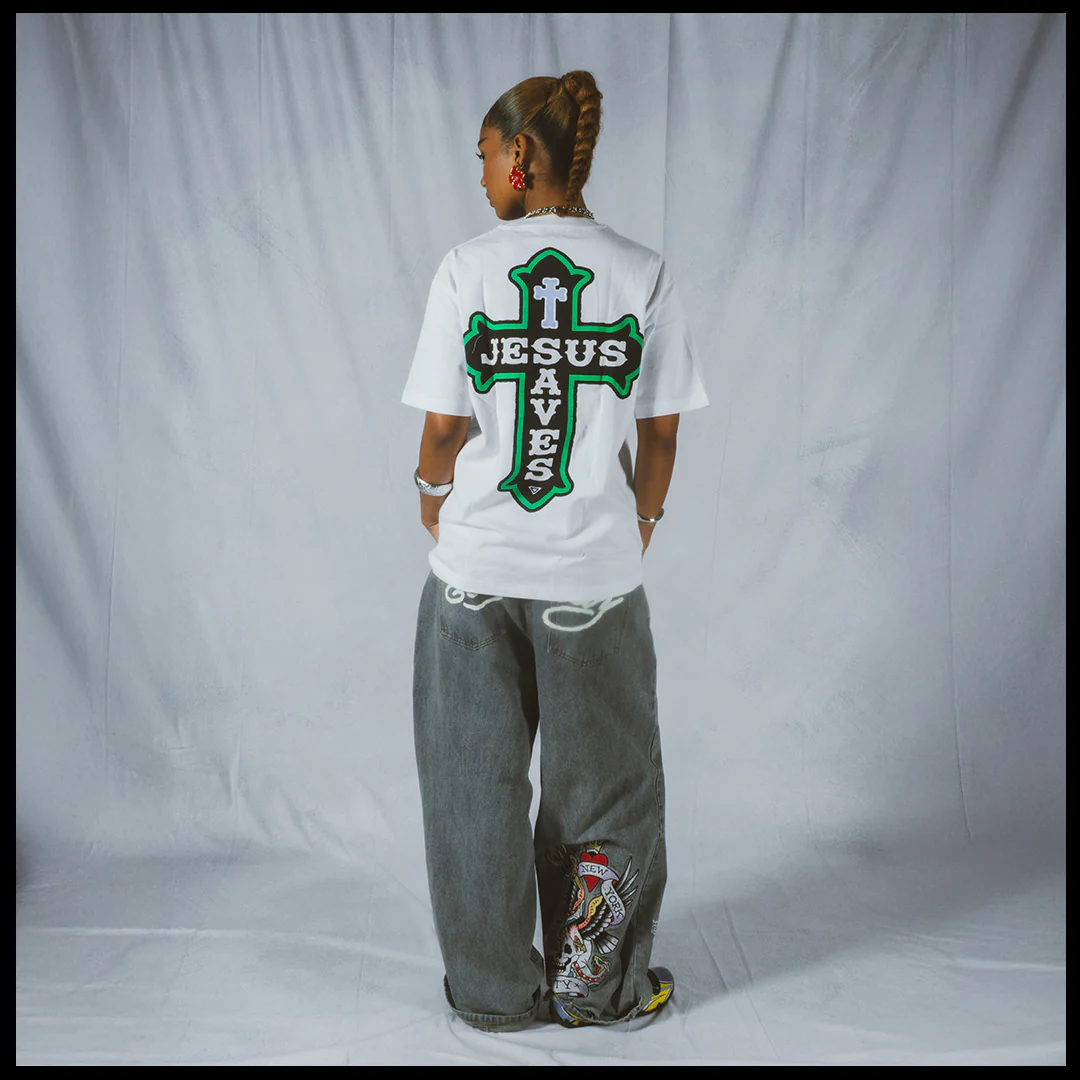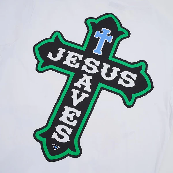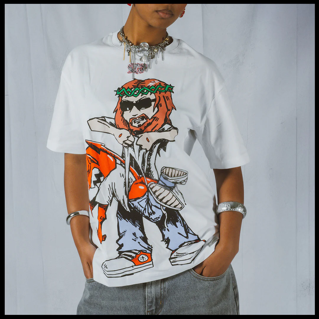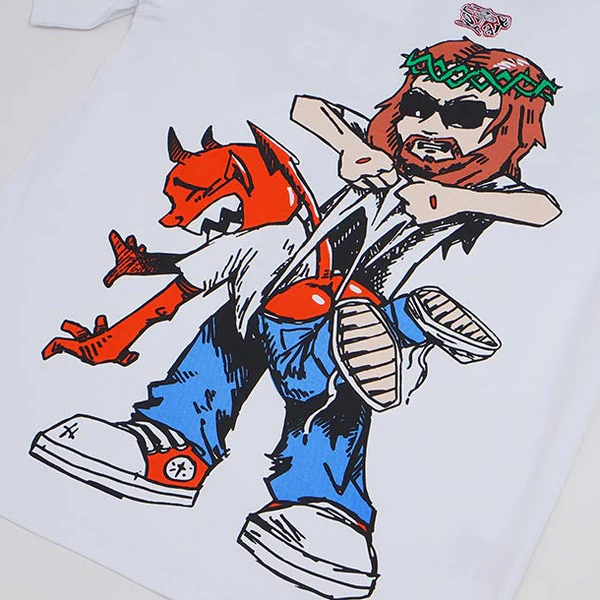 Designed by Raf Reyes: Jesus, wearing shades and a crown of thorns, isn’t here for soft prayers — he’s literally beating the shit out of the devil, tearing him apart with his bare hands 💥˖˖˖ red kicks rockin', snapping layer after layer ✦ the devil’s got nothing on this divine powerhouse 🙏| | | this isn’t Sunday school, it’s a battlefield, where the Son of God lays waste to darkness in ᵥraw, unapologetic form :: "Jesus Saves" blazes in bold across a cross, a symbol of ᵥredemption that feels more like a streetwise warning to evil: you’re outmatched, outgunned, and out of time.