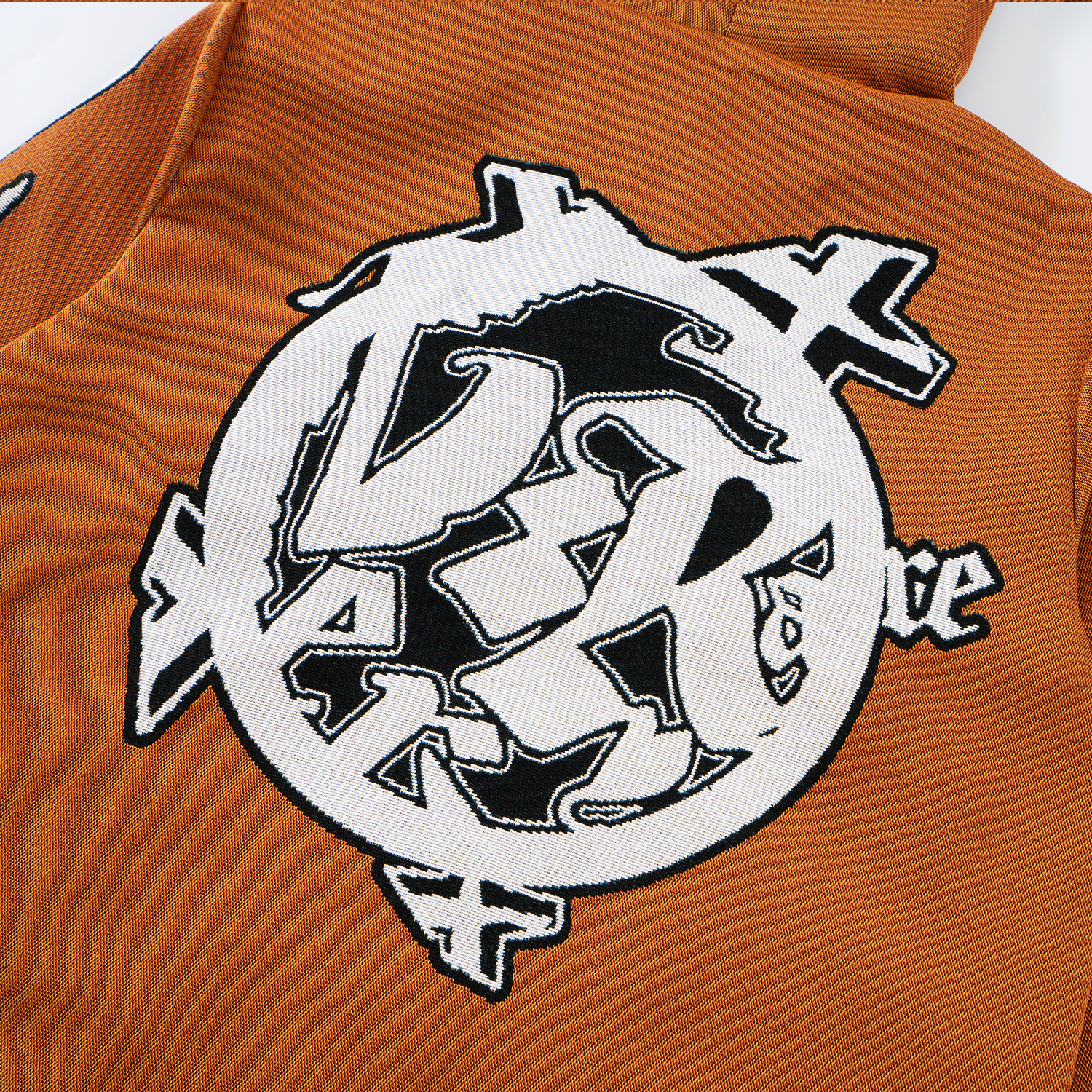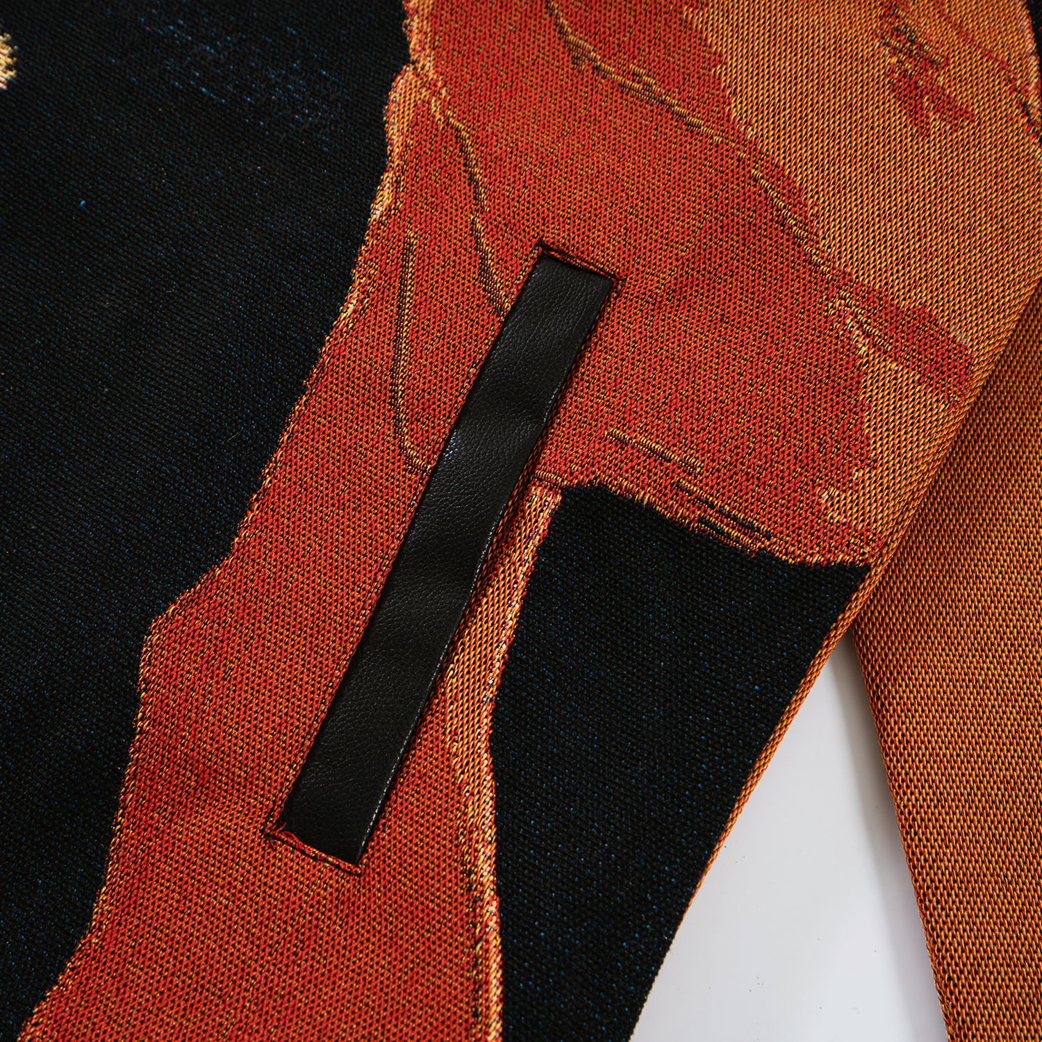 Materials: premium jacquard woven tapestry fabric (410gsm polycotton), embroidery (on hood), zip closure, 925 silver circle branded custom-molded puller, satin silk lining (inside *fully*), enamel-coated eyelets, tight-knitt’d drawcords (with compression/coated matte tips) | | | 100% wool ribbings @ bottom & sleeves (w/ intarsia logo at cuffs) ~