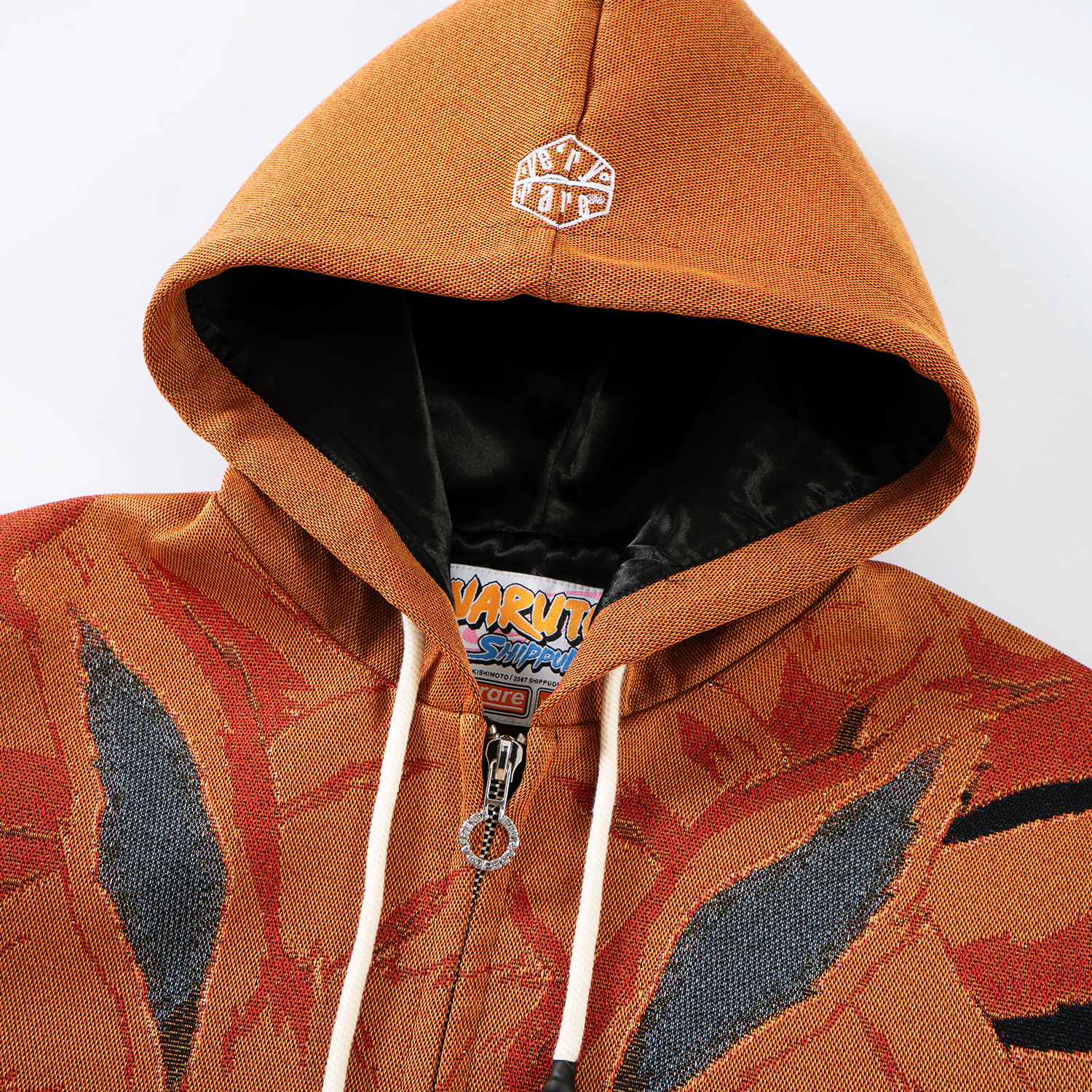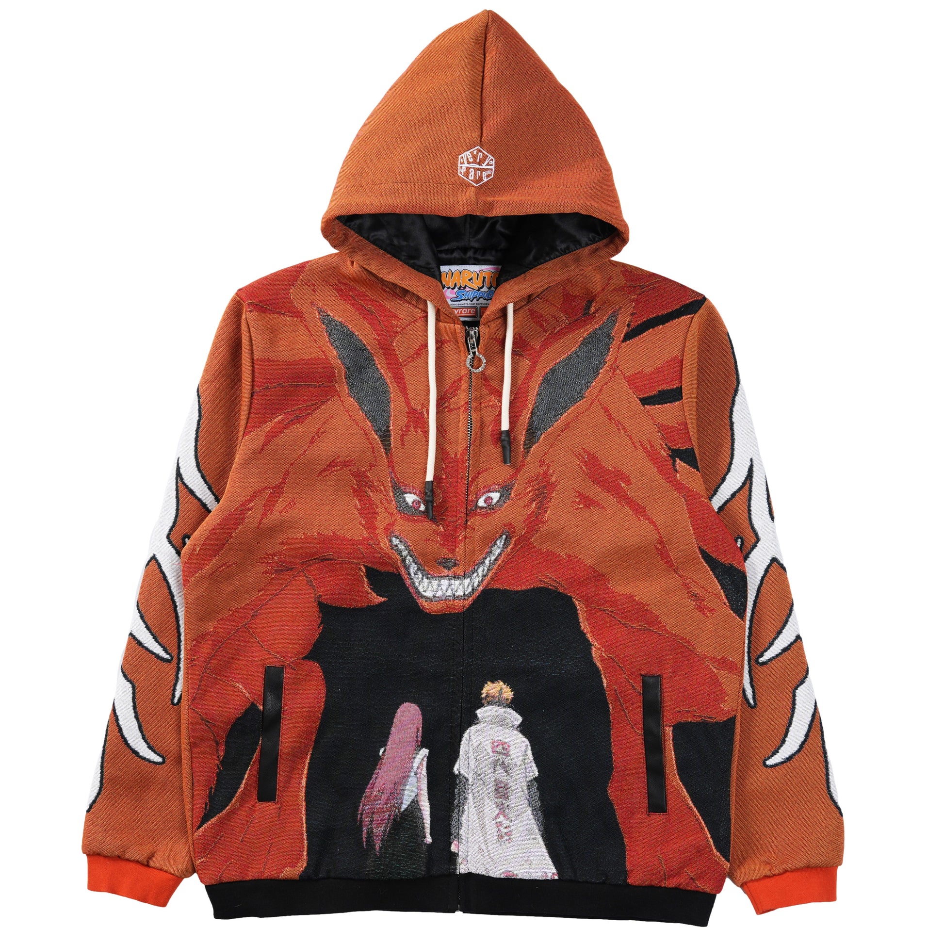 Officially licensed NARUTO x VERYRARE collab: Kurama — feral and massive — looms over Minato and Kushina as they face death to protect their newborn ~ this the sealing scene: love weaponized w/ sacrifice ⇄ the Fourth Hokage and his wife don’t flinch [...] they anchor the beast inside their son ⇄ chakra becomes cradle ~ the design stitches the myth into fiber/fabric — parents becoming barrier, fox becoming burden, destiny shaped in blood and flame.