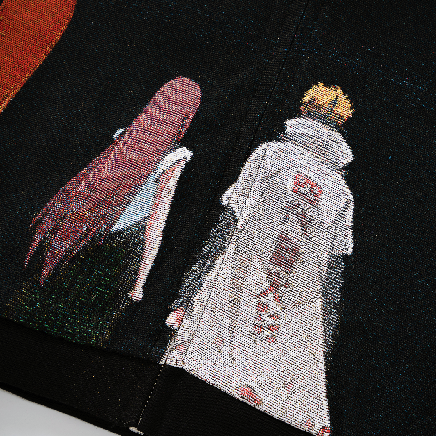 Designed by Raf Reyes: Kurama — feral and massive — looms over Minato and Kushina as they face death to protect their newborn ~ this the sealing scene: love weaponized w/ sacrifice ⇄ the Fourth Hokage and his wife don’t flinch [...] they anchor the beast inside their son ⇄ chakra becomes cradle ~ the design stitches the myth into fiber/fabric — parents becoming barrier, fox becoming burden, destiny shaped in blood and flame.