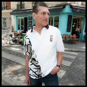 Tech specs: 290gsm cotton (100%) piqué jersey polo, relaxed/boxy fit, camo panelling, embroidery, enamel-coated buttons.