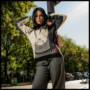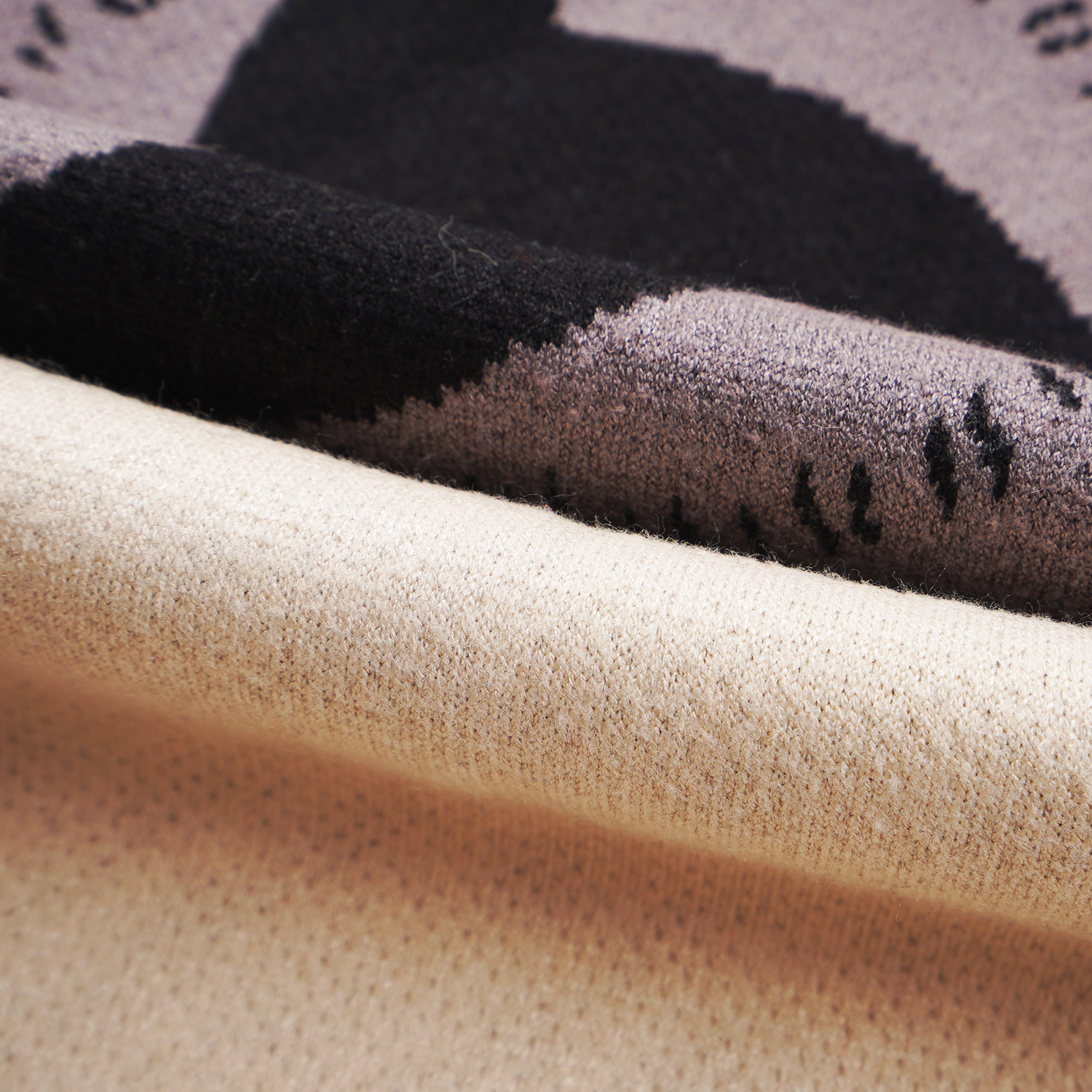 Tech specs: 14gg birdseye jacquard knit (composition: 50% viscose, 30% polyester, 20% nylon), tubular/tonal hems.