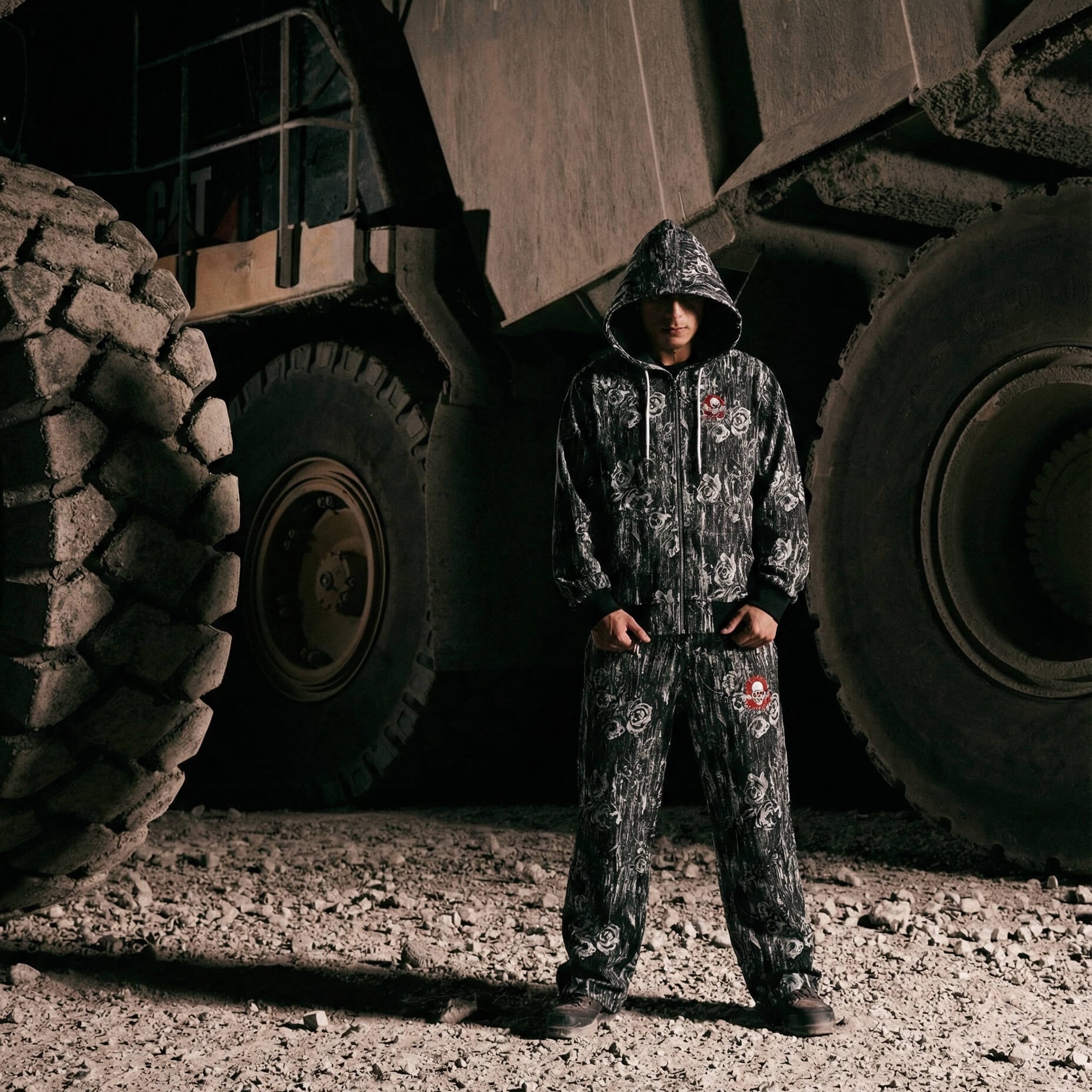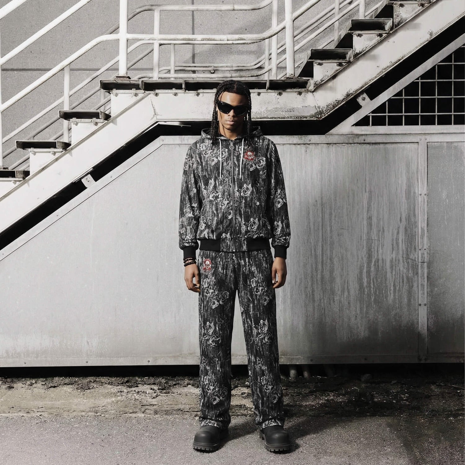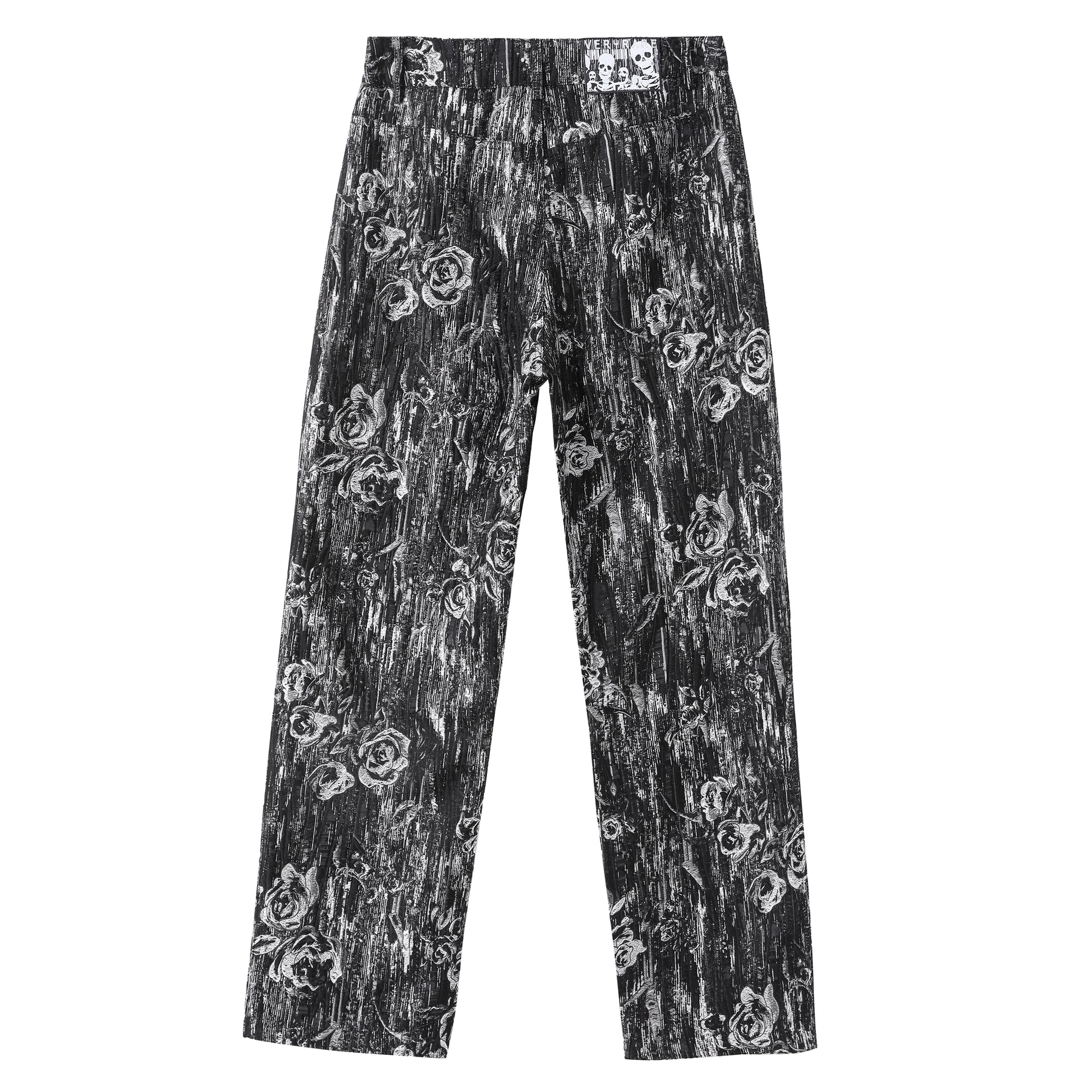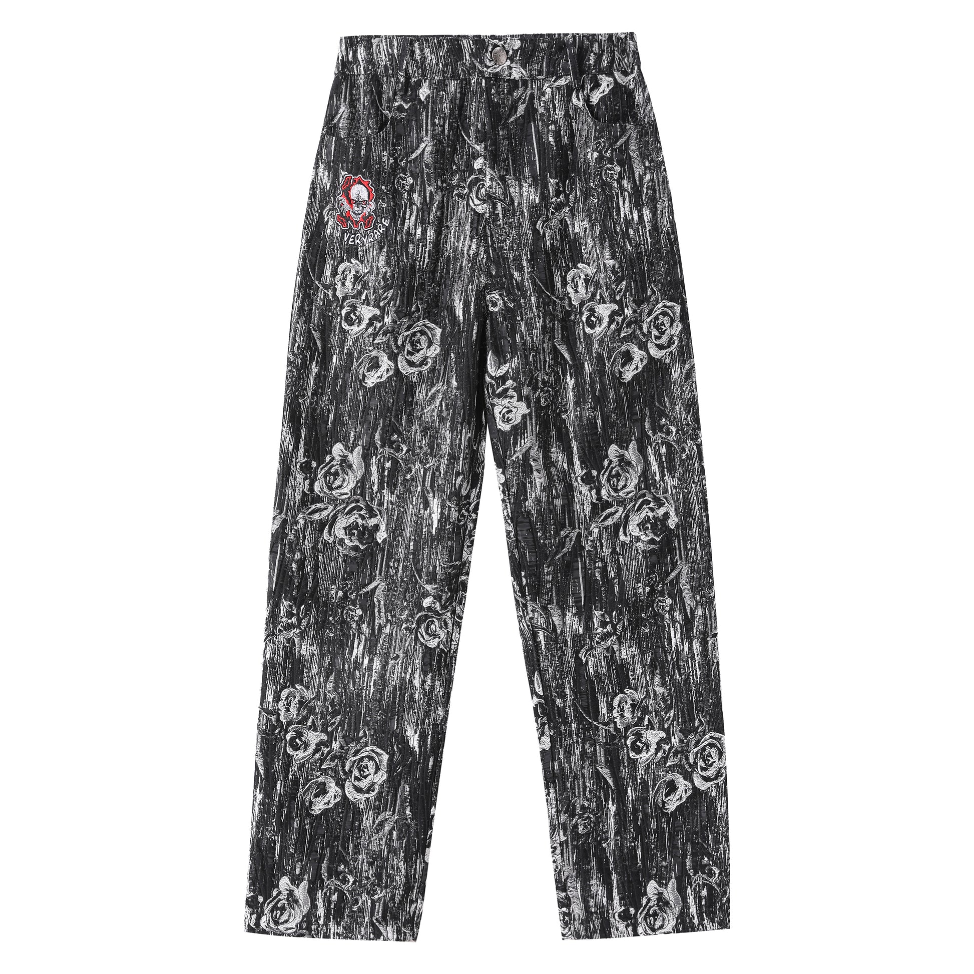 Designed by Raf Reyes: they call it 'Phantom' because it moves like a ghost 🦇🥀... the blackened wall of paint-streaks and ᵥroses, like an old love letter burned, then photographed, then reprinted *until the meaning blVRs* ⇄ dem flowers gon' show up anyways — like stroboscopic white flashes in the static —proof that something suRVived the fire 🔥 tha skel crest is the only pulse left, like sum warning on a silent channel... 📟| | | wear these pair of pants 🆙 and disappear, and let the world argue if you were ever there.