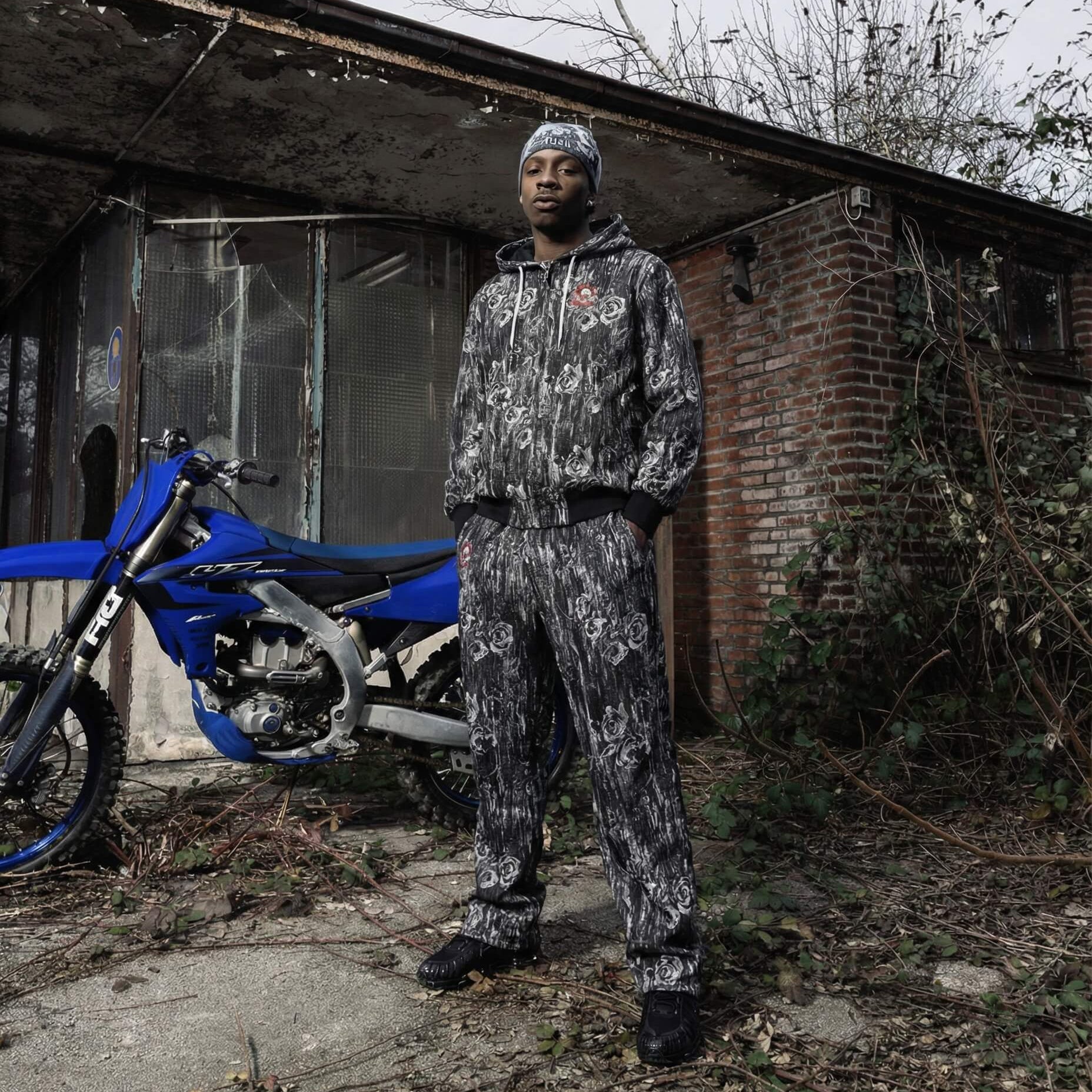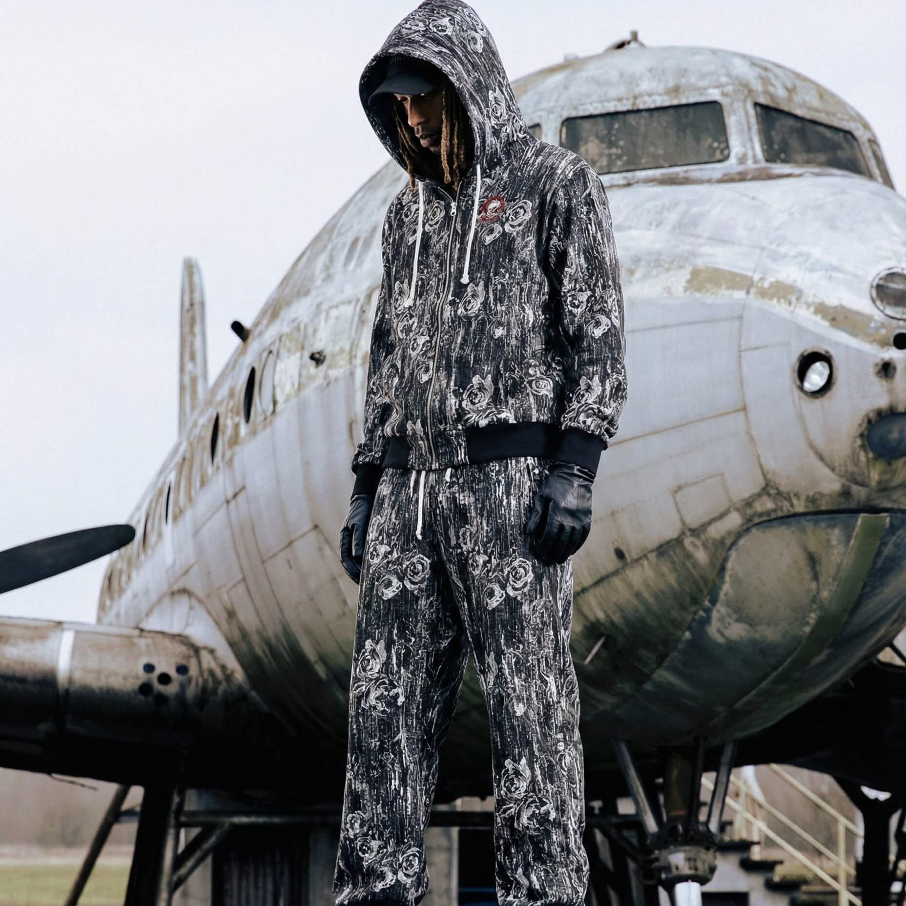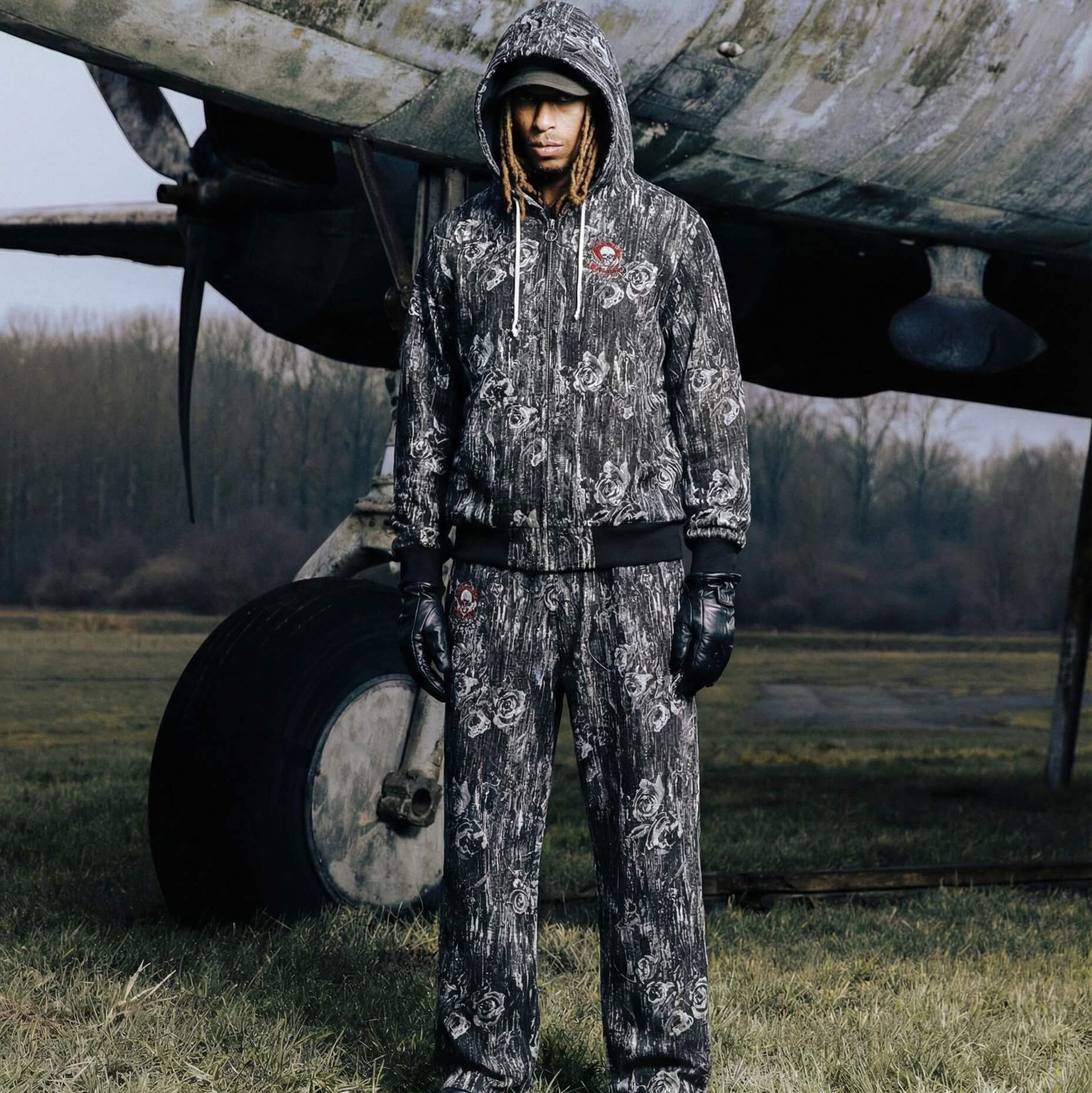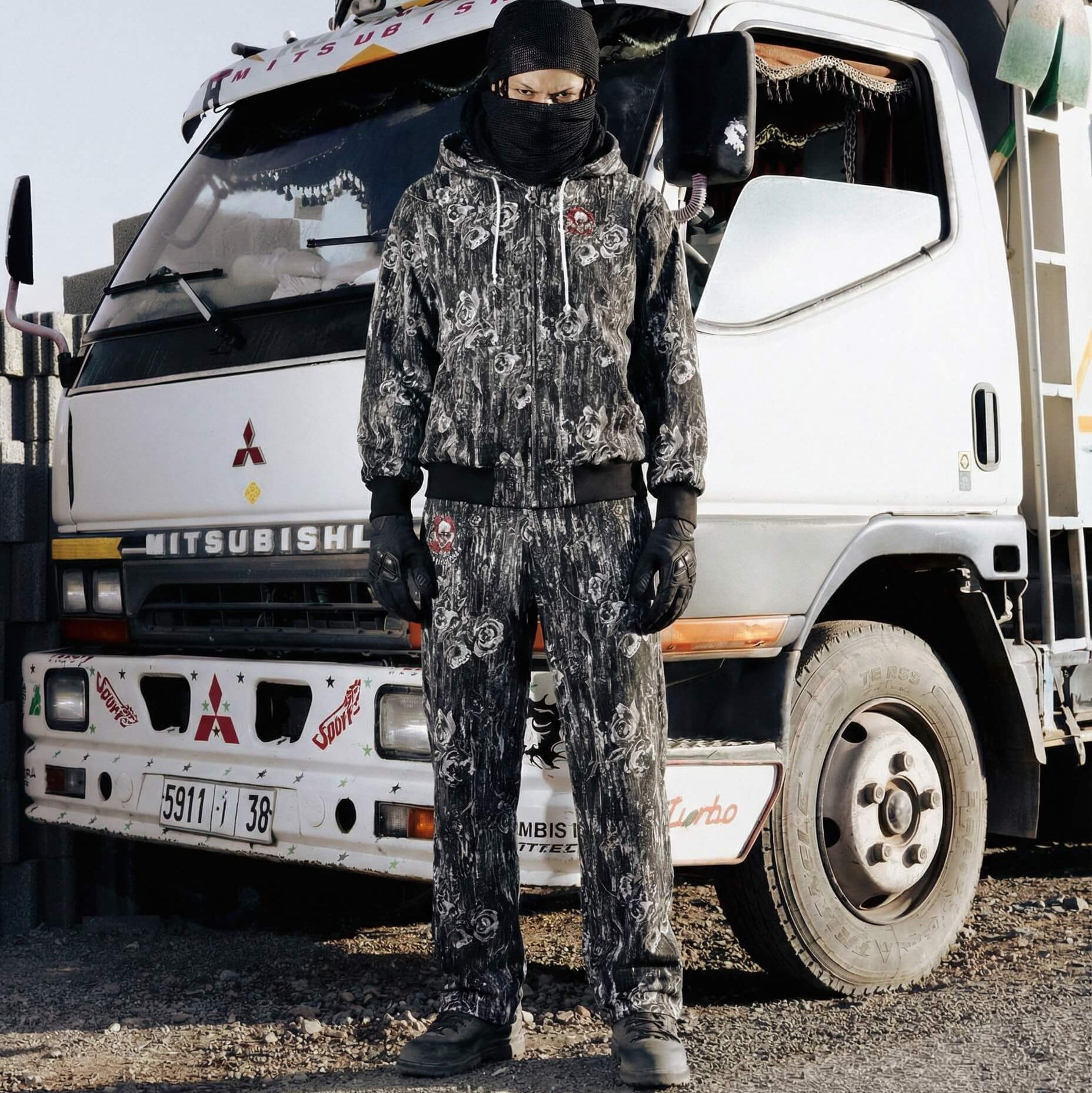 Designed by Raf Reyes: they call it 'Phantom' because it moves like a ghost 🦇🥀... the blackened wall of paint-streaks and ᵥroses, like an old love letter burned, then photographed, then reprinted *until the meaning blVRs* ⇄ dem flowers gon' show up anyways — like stroboscopic white flashes in the static —proof that something suRVived the fire 🔥 tha skel crest is the only pulse left, like sum warning on a silent channel... 📟| | | wear these pair of pants 🆙 and disappear, and let the world argue if you were ever there.