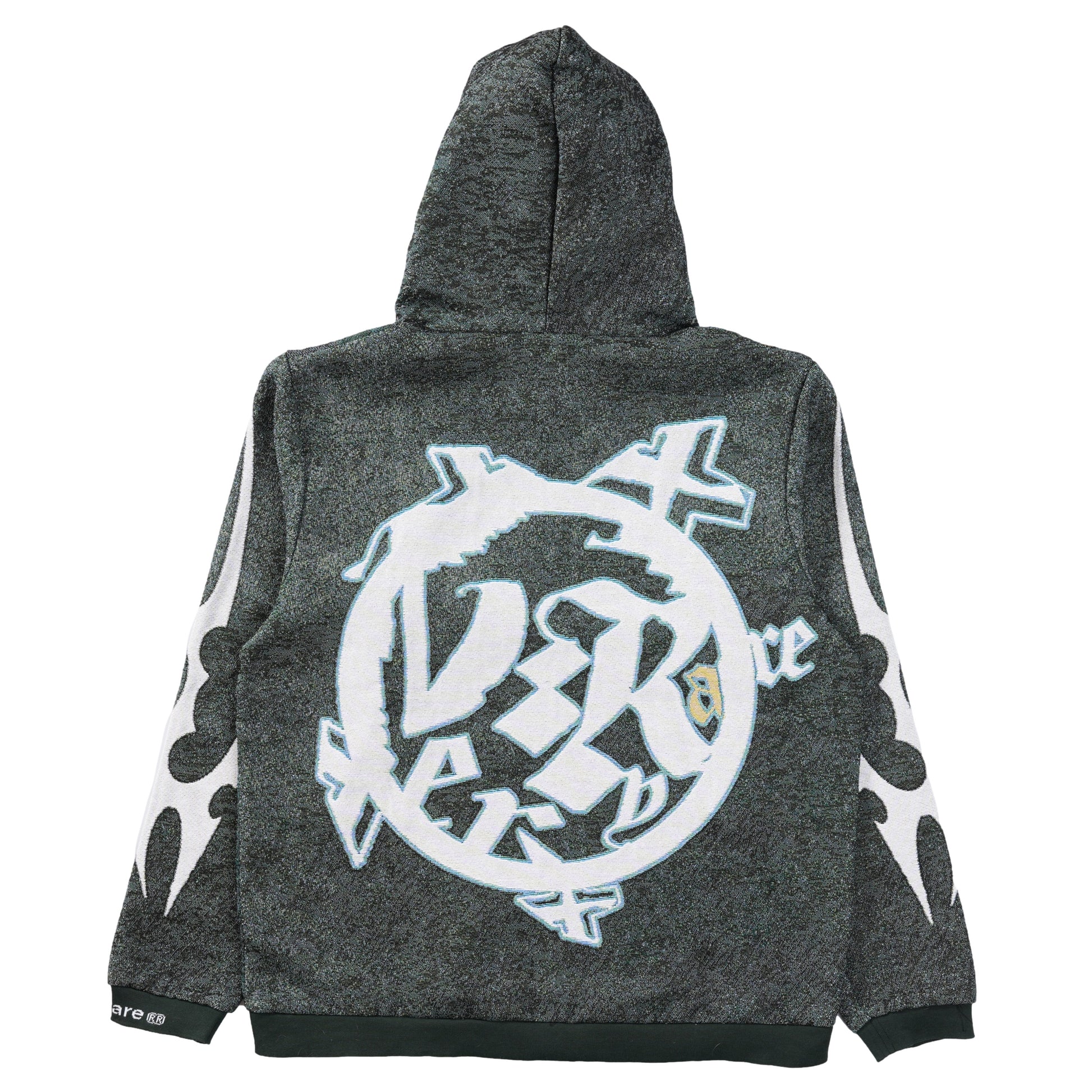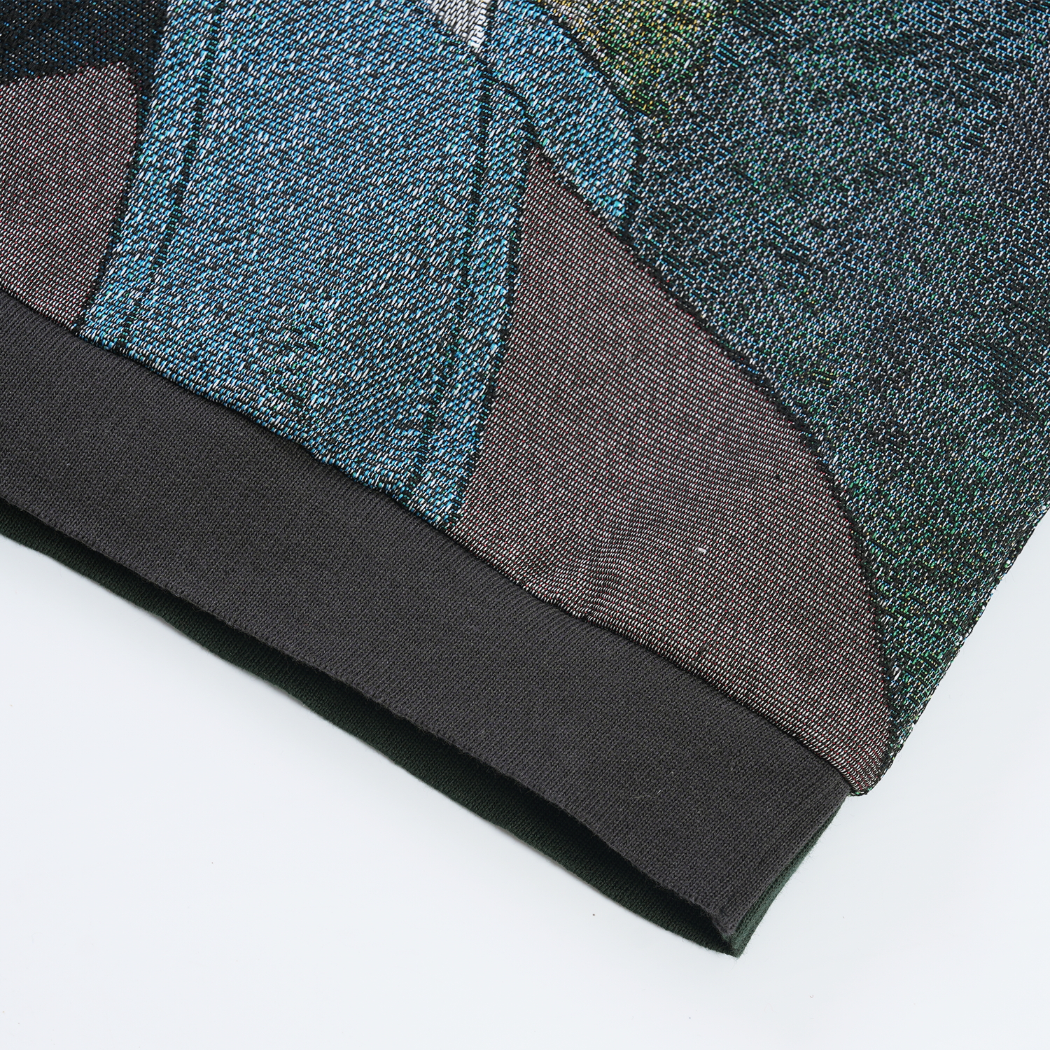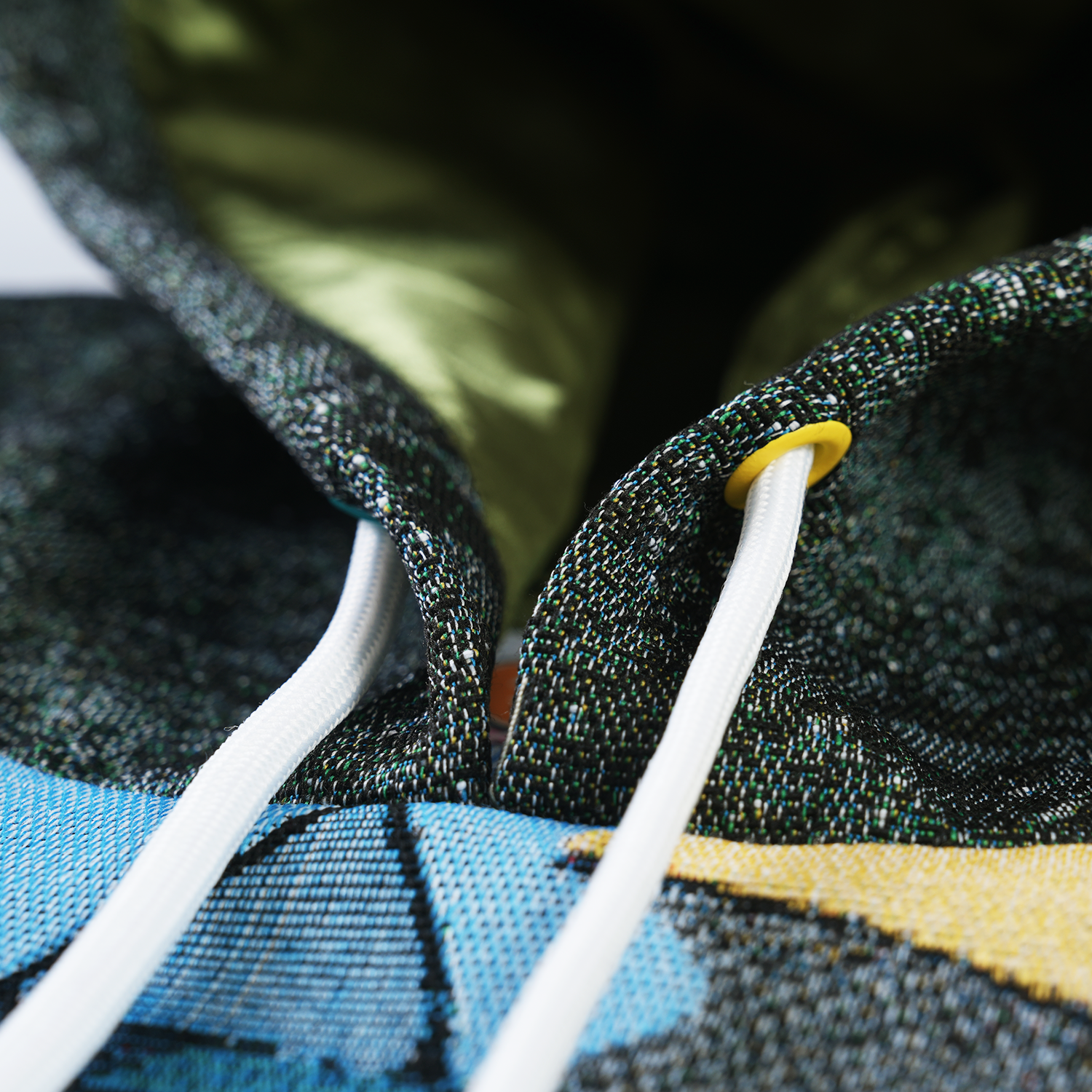 Materials: premium jacquard woven tapestry fabric (410gsm polycotton), satin silk lining (inside *fully*), enamel-coated eyelets, tight-knitt’d drawcords (with compression/coated matte tips) | | | 100% wool ribbings @ bottom & sleeves (w/ intarsia logo at cuffs) ~