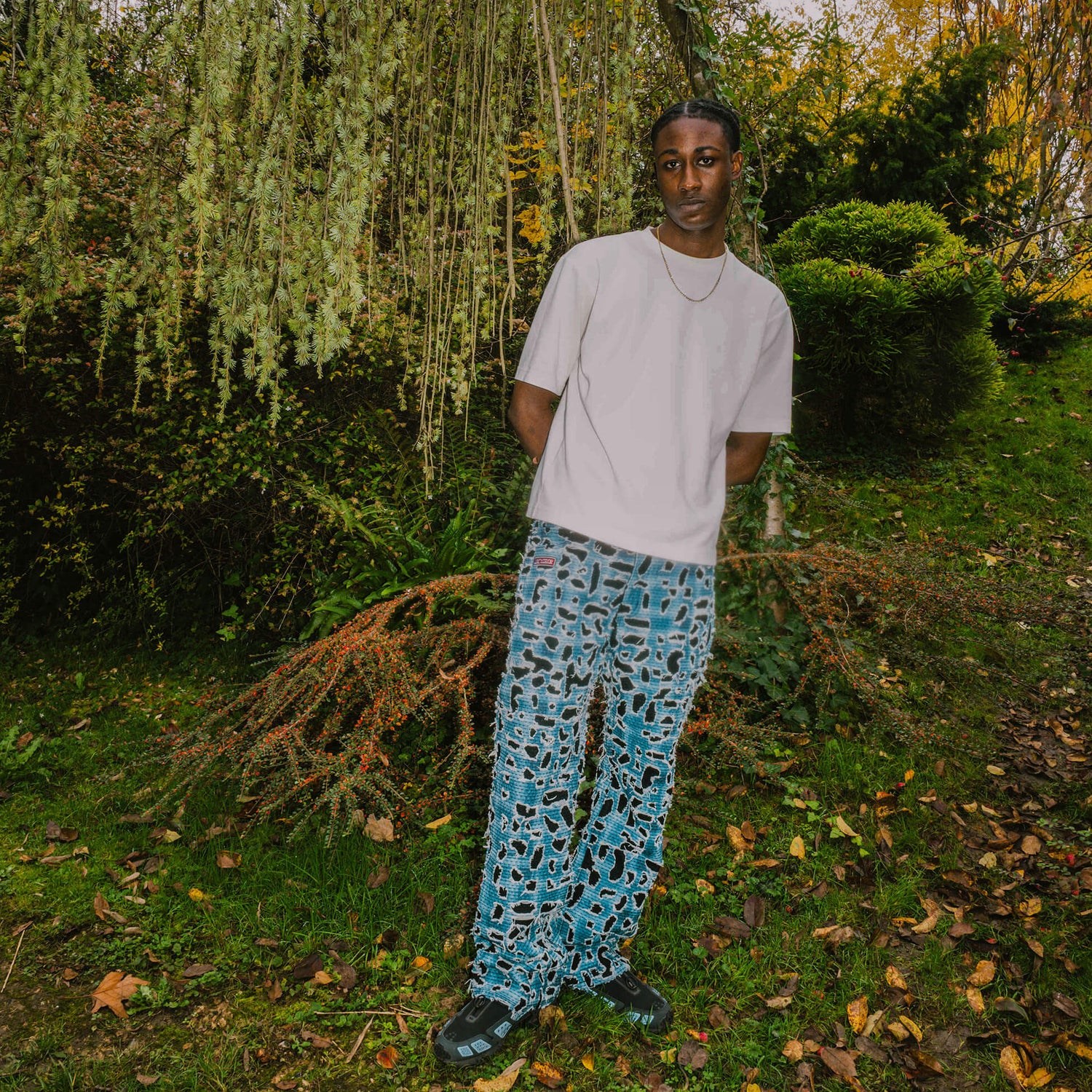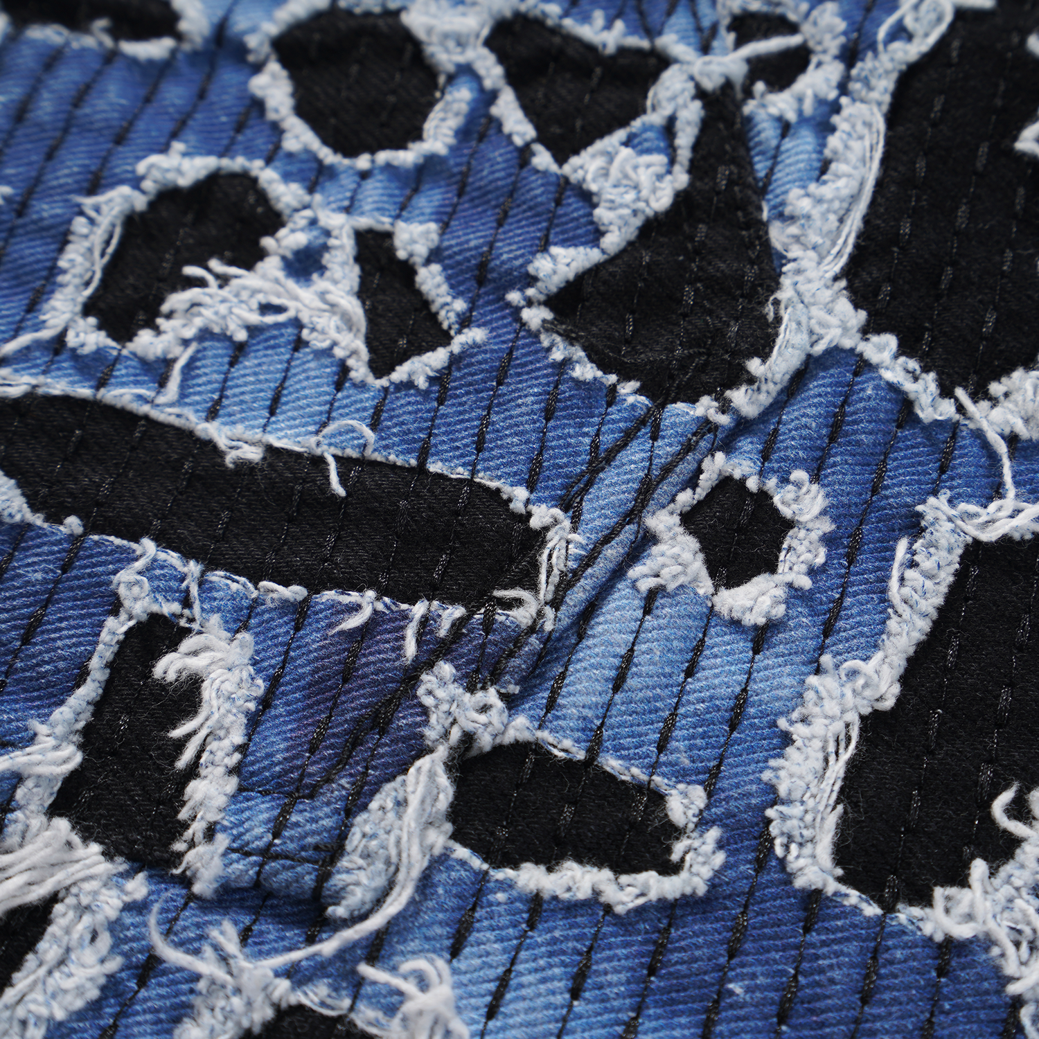Designed by Raf Reyes: these pants embodies boro, a traditional Japanese textile mending technique 🧵~ its blue-black-and-white design reflects the historical patchwork aesthetic, enhanced by sashiko stitching 🪡 over 20 hours of threadwork and distressing give it a unique story, adding life and history 🪡👖~📜.