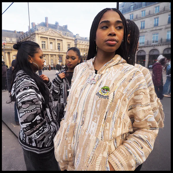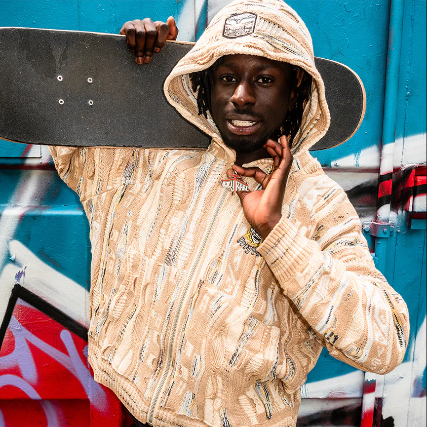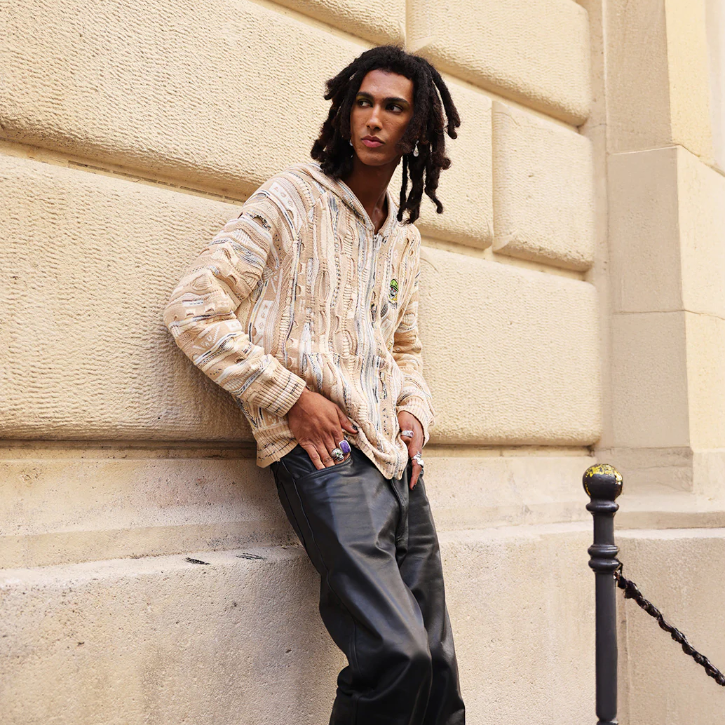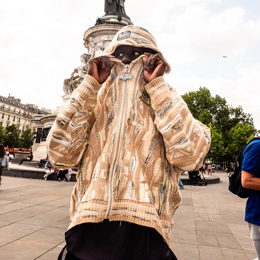 Tech specs: 460gsm mercerized cotton (100%) textured knit crewneck to achieve the softest handfeel producible 🤤 +++ different levels of knittingness raise/relief (& gauge) for extra extra dopeness innit | | | custom-molded enamel'd poured silver puller | | | embroidery + woven tags sewn @ front, hood & back 🪡~