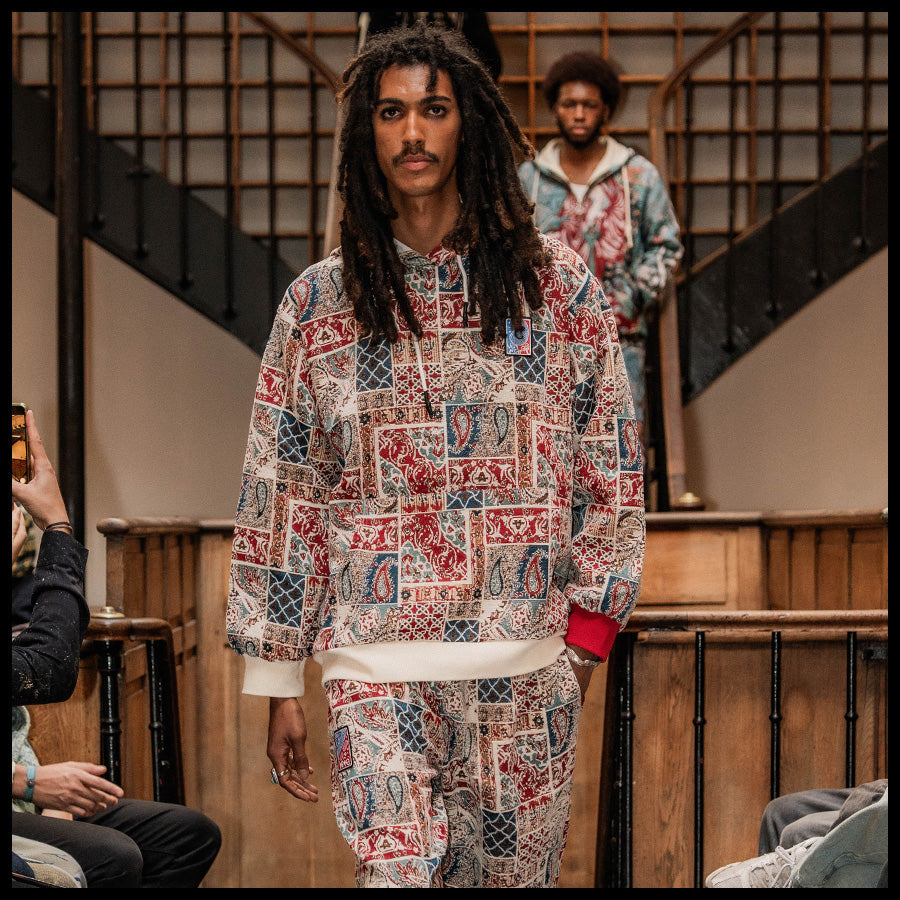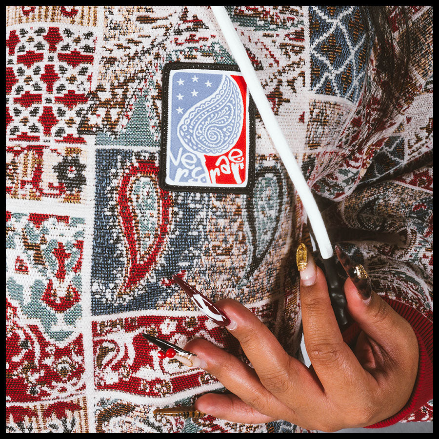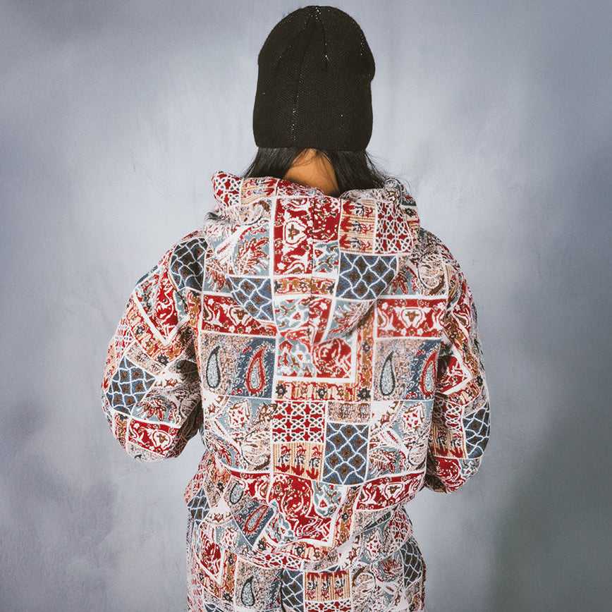 Designed by Raf Reyes: pVRe paisley warfare hoodie, remixing heritage into ᵥrebellion 😤~ the patchwork bleeds reds, blues, and white/earthtones ___like a prayer ᵥrug torn in a street brawl ⚔️--- every panel tells its own twisted story: teardrops & lattice grids cut-and-sewn together like fragments of cultVRe and memory :: it’s east-meets-wild-style, sacred stitched into the secular ⇄ a woven mosaic for the traveler with no map — VERYRARE artwear a borderless flag for the battle-hardened//spirit-marked 🧿🔥.