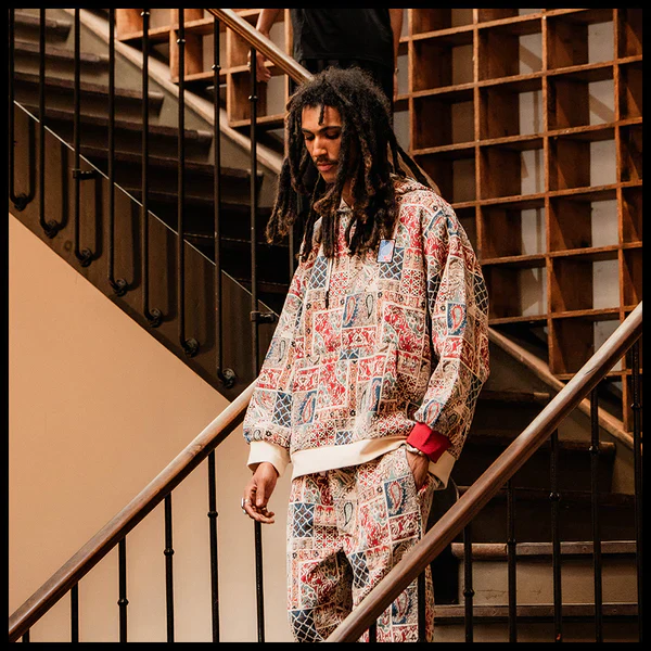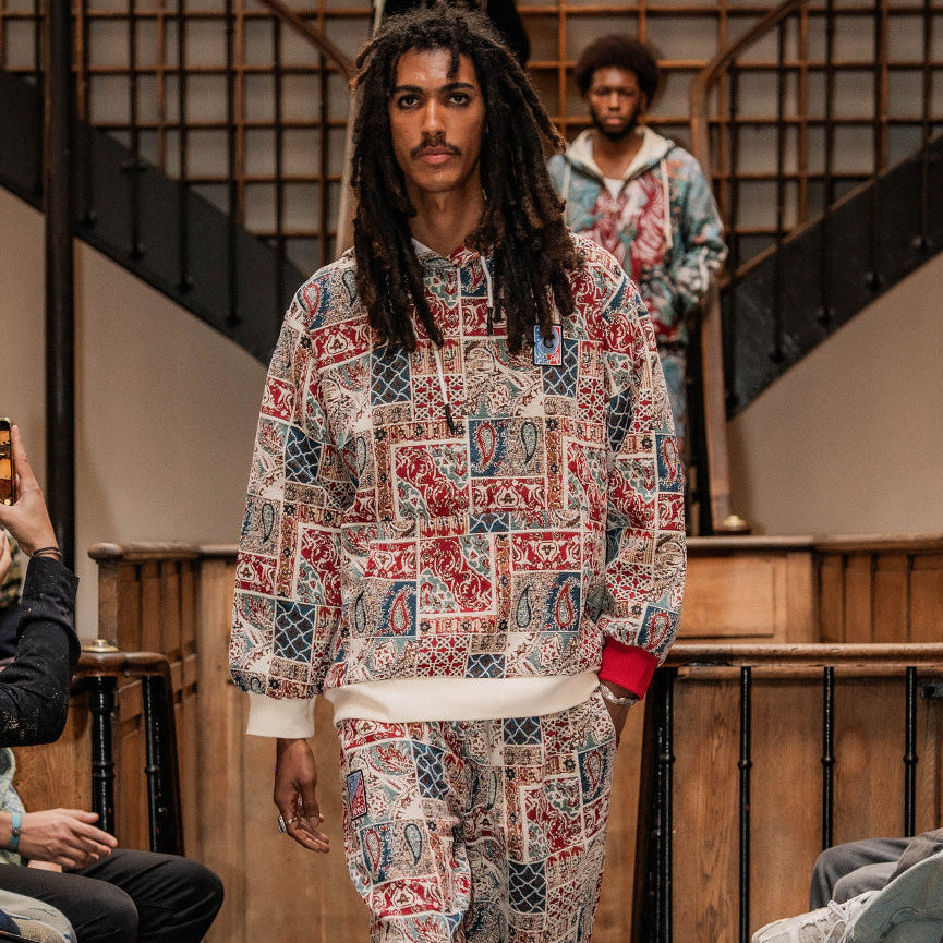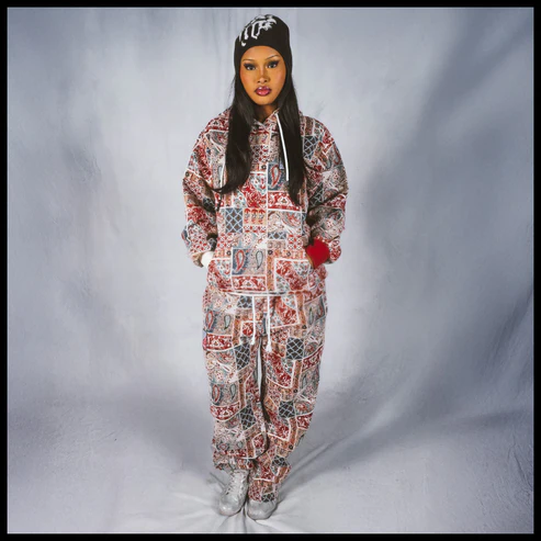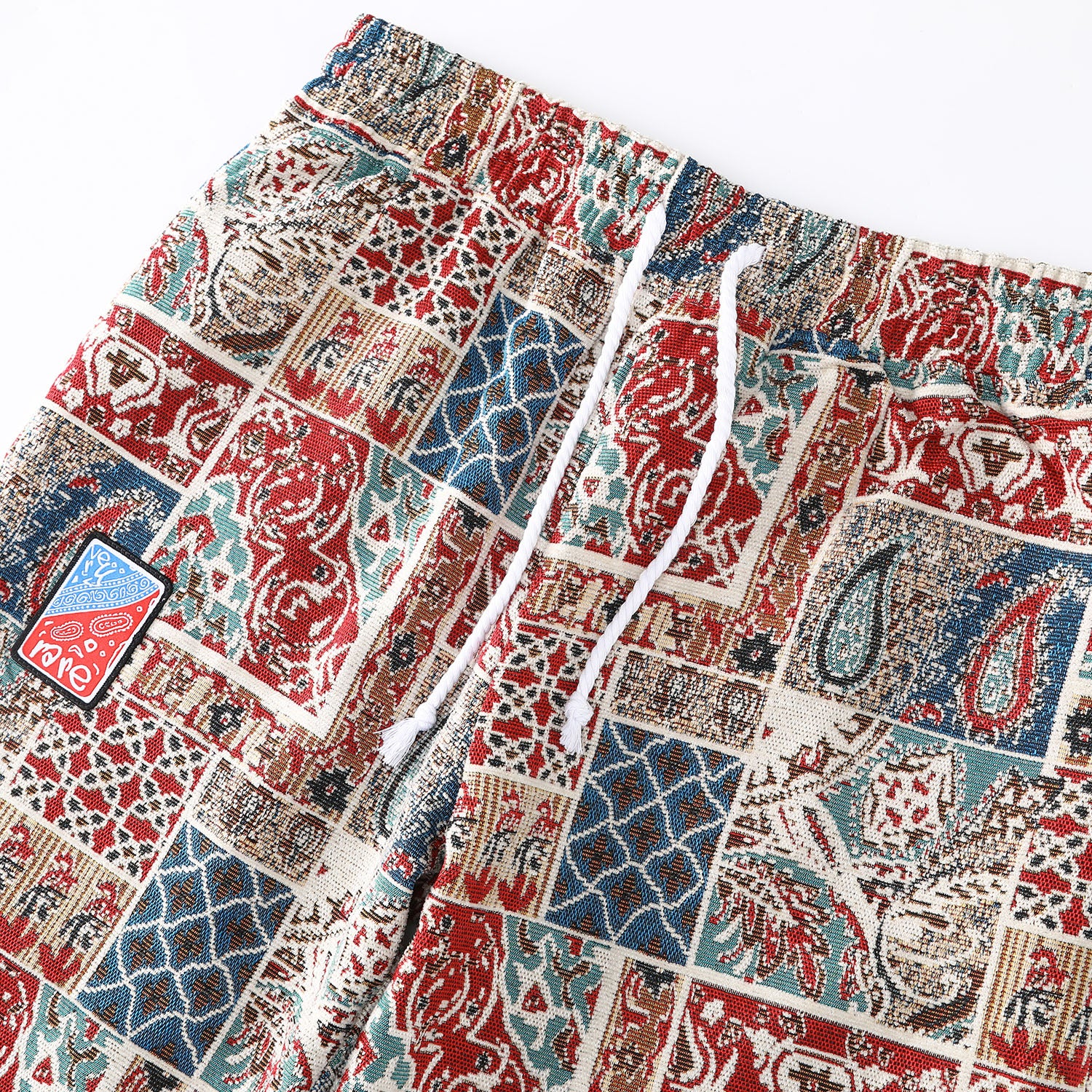 Designed by Raf Reyes: pVRe paisley warfare pants, remixing heritage into ᵥrebellion 😤~ the patchwork bleeds reds, blues, and white/earthtones ___like a prayer ᵥrug torn in a street brawl ⚔️--- every panel tells its own twisted story: teardrops & lattice grids cut-and-sewn together like fragments of cultVRe and memory :: it’s east-meets-wild-style, sacred stitched into the secular ⇄ a woven mosaic for the traveler with no map — VERYRARE artwear a borderless flag for the battle-hardened//spirit-marked 🧿🔥.