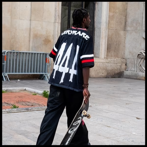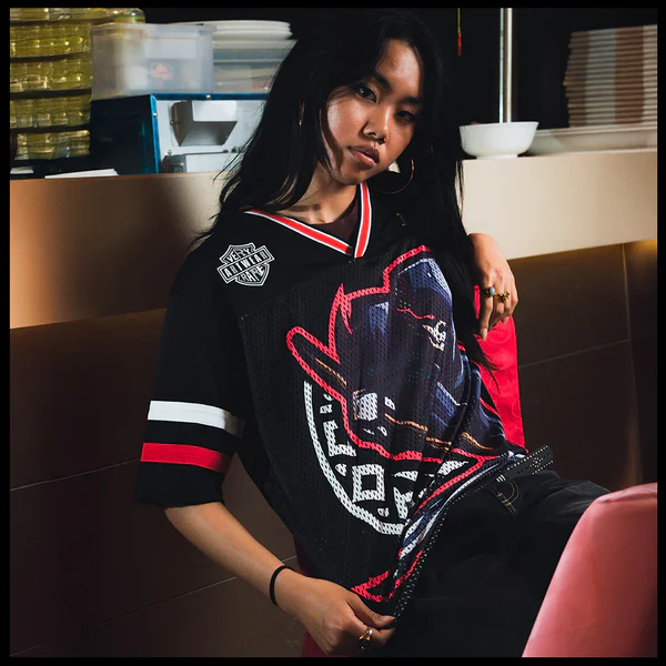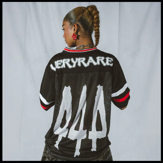 Tech specs: mediumweight ultra-premium mesh jersey (75% polyester | 20% polyamide | 5% cotton) | | | oversized 'ᵥReaper' graphic (@ front) + '444' (@ back) | | | VERYRARE teamwear 'motors' logo & soccer crest printed at front and back on dual-fabric build ⇄ breathable mesh body w/ tighter-knit athletic jersey panel across upper chest & shoulders for contrast & structure | | | athletic stripes 'appliqués' sewn on sleeves + V-neck rib collar | | | loose-cut fit w/ dropped shoulders for flow & breathability.