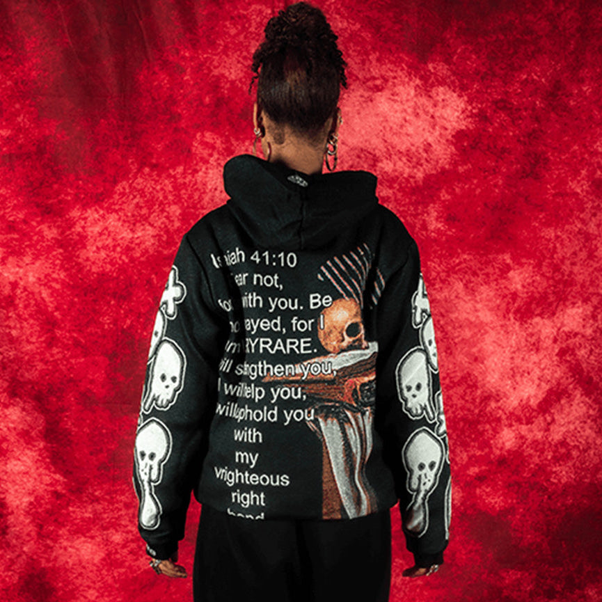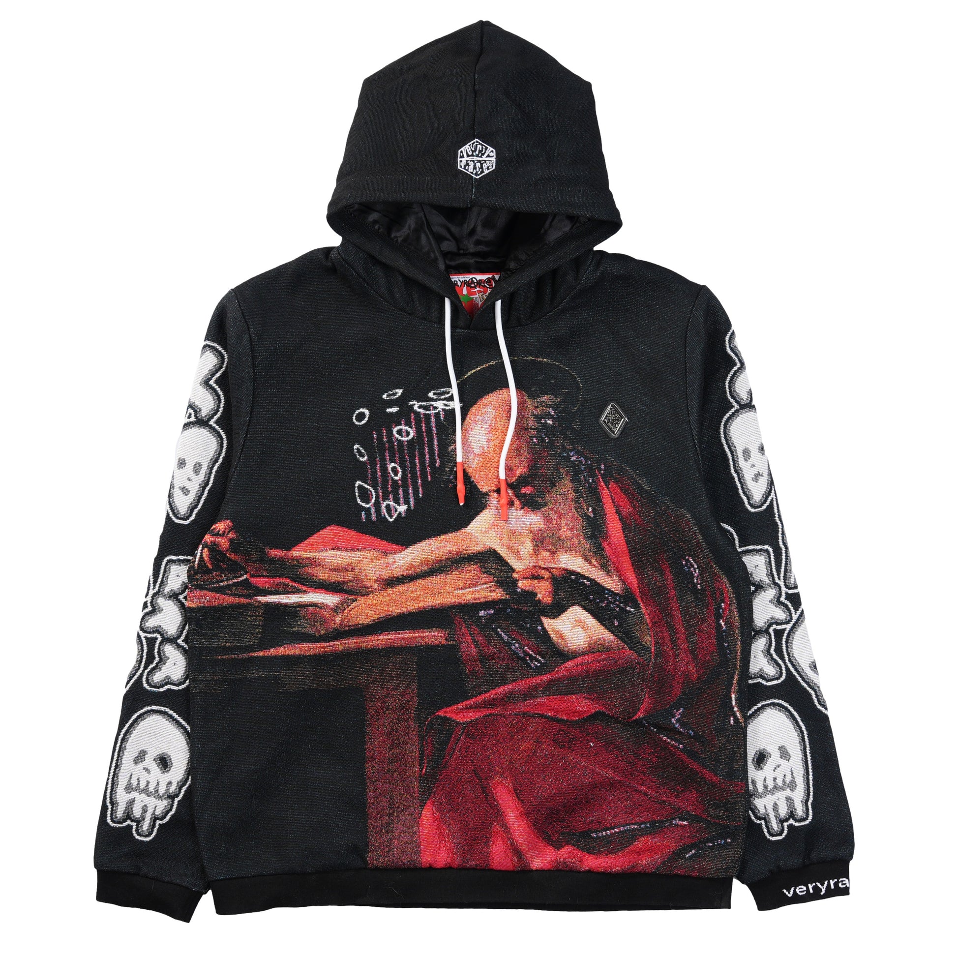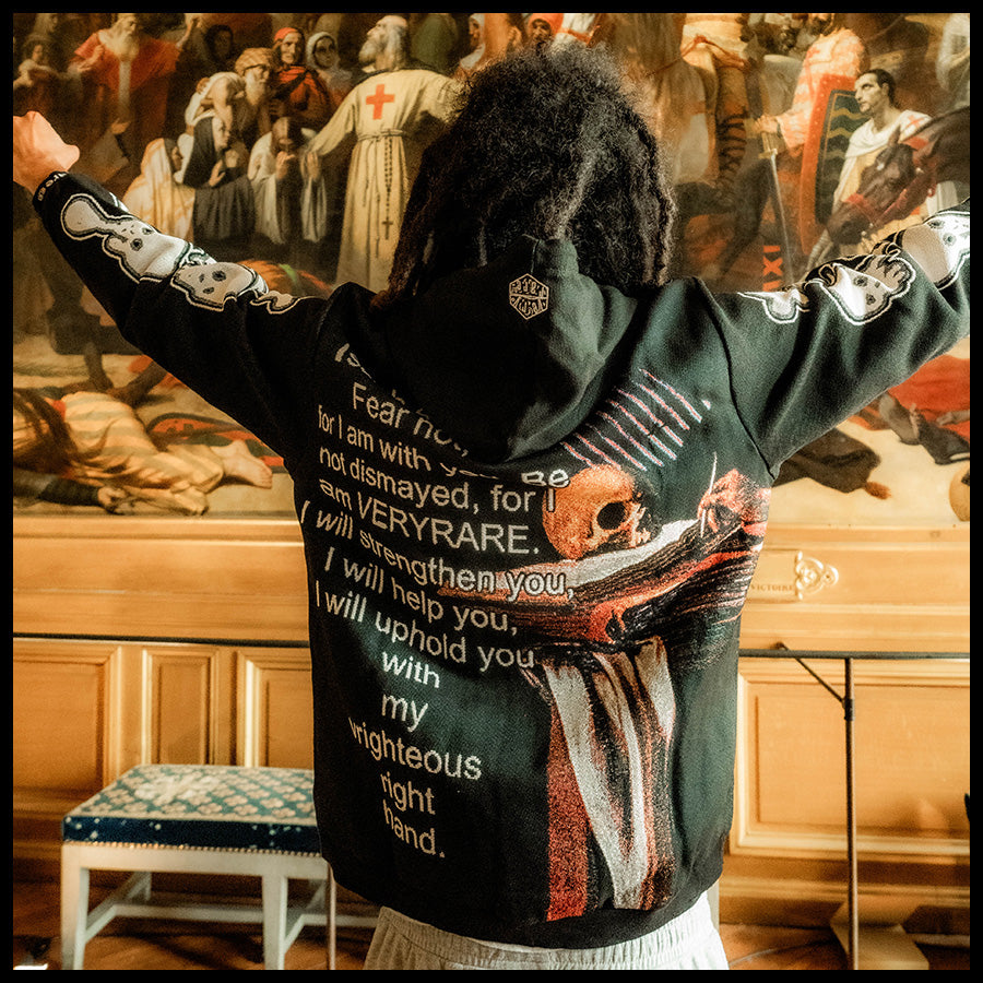 Designed by Raf Reyes: wrestling mortality under candlelight, Caravaggio’s saint Jerome — pen in one hand, skull in the other 💀🖊️~ Vanitas, injected with 21st-century dread: floating glyphs, Isaiah 41:10 ᵥrepurposed as defiance, not comfort 😤:: “I am VERYRARE” becomes gospel innit 📜--- in blood & ink, we uphold ourselves with our own ᵥrighteous hand 🙏 amen.