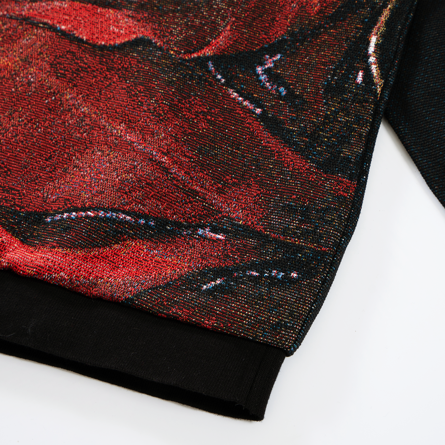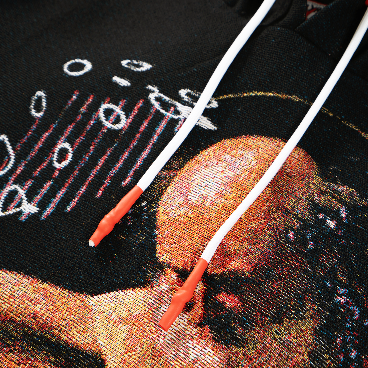 Tech specs: premium jacquard woven tapestry fabric (410gsm polycotton), satin silk lining (inside *fully*), metal-enamel-leather 'appliqué' patch at front, logo embroidery at hood, enamel-coated eyelets, tight-knitt’d drawcords (with compression/coated matte tips), 100% wool ribbings @ bottom & sleeves (w/ intarsia logo at cuffs) ~