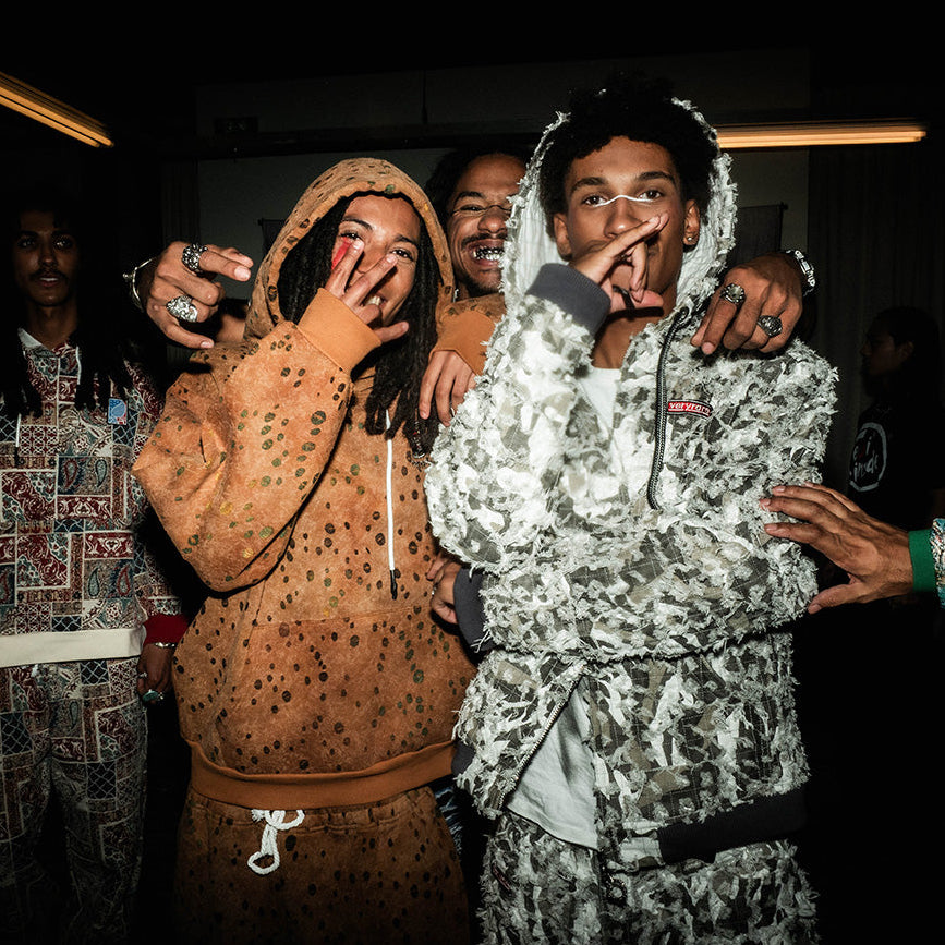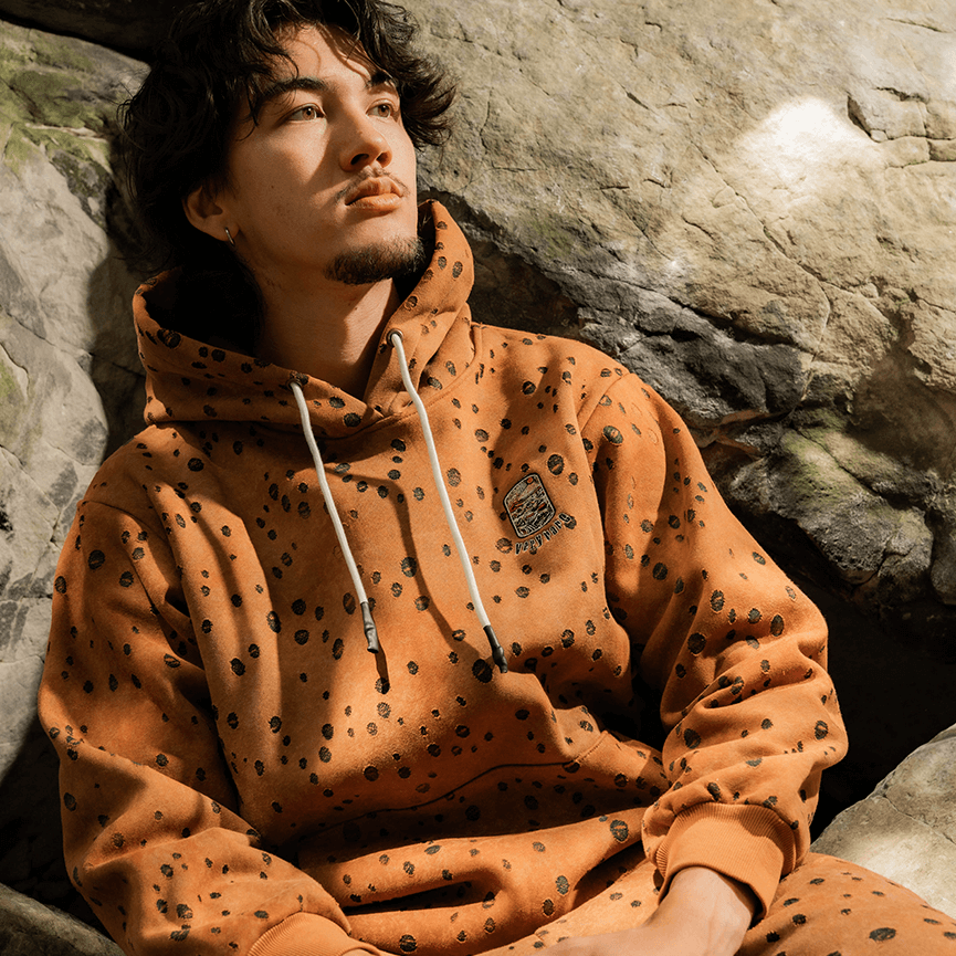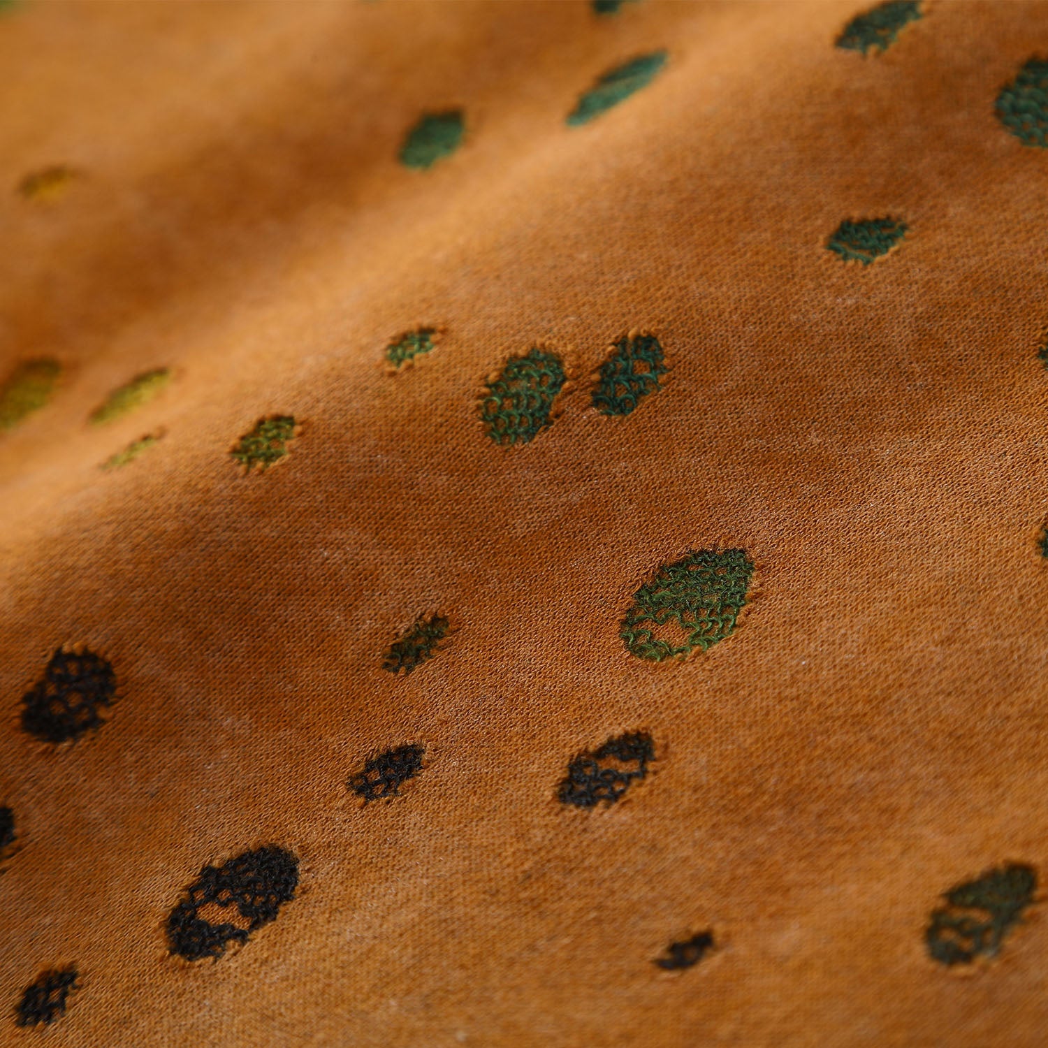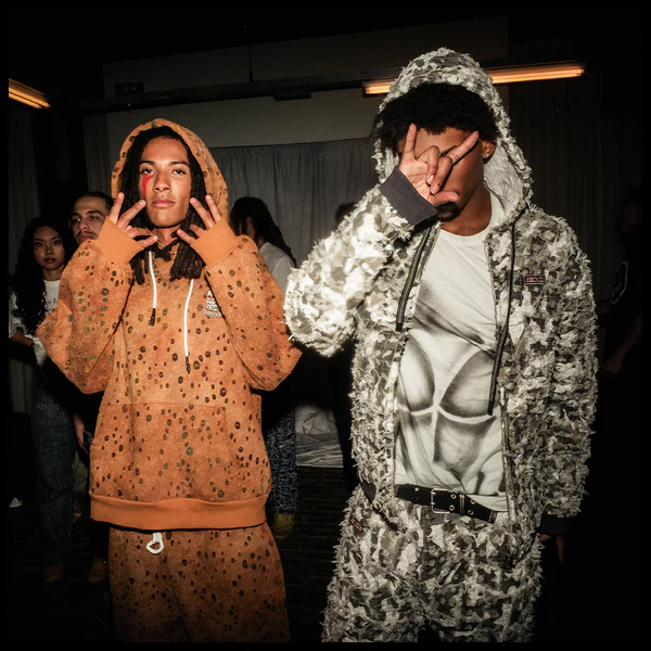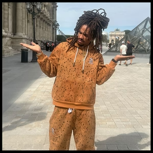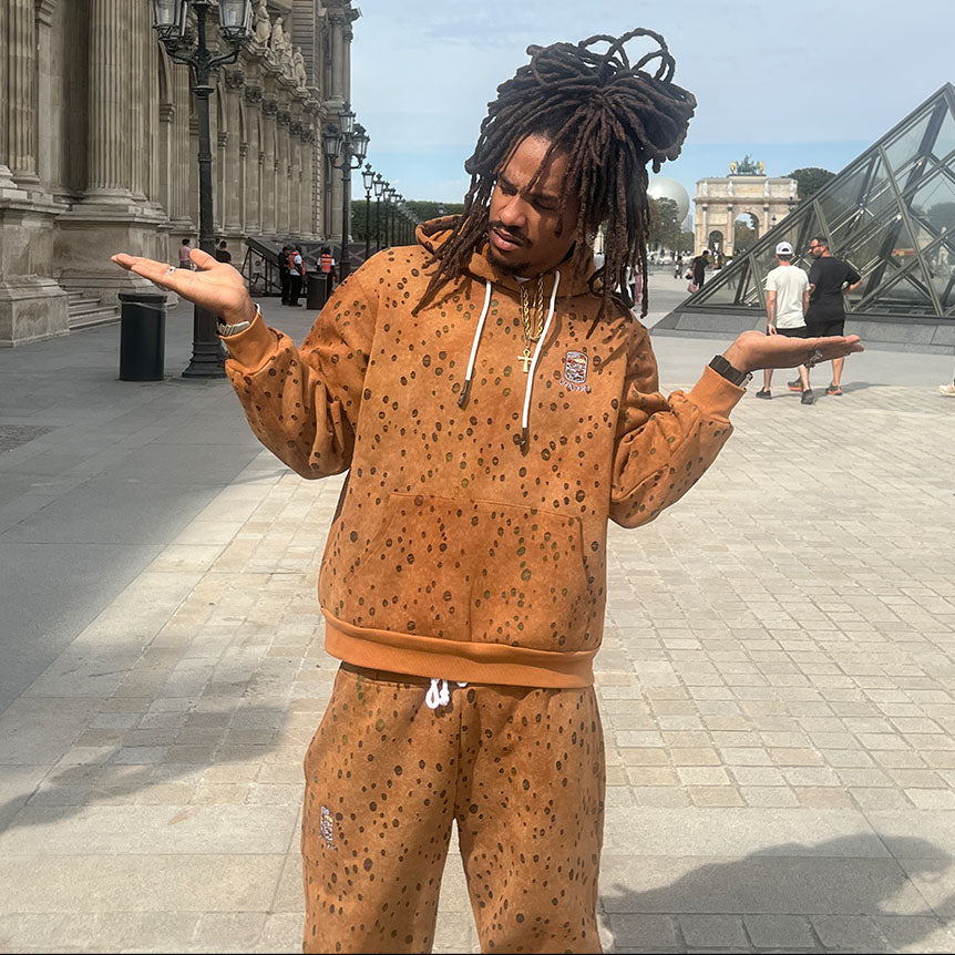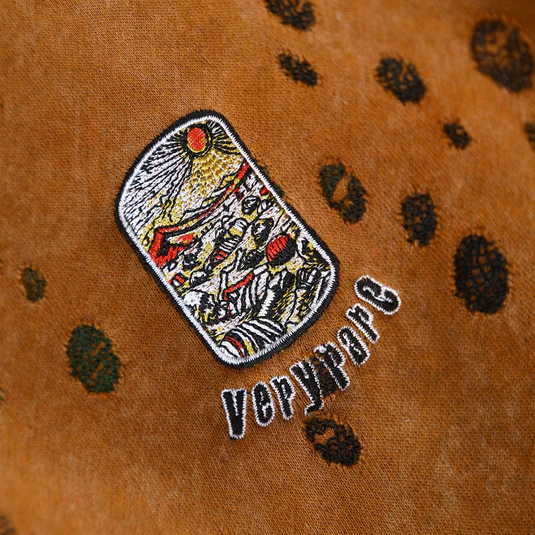 Designed by Raf Reyes: sun-scorched and soul-dried [...] these french terry hoodie look like they’ve been dragged through a desert battlefield & left under a dying sky 🏜️~ the base is sun-fade ochra-colored, freckled with ᵥraw burn-holes and necro-dots like blood spray on parched sand ‼️☠️🔥— VERYRARE for the damned & tha dustbound 😤.