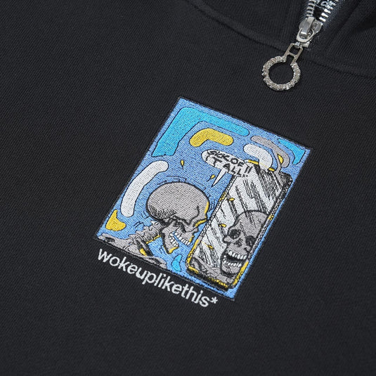 Designed by Raf Reyes: a skeleton stares into the mirror and ᵥrecoils with a startled ""sick of it all!"" exclamation — the ultimate morning surprise i.e that moment of existential shock, realizing you’re nothing but bones, no flesh, no identity, just a stripped-down version of yourself 🪞:: the caption ""wokeuplikethis"" adds a layer of ironic humor, flipping a modern phrase into a grim punchline 💬 ⇄ this is the deadpan horror of waking up to the ᵥraw truth, where vanity doesn't stand a chance and all that’s left is bone-deep ᵥreality [👁️].
