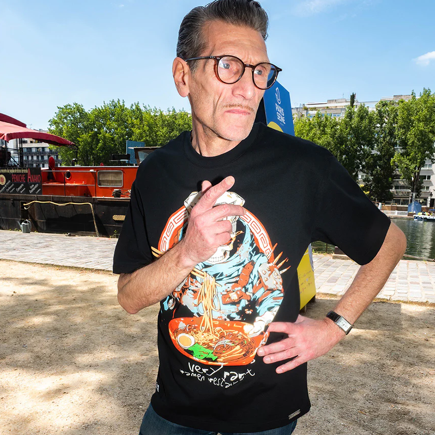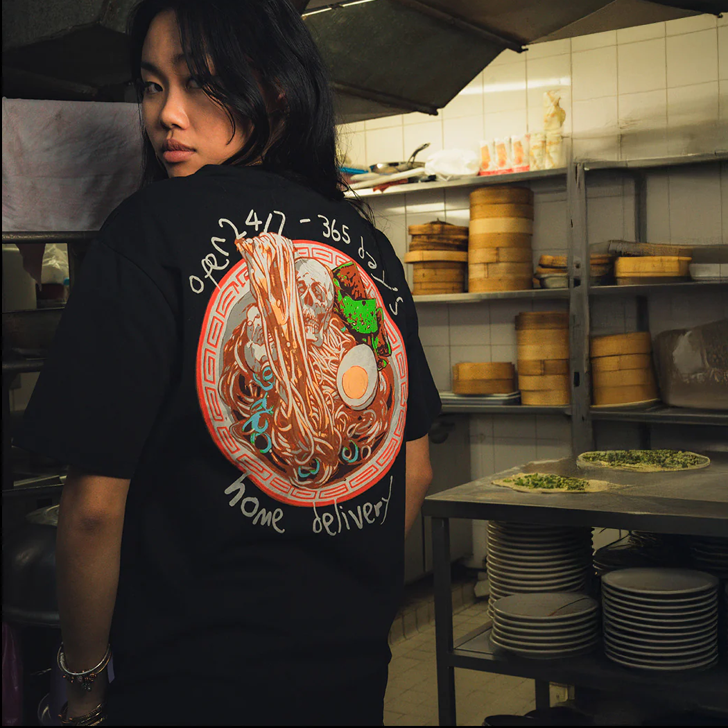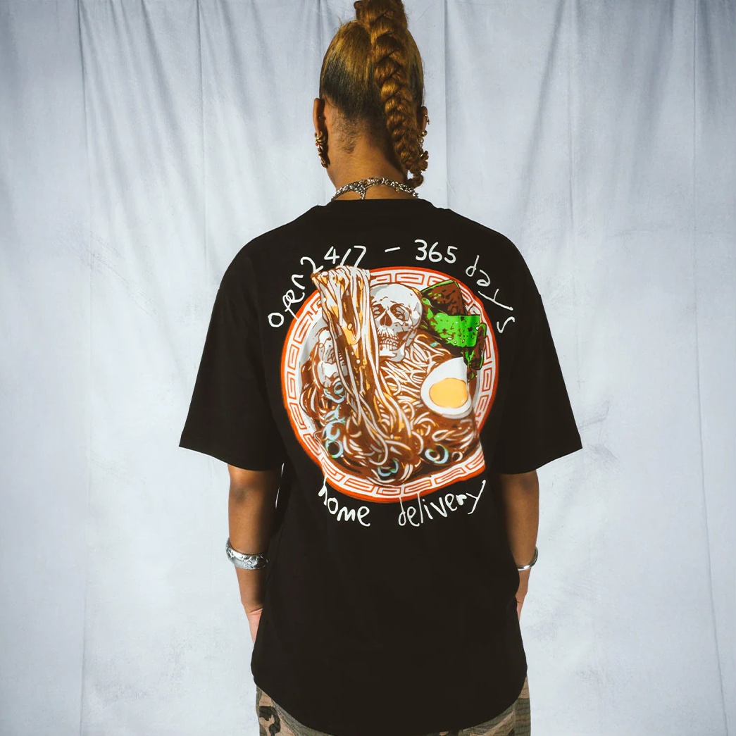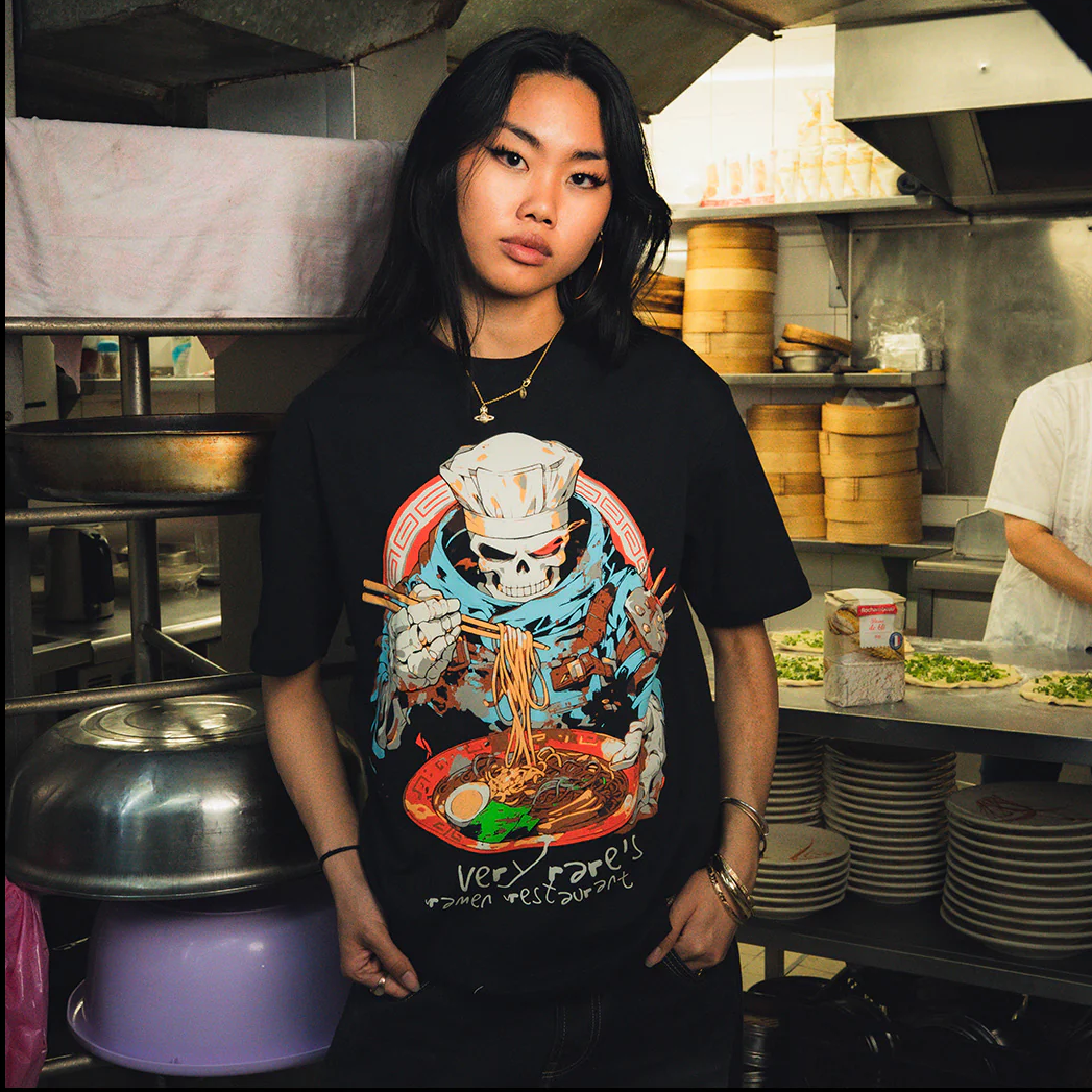 Designed by Raf Reyes: over at ""VERYRARE ᵥRamen"" (joint), a skeletal chef works tirelessly, crafting bowls of ramen for lost souls & crooked spirits 🍜~ with his bony hands expertly twirling noodles, the broth simmers with an eerie glow under the dim light --- open 24/7, this soba spot is a sanctuary for the ᵥrestless, where each slurp offers a moment of peace in the afterlife 🪦~ the chef, with his hollow grin & quiet skill, serves the wandering, filling empty voids with warmth, flavor, and an eternal whisper of comfort 🥘♨️.