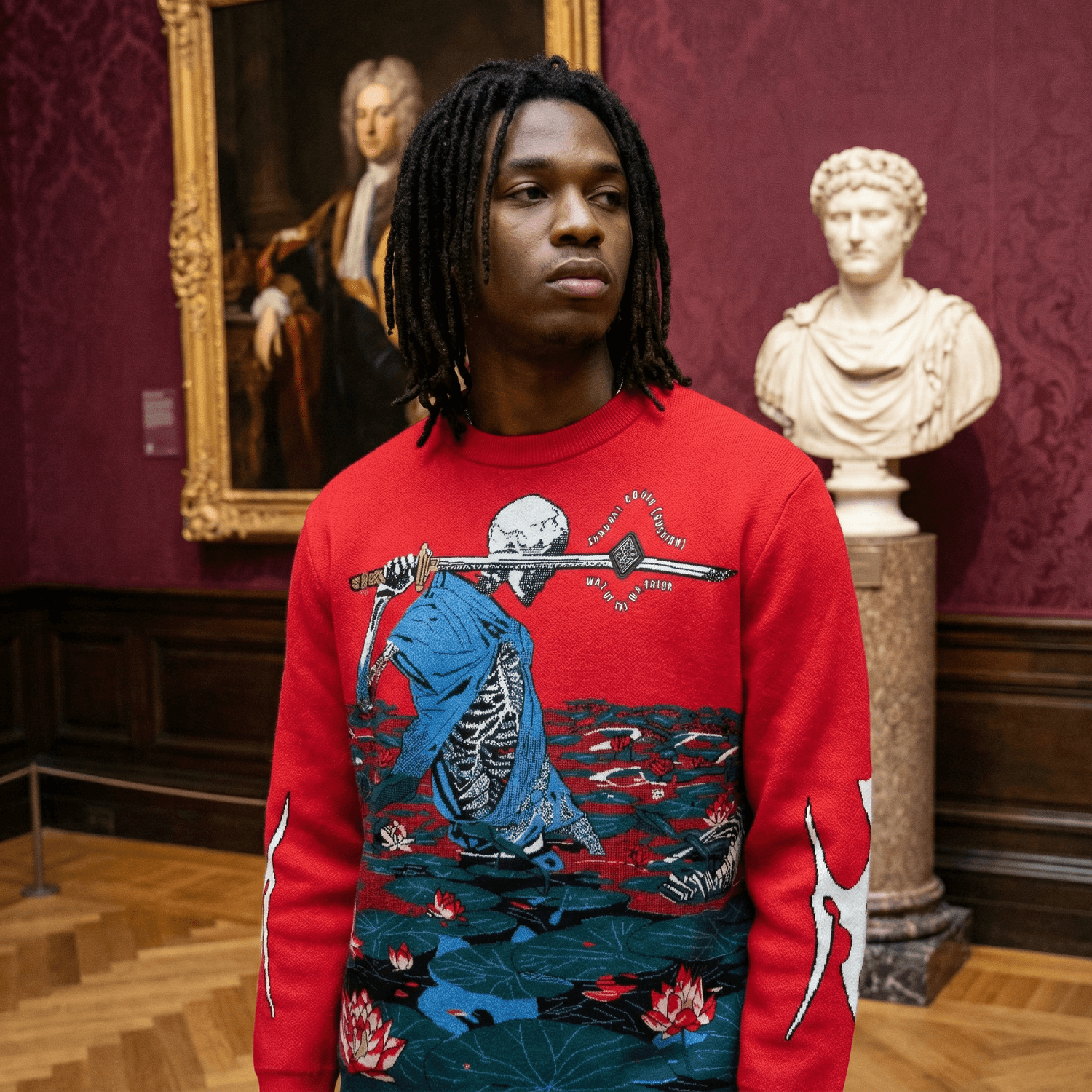 Designed by Raf Reyes: a skeletal warrior wanders the crimson swamp of the underwVRld, blade drawn, spirit unbroken 💀☠️ surrounded by lotus — symbols of purity born from mud — he fights long after death, tethered by honor 🥷 @ back: his final ᵥrest, sword grounded beside him, virtues engraved in fiber/fabric — justice, courage, integrity, honor, compassion, ᵥrespect, loyalty, self-control ⇄ this is no myth, it's tha code etched into bone i.e tha bushidō ᵥrequiem baby!!! ⚔️~ VERYRARE immortalizes the vow: to die standing for something ⇄ never kneeling for anything 🙏📿.