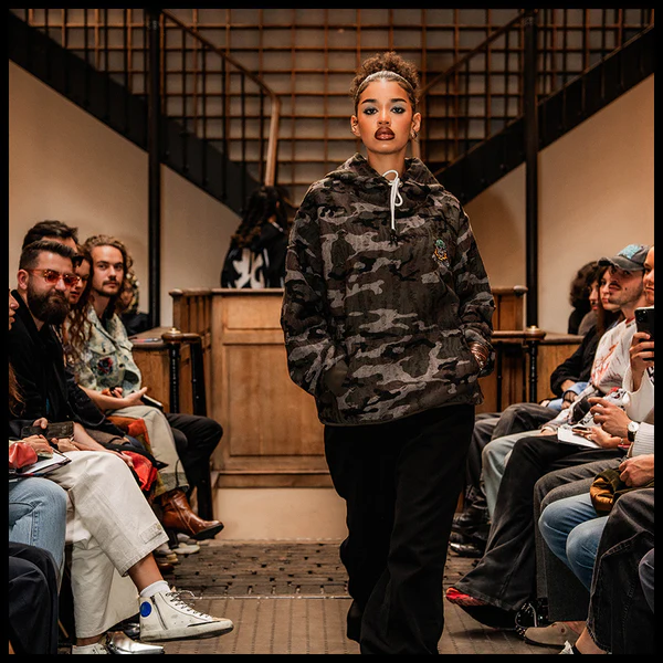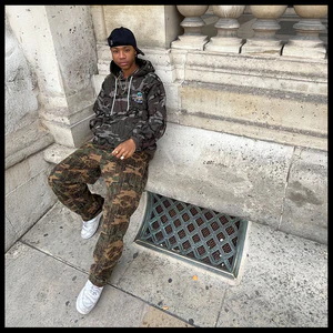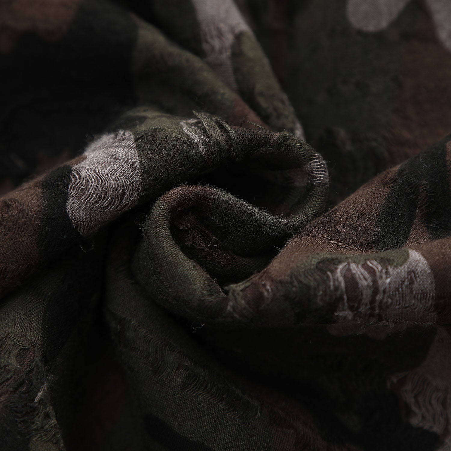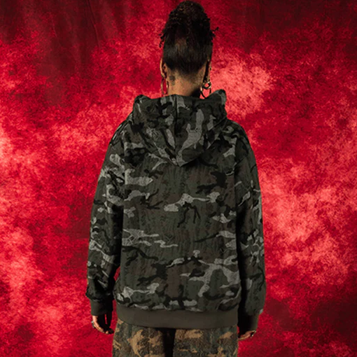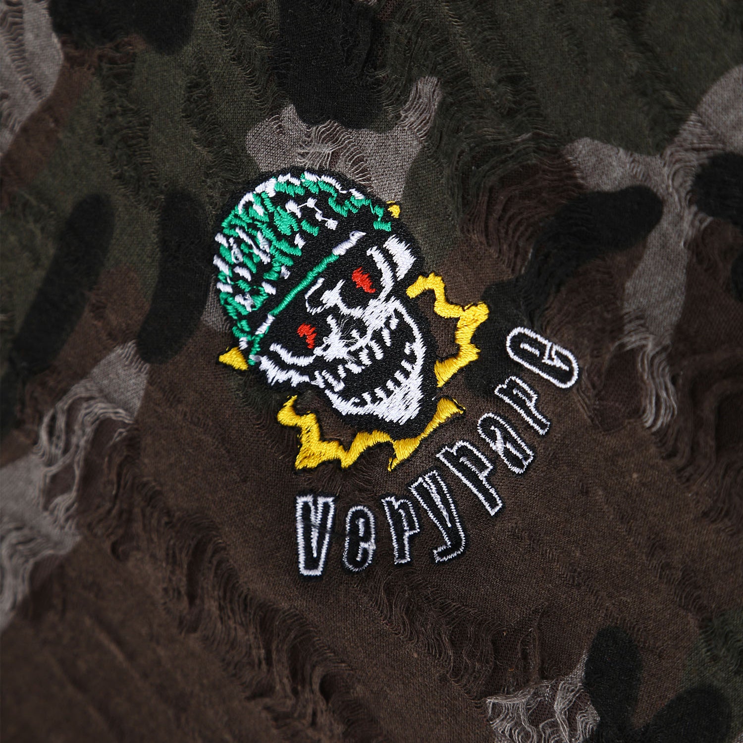 Designed by Raf Reyes: jungle-core with a vengeance 😤~ this hoodie rip through the foliage in camo frayed like they’ve seen combat | | | distressed to hell, the surface unravels into texture — wild, raw, alive [...] trooper's skull's outti with the eyes locked in, no blinkin' — warrior energy only 🪖--- you’re not hidin', u’re huntin' ⇄ VERYRARE™ ⚔️.