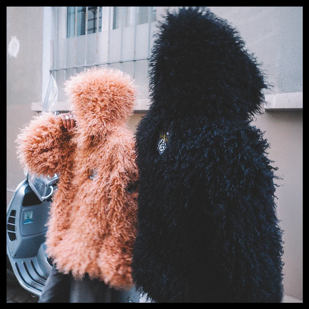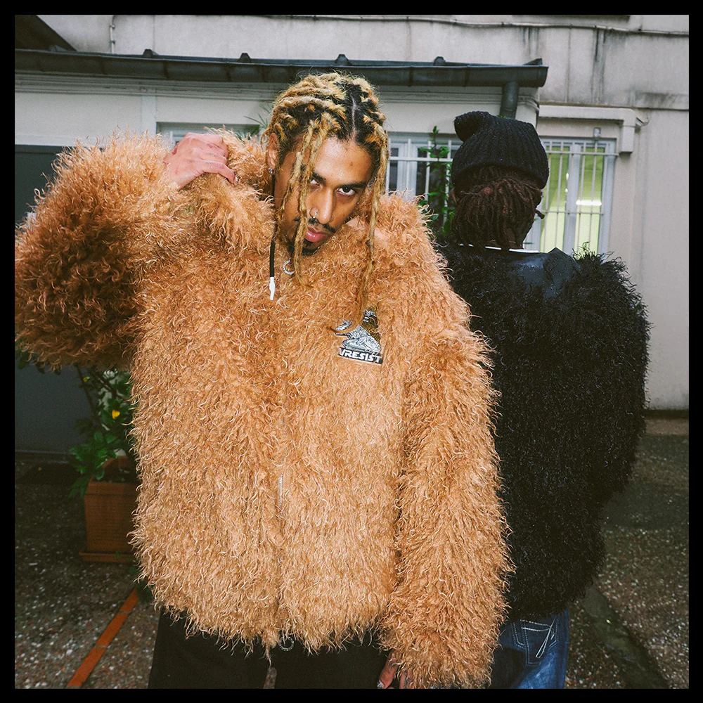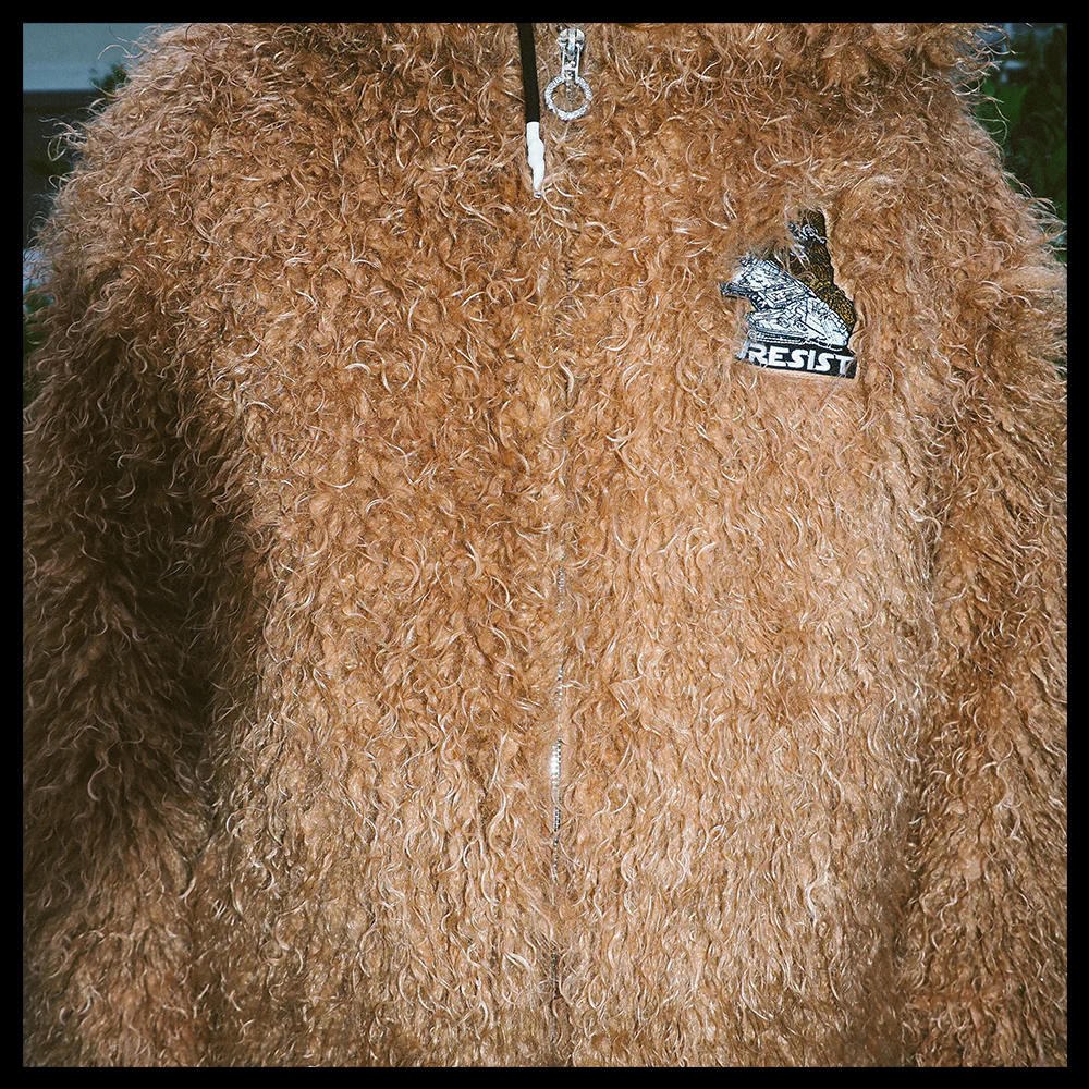 Tech specs: a strikingly graphic faux-mongolian-fur zip-up jacket designed to be worn and treated as a staple piece for real | made from a very-soft sheep wool inspired fabric w/ a tousled effect/shaggy-hair due to the long-pile faux fur with extra-long length innit | | | | | boxy cut, suede piping around central zip closure fastening, real leather for outer pockets' exterior | body/shell : 100% polyester | | | cotton lining | | embroideries (at front, sleeve, and back).