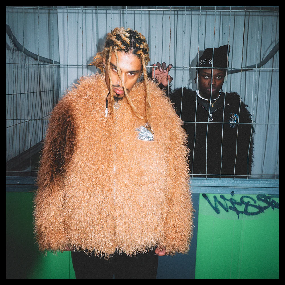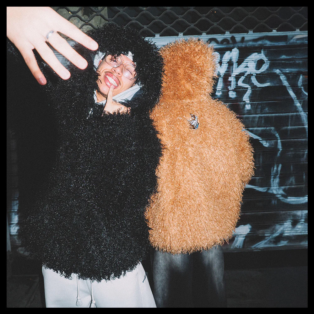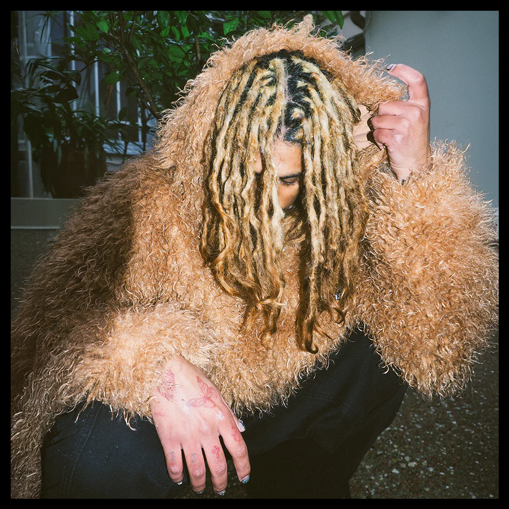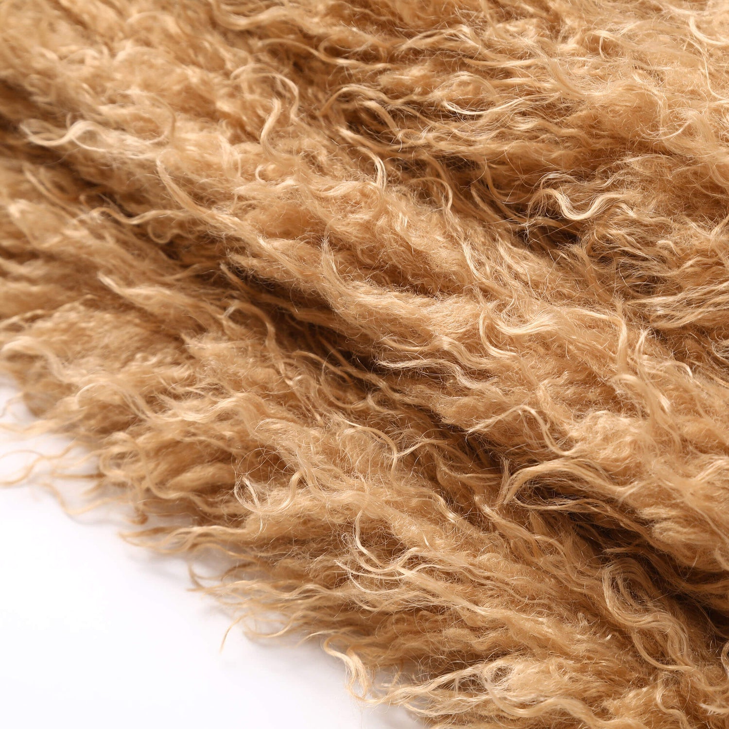 Tech specs: a strikingly graphic faux-mongolian-fur zip-up jacket designed to be worn and treated as a staple piece for real | made from a very-soft sheep wool inspired fabric w/ a tousled effect/shaggy-hair due to the long-pile faux fur with extra-long length innit | | | | | boxy cut, suede piping around central zip closure fastening, real leather for outer pockets' exterior | body/shell : 100% polyester | | | cotton lining | | embroideries (at front, sleeve, and back).
