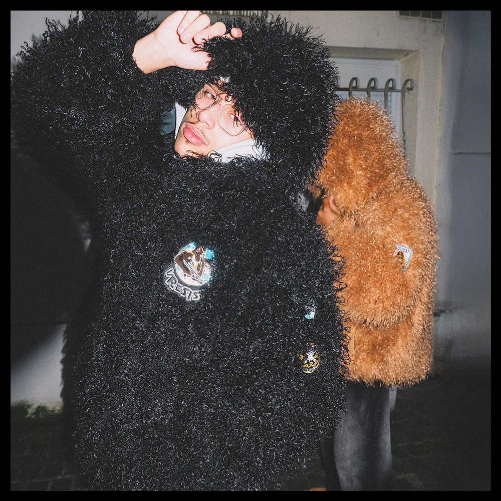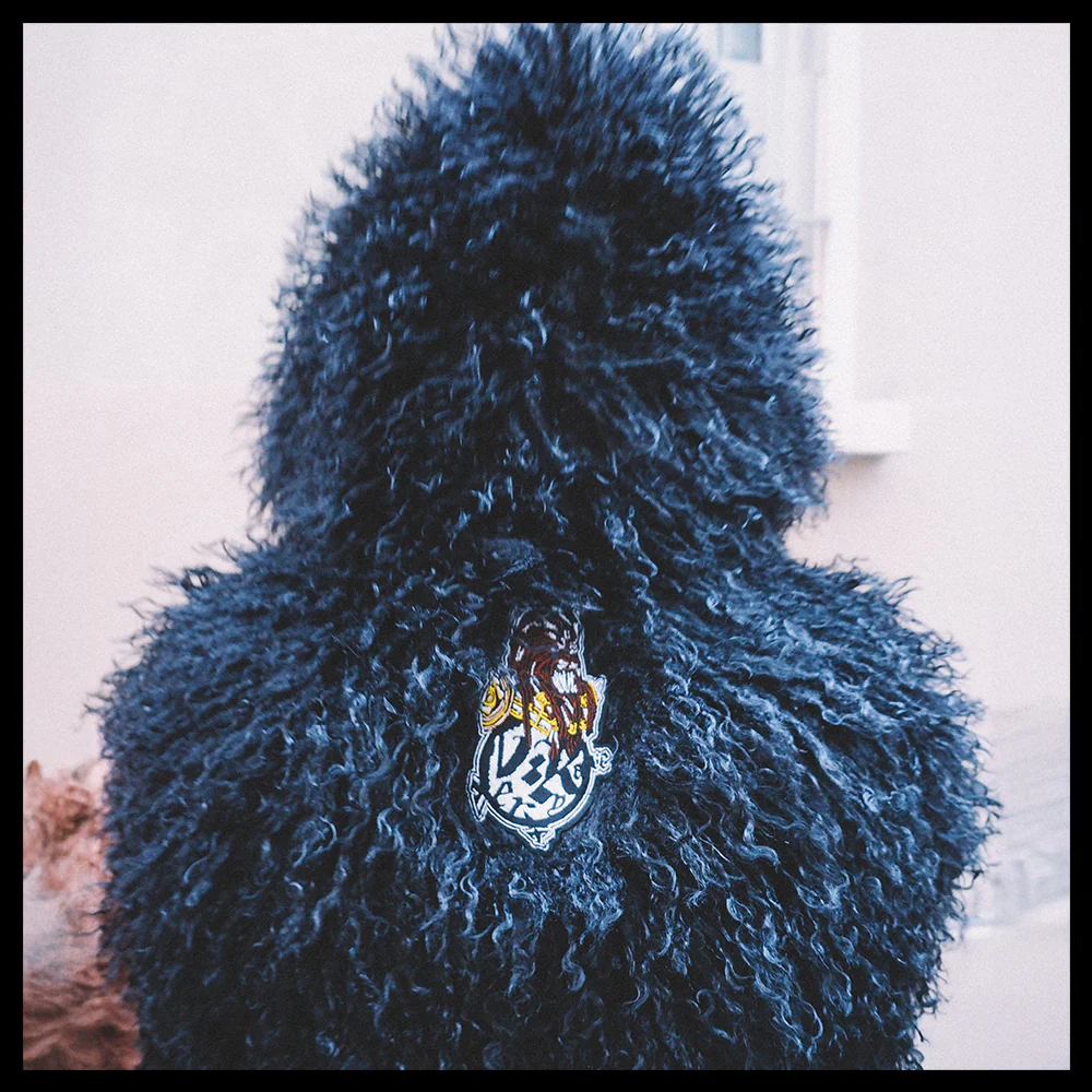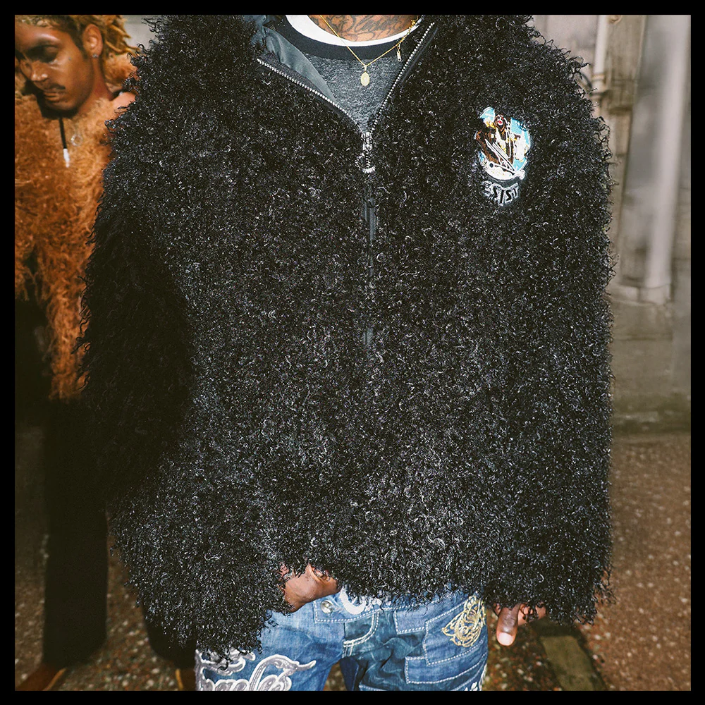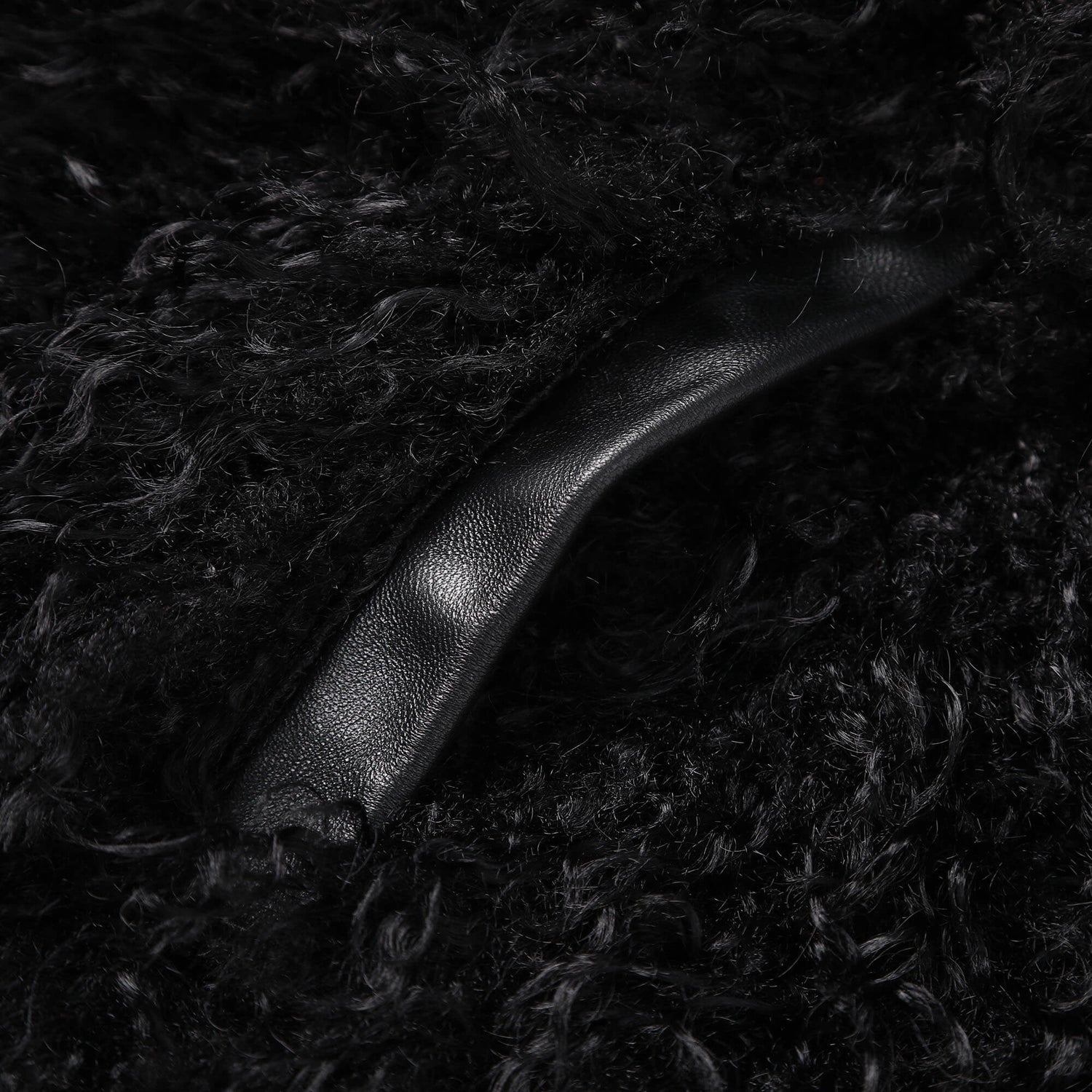 Tech specs: a strikingly graphic faux-mongolian-fur zip-up jacket designed to be worn and treated as a staple piece for real | made from a very-soft sheep wool inspired fabric w/ a tousled effect/shaggy-hair due to the long-pile faux fur with extra-long length innit | | | | | boxy cut, suede piping around central zip closure fastening, real leather for outer pockets' exterior | body/shell : 100% polyester | | | cotton lining | | embroideries (at front, sleeve, and back).