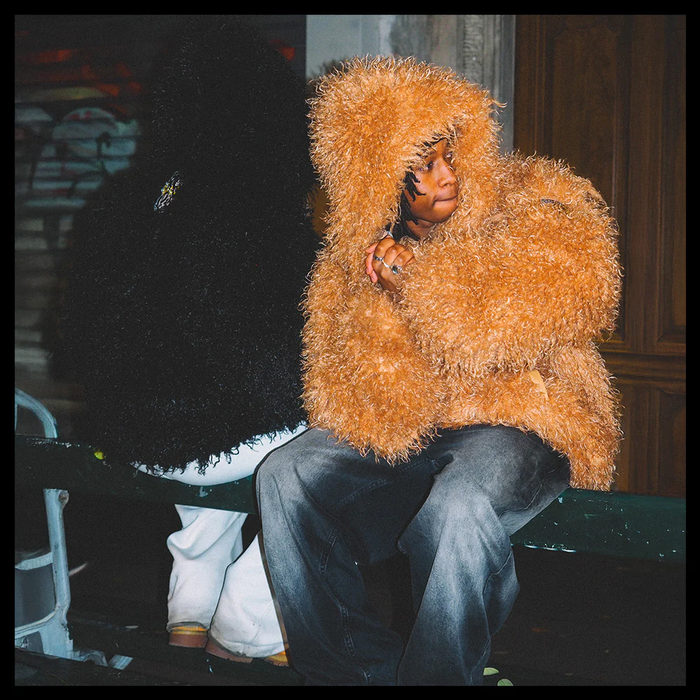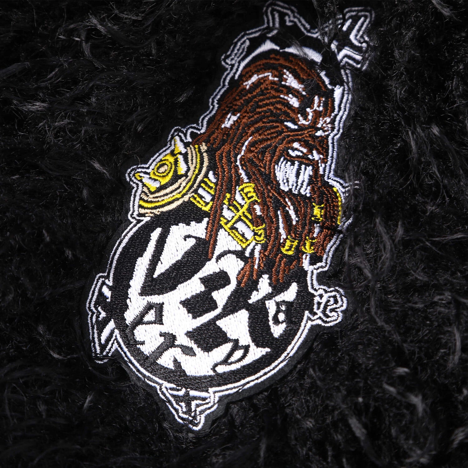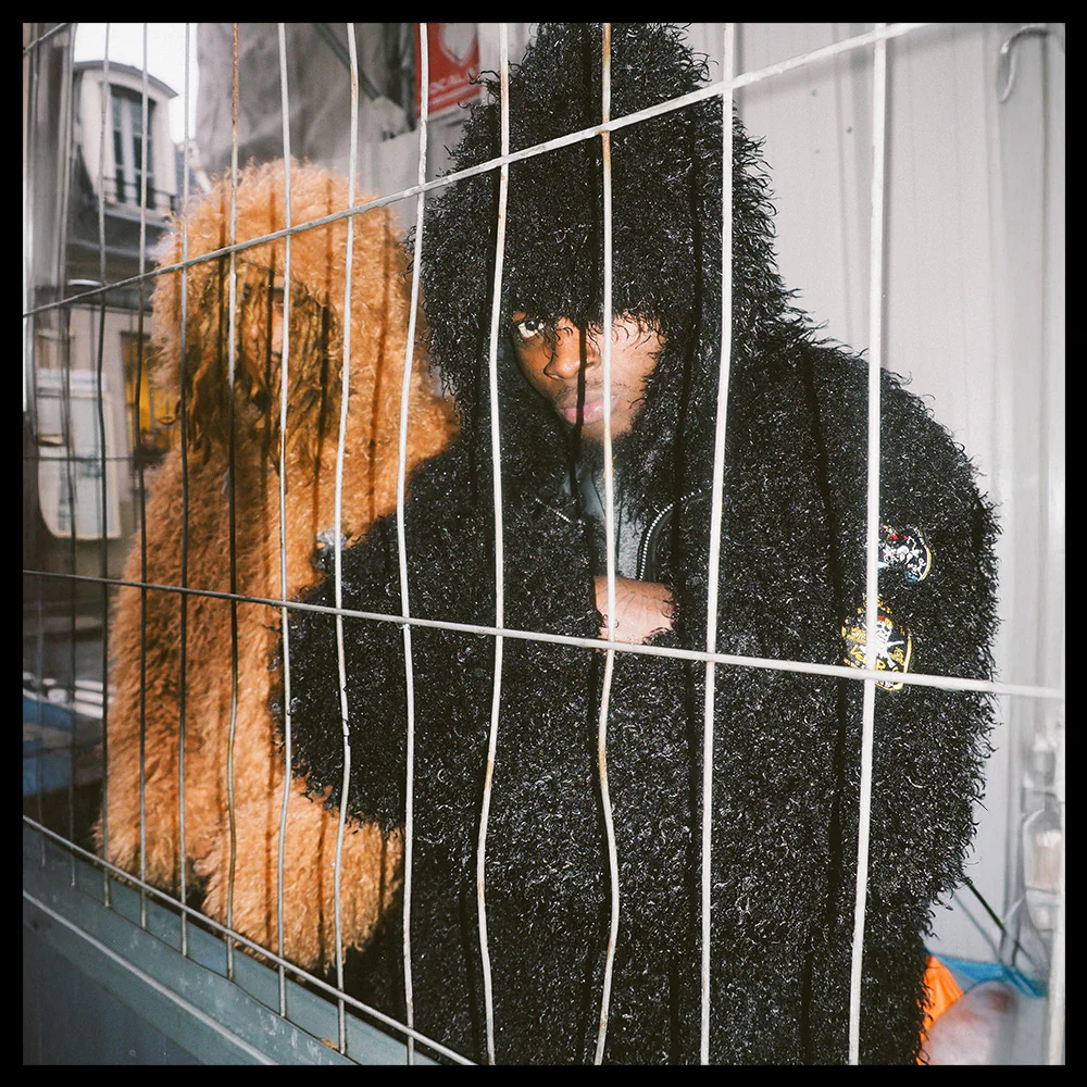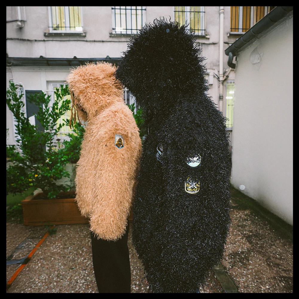 Tech specs: a strikingly graphic faux-mongolian-fur zip-up jacket designed to be worn and treated as a staple piece for real | made from a very-soft sheep wool inspired fabric w/ a tousled effect/shaggy-hair due to the long-pile faux fur with extra-long length innit | | | | | boxy cut, suede piping around central zip closure fastening, real leather for outer pockets' exterior | body/shell : 100% polyester | | | cotton lining | | embroideries (at front, sleeve, and back).