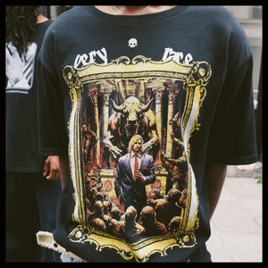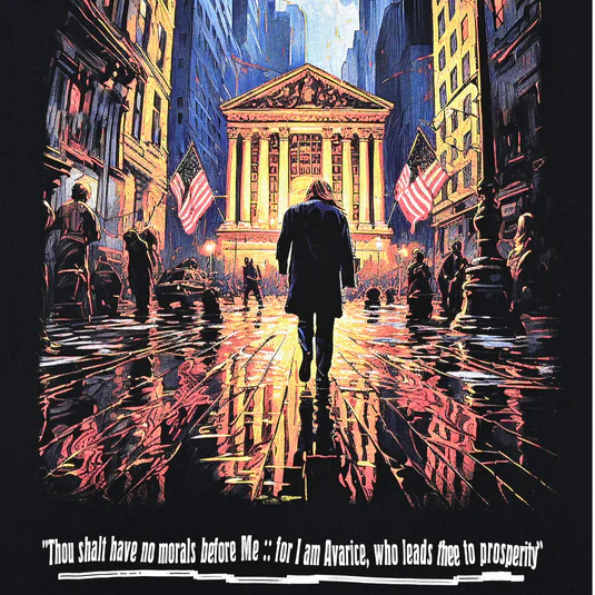 Designed by Raf Reyes: a man in purple & red symbolizes power amidst tha wealth frenzy 🏦~ spectral figVRes & a monstrous bull warn of unchecked/breakneck capitalism ⚔️ ⇄ a cautionary tale overall in the crazy political climate we're living in presently | | | @ back the rain adds signification behind capitalism's might & moral ambiguities 💵~ his solitary journey makes one ponder capital sin 'greed', awakening to values beyond wealth, questioning capitalism's progress | | | contemplatin' ethical compromise within a crooked system 💰💸.
