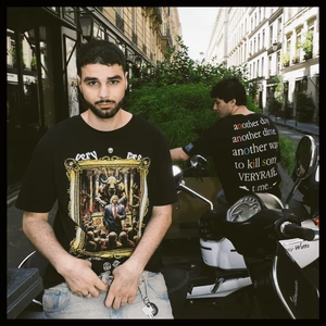 Tech specs: 100% cotton (210gsm) (bio-washed) (softest handfeel producible) | discharge prints (fusing naturally with the fabric) ⇄ non-plasticky ⇄ super cushy/comfortable to the touch | reflective embroideries @ front +++ embossed custom-molded metal tag at bottom.