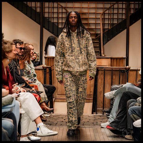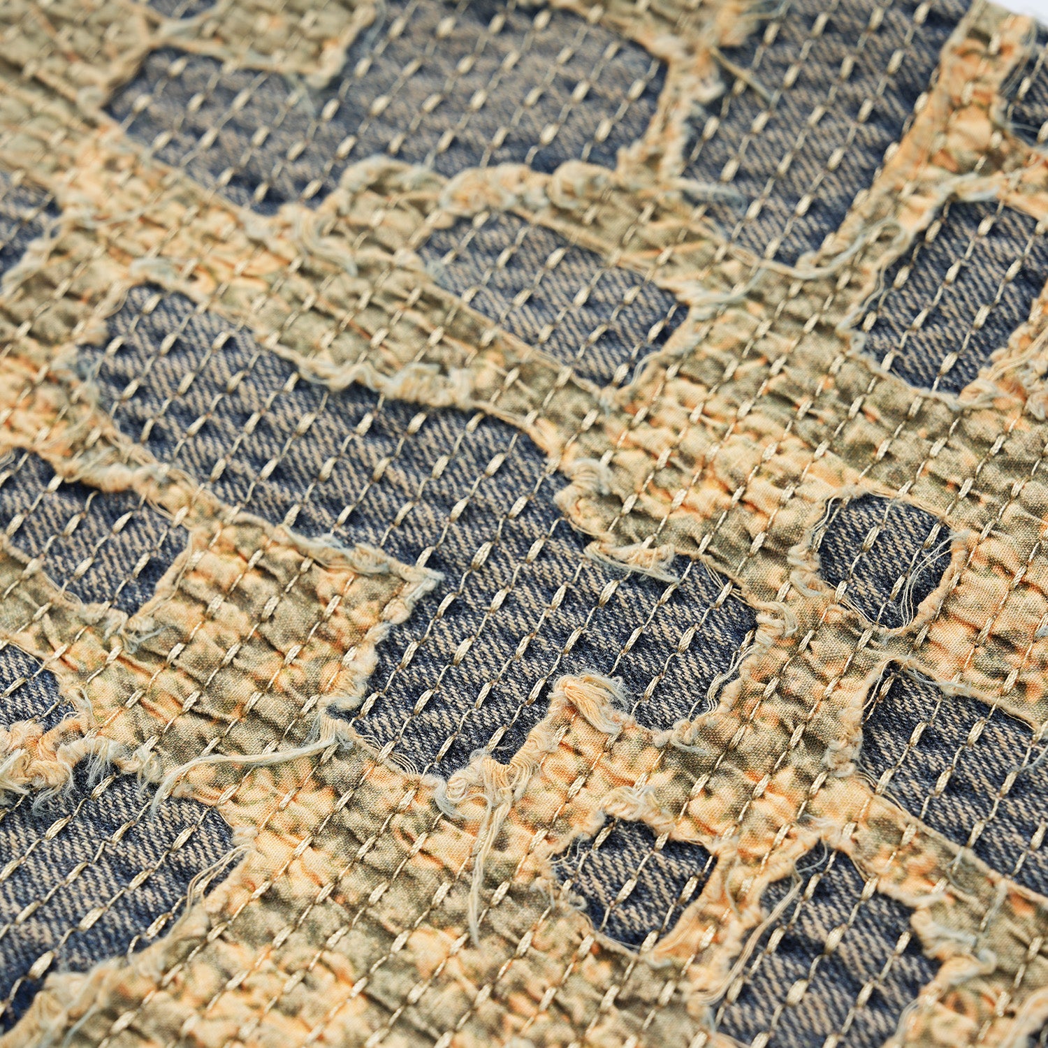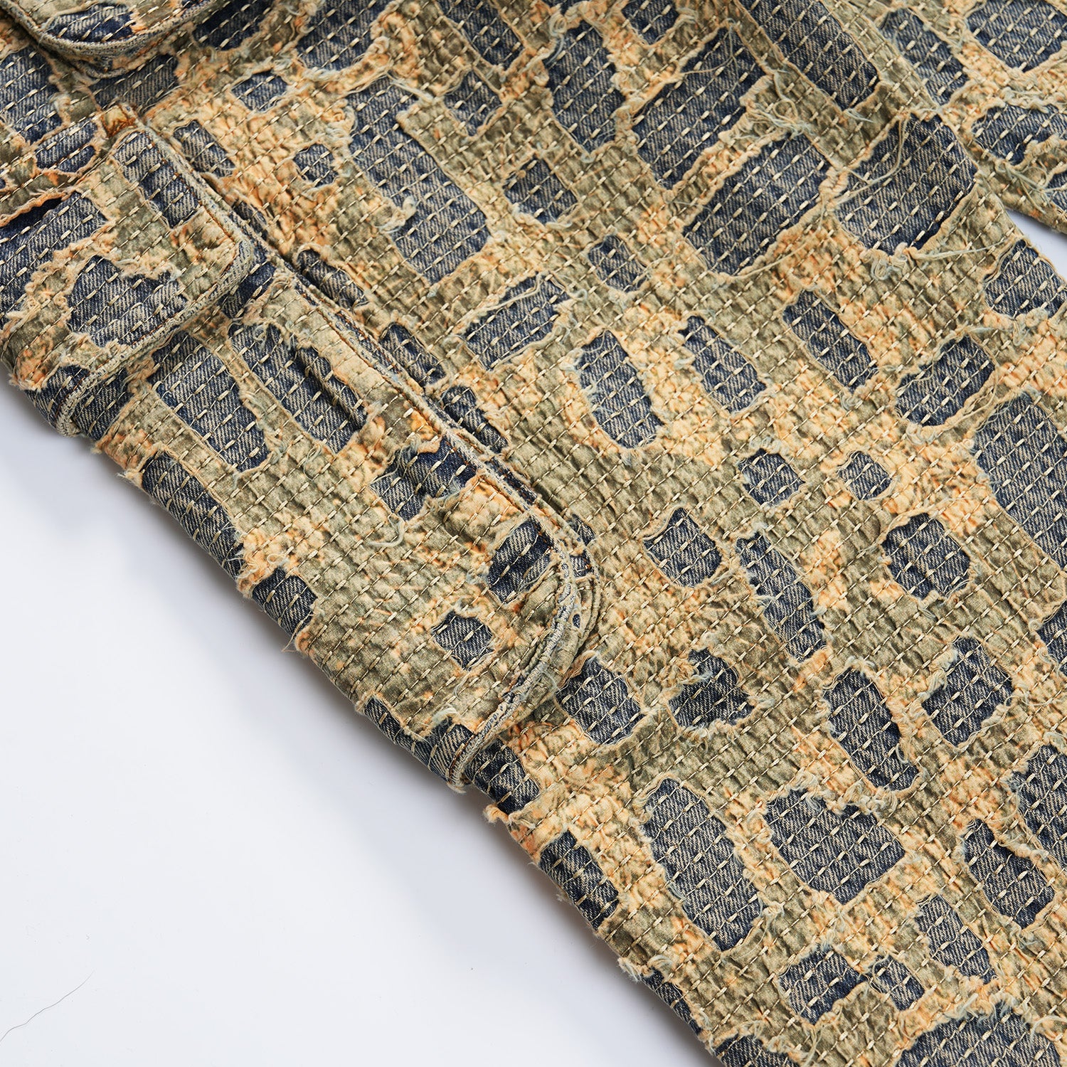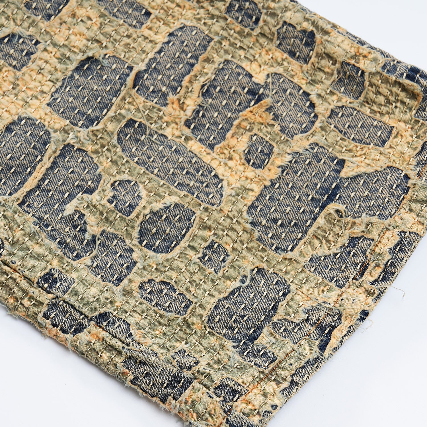 Designed by Raf Reyes: these pants embodies boro, a traditional Japanese textile mending technique 🧵~ its design reflects the historical patchwork aesthetic, enhanced by sashiko stitching ⁽⁾ over 20 hours of threadwork and distressing give each panel a unique story, adding life and history [...].